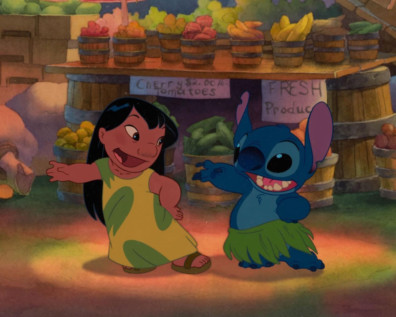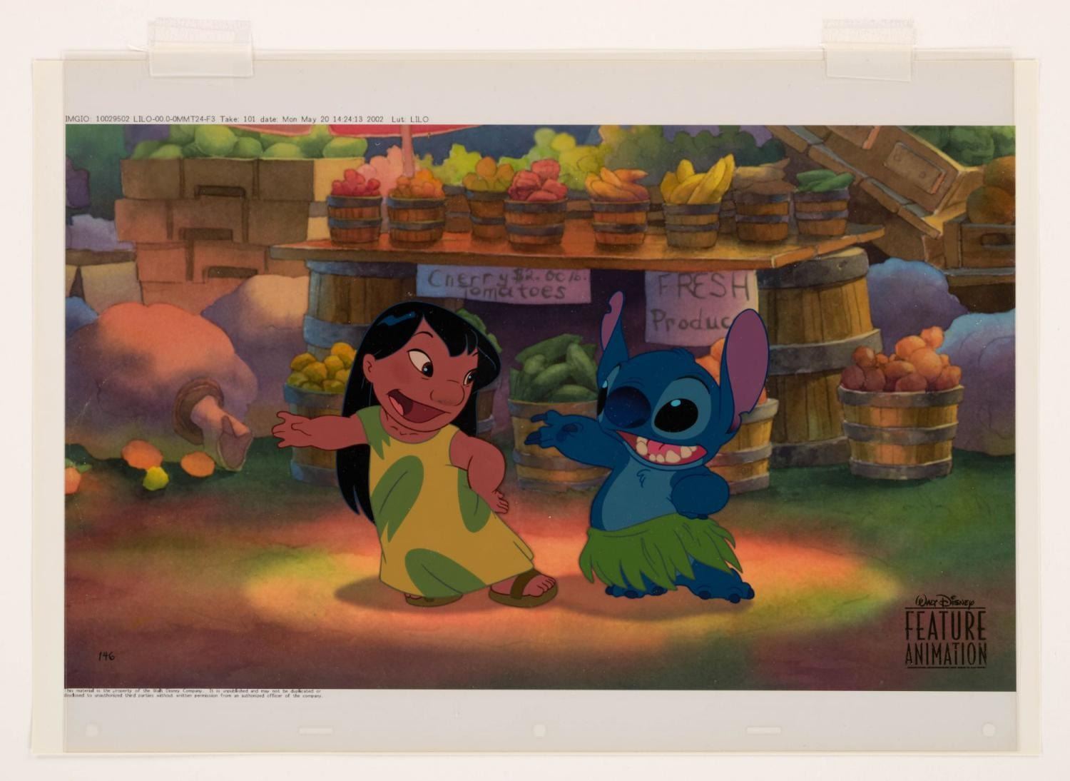 (Disney, 2002) A Feature Animation employee exclusive limited edition cel from "Lilo & Stitch." At the end of production, employees were given a choice from eight key scenes in the film to have a cel created in the Studio's Ink and Paint department using the film's original drawings. Since the animated features since 1991's "Beauty and the Beast" were produced with the digital CAPS process, not cels, this becomes a true rarity of a hand-painted cel from the Studio for a post-digital film. This cel recreating Sequence 12.7, Scene 48.5 of Lilo and Stitch was chosen by 184 employees, making this number 146/184. The cel has an image size of 5.5" x 9" on a 12.5" x 17" cel with a printed screen-matching background. The piece is in fine condition.