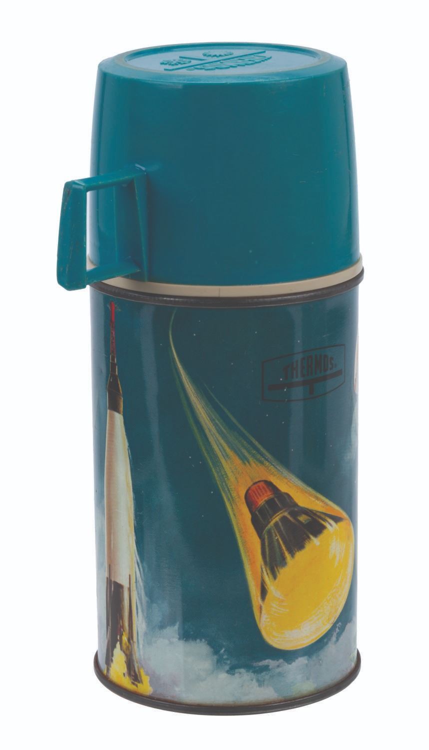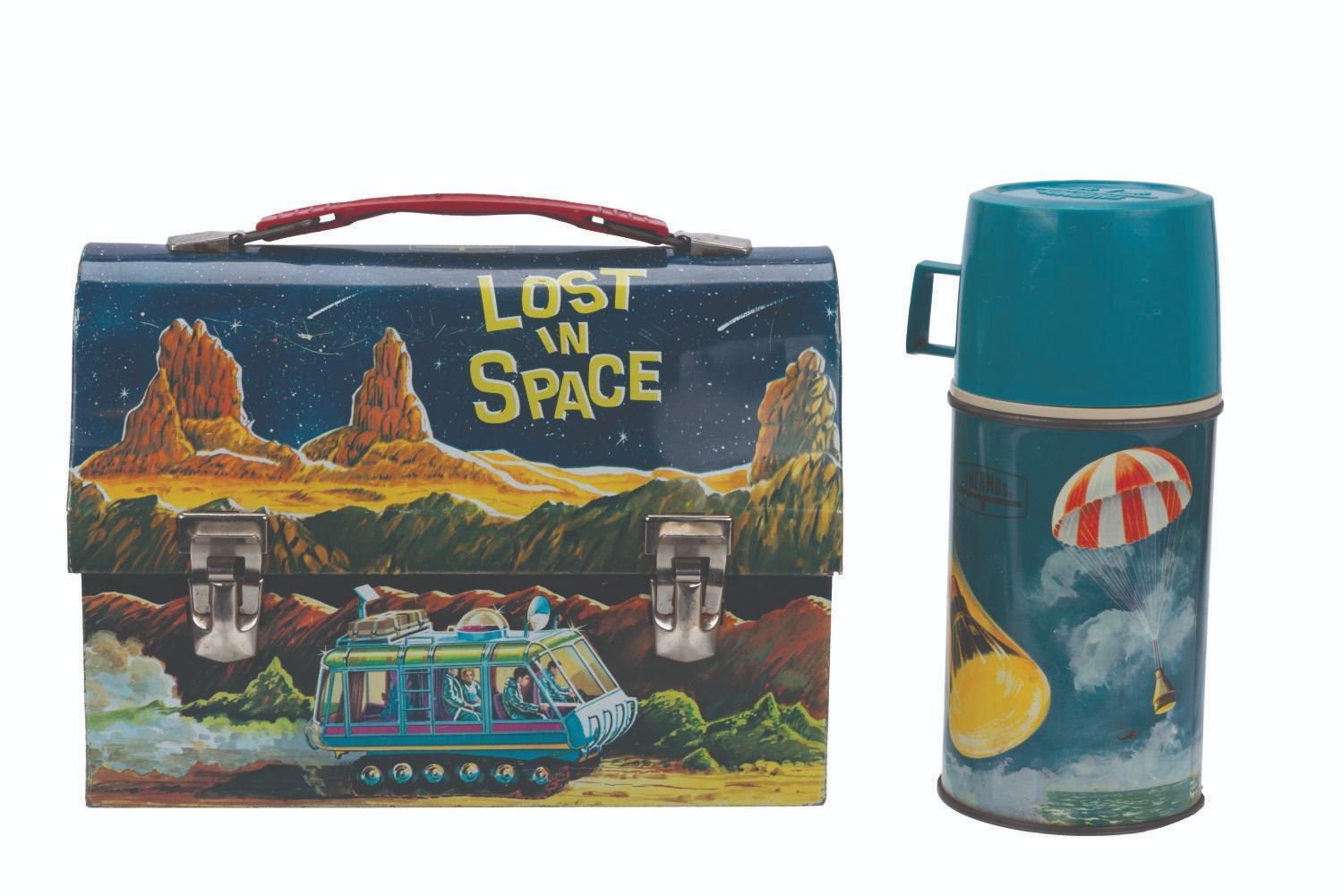 (Thermos, 1967) A "Lost in Space” tin lithograph lunchbox and Thermos, featuring colorful imagery inspired by the series. Measuring 8.75” x 4.25” x 6.5” x tall and 3.25” in diameter and 7.5” tall, the lunchbox and thermos are in good condition with scratches, scuffs, and wear.