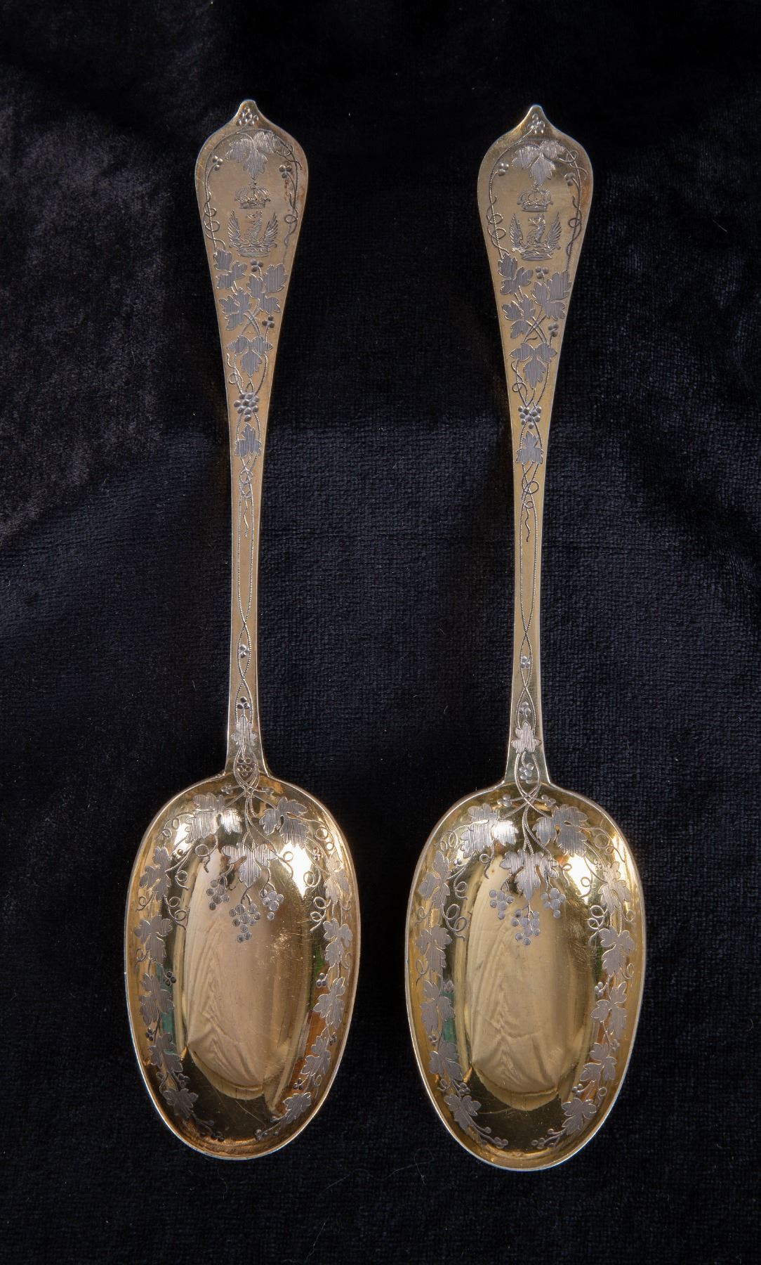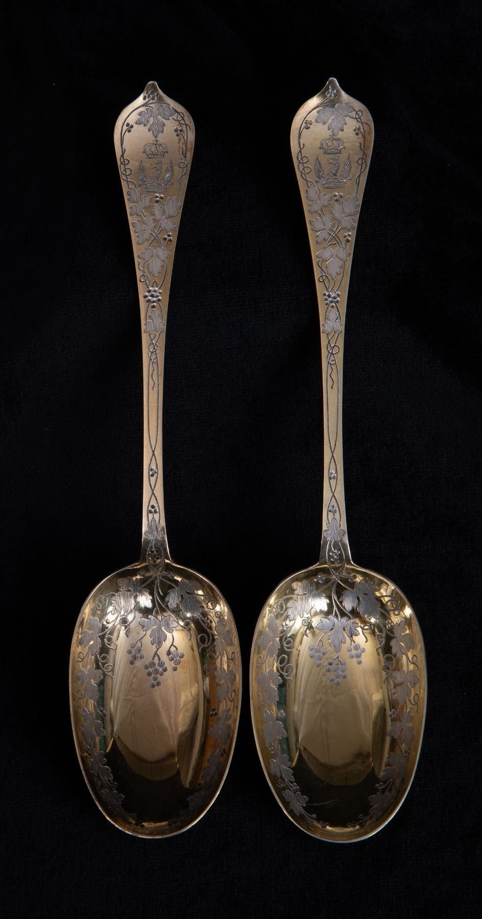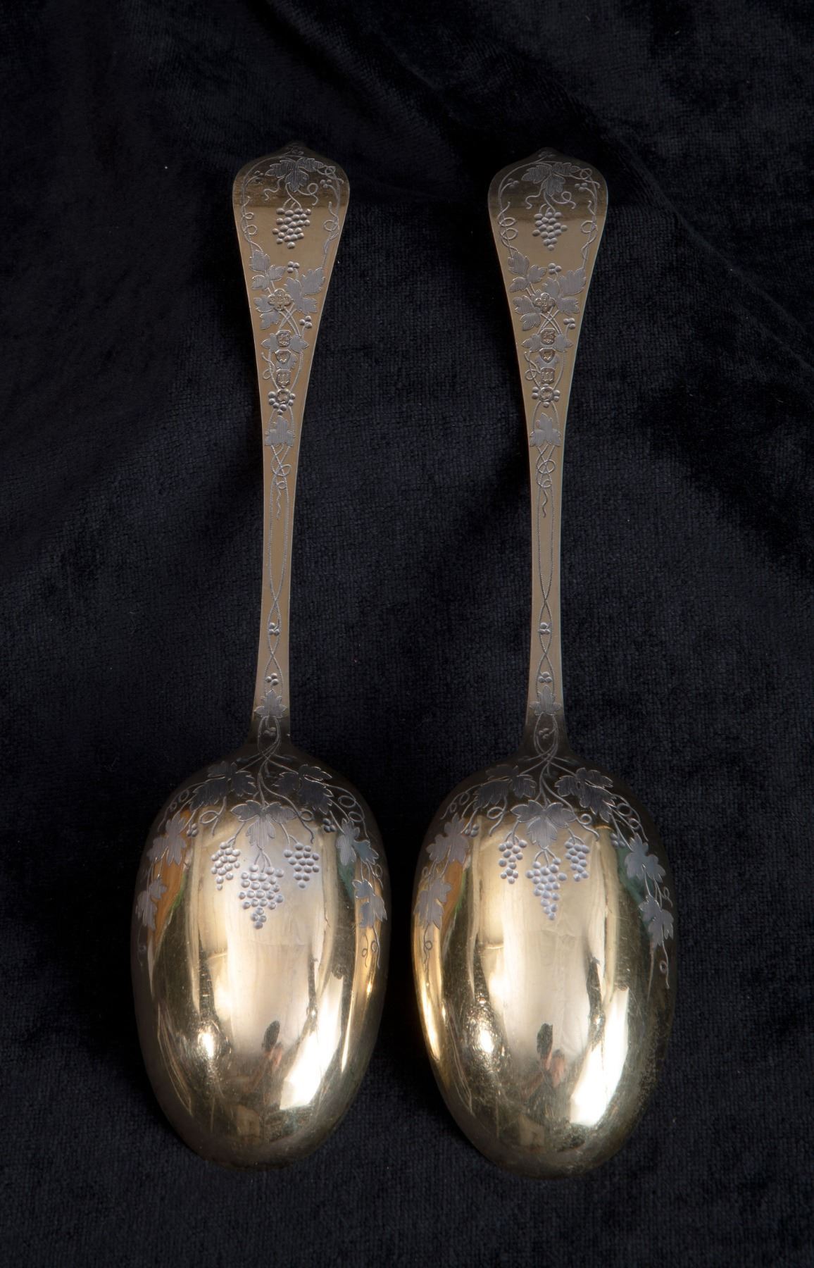 An impressive pair of gold-gilt Sterling Silver serving spoons by Barnard & Sons of London, hallmarked 1868. Measuring 23cm, with combined weight of 158 grams. With ornate grapevine engraving both front and back, and personalized crowned raven(?) arms at top of handles. A rather remarkable pair, which likely adorned a very formal aristrocratic dining table
