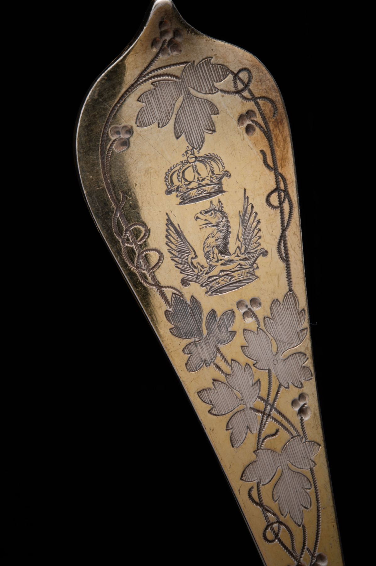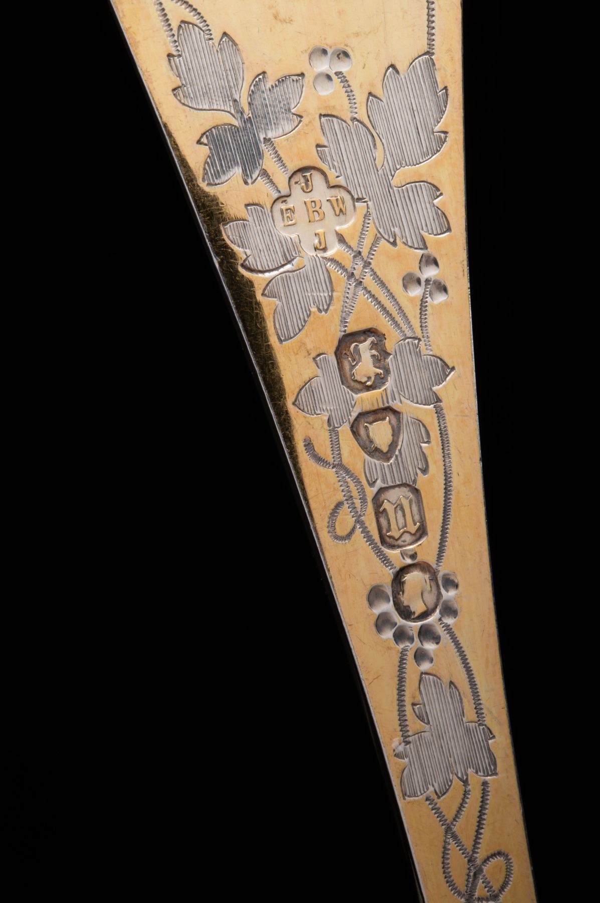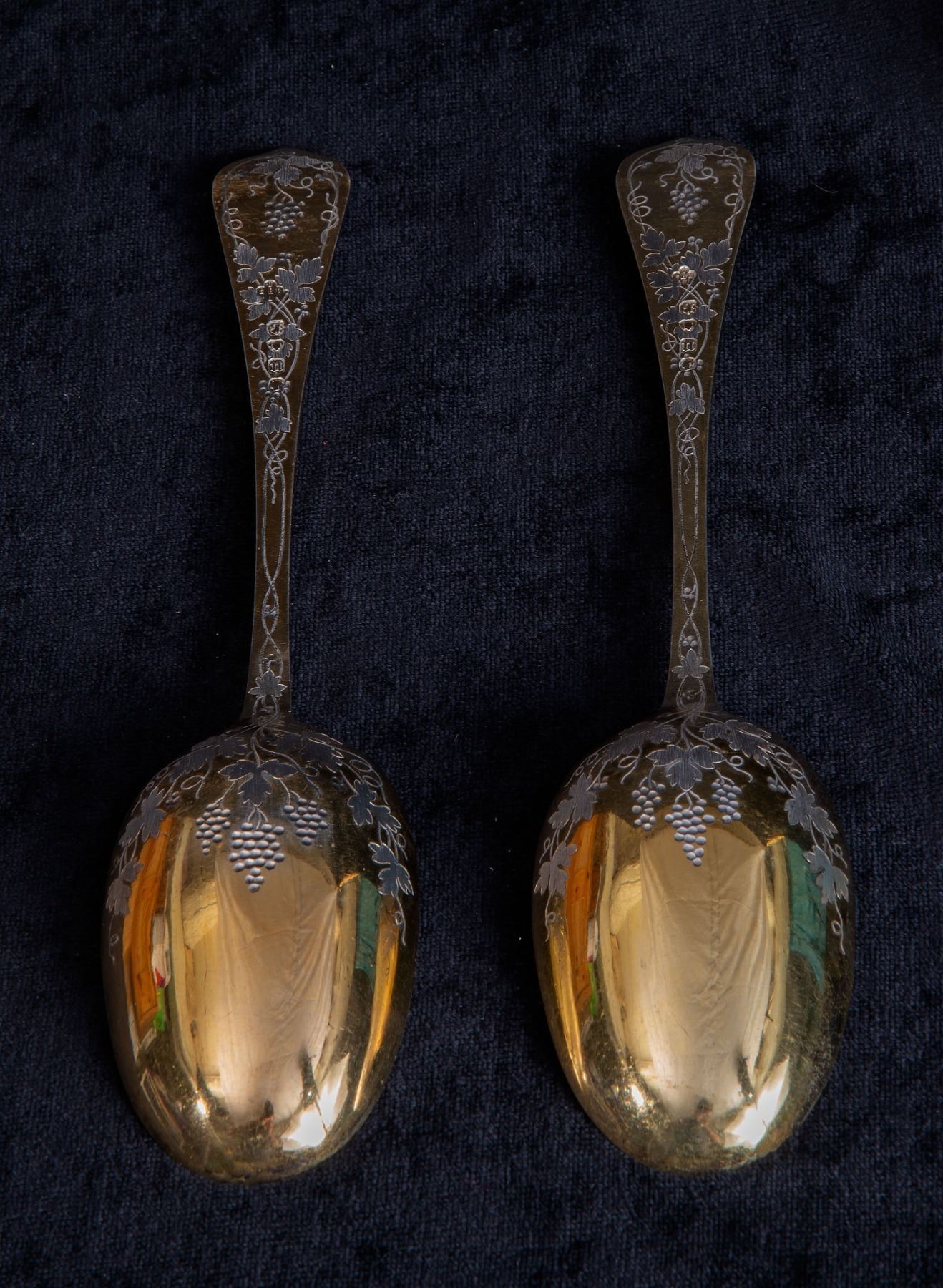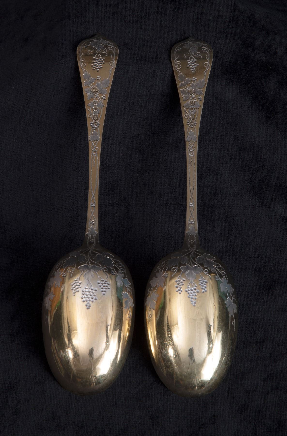 An impressive pair of gold-gilt Sterling Silver serving spoons by Barnard & Sons of London, hallmarked 1868. Measuring 23cm, with combined weight of 158 grams. With ornate grapevine engraving both front and back, and personalized crowned raven(?) arms at top of handles. A rather remarkable pair, which likely adorned a very formal aristrocratic dining table
