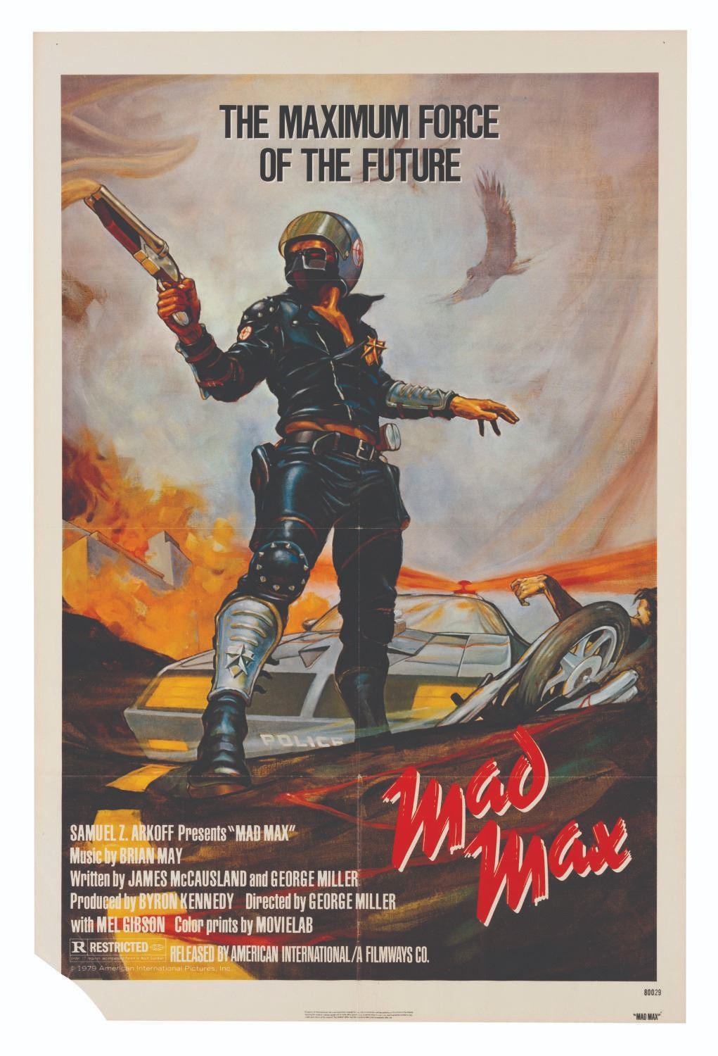 (American International Pictures, 1979) A one-sheet poster for the original theatrical release of George Miller’s "Mad Max.” Measuring 27” x 41” the poster displays in fair condition with typical wear and creases along the original folds, a 3” x 3.5” rip in the lower left corner, and light discoloration from age.