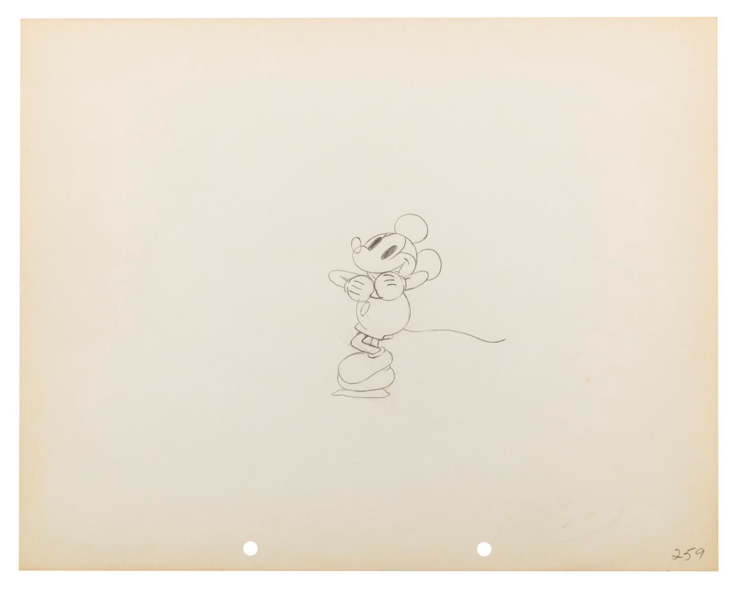 (Disney, 1931) An original production drawing of Mickey Mouse from "Around the World in 80 Minutes." The live-action Douglas Fairbanks travelogue featured a brief segment of Mickey Mouse animated by Walt Disney Productions during the Siam segment. Accomplished in graphite, Mickey has an image size of 3.25" x 3.25" on 9.5" x 12" paper. The drawing is in very good production-used condition with light edge wear and light discoloration from age.