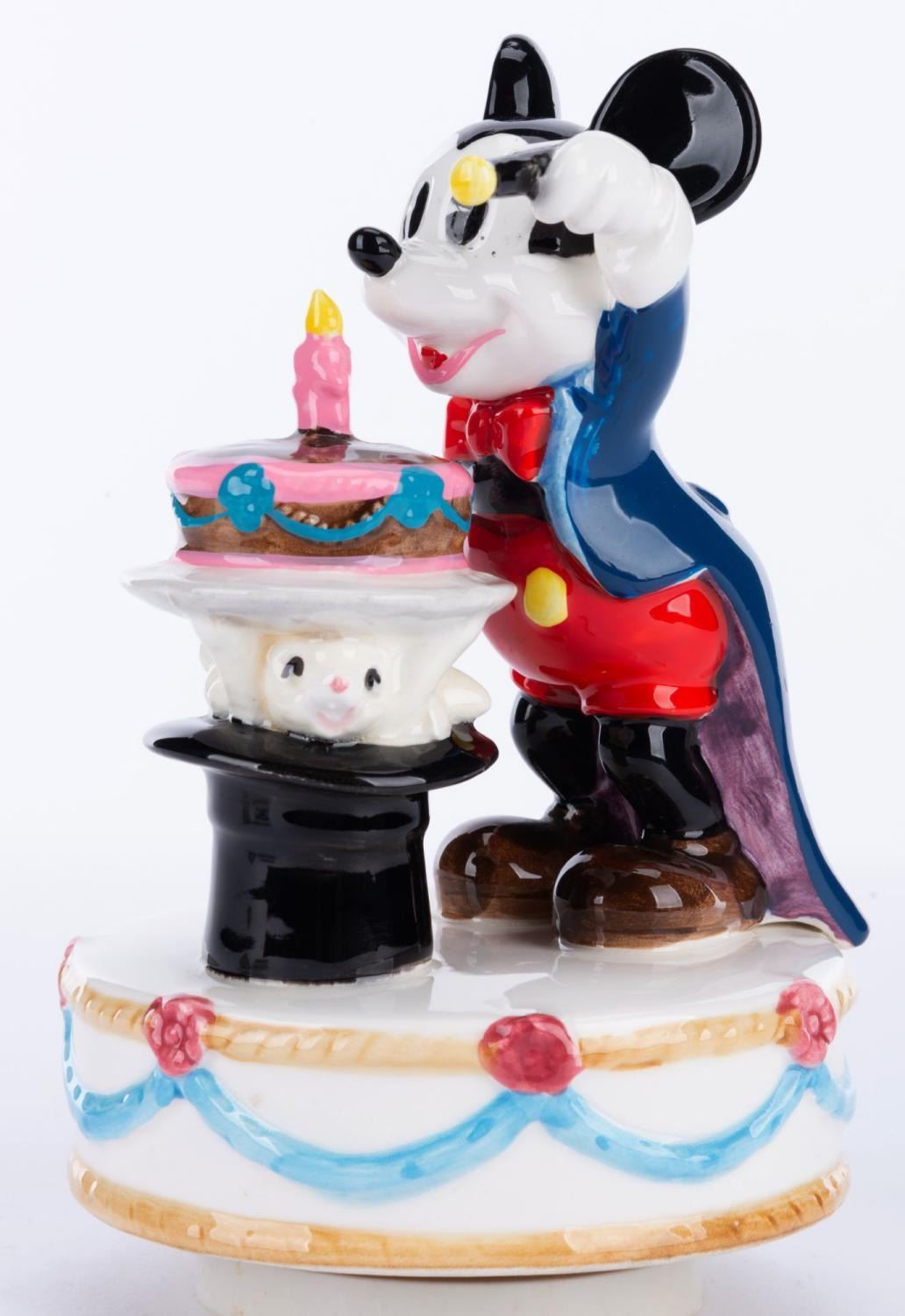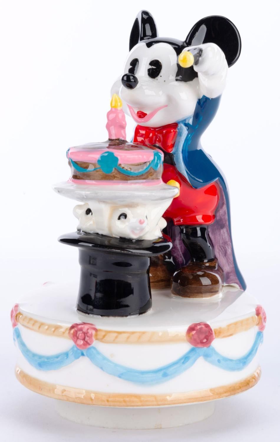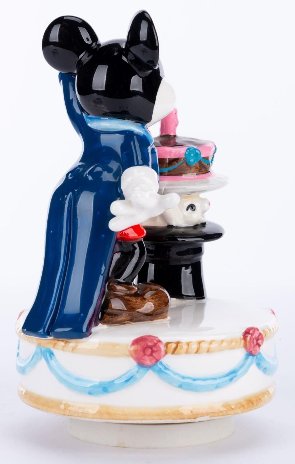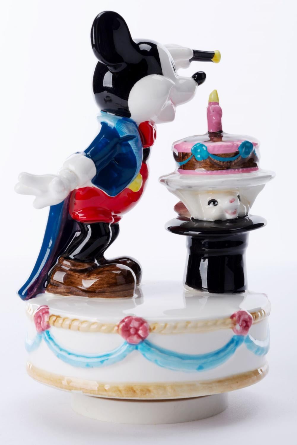 (Schmid, 1980) A figural music box of Mickey Mouse presenting a birthday cake. When wound, the figure spins in place and the box plays the Sherman Brothers classic "It's a Small World." Measuring 4.25" in diameter and 7" tall, the music box is in very good condition with minor paint wear and manufacturing imperfections.