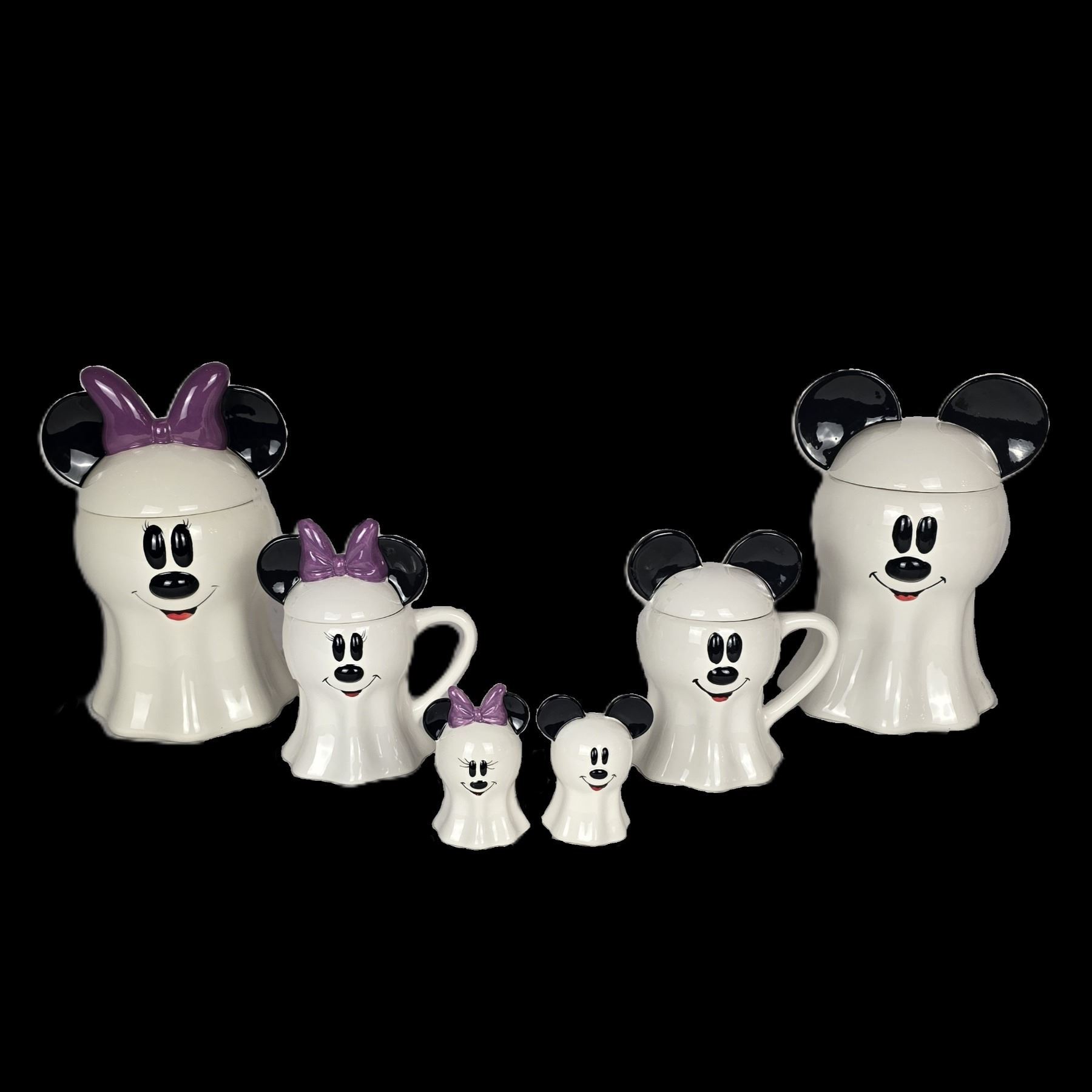 (Disney/Zrike Brands) This is a 10 piece porcelain Mickey and Minne Mouse set of kitchenalia featuring Mickey and Minnie as ghosts. It includes two 7” tall canisters with 3” toppers, two 4.5” mugs with toppers and a set of matching salt and pepper shakers. They were previously used as display only and are in like new condition. Total space occupied is 14.5” x 12” x 10.5” and the total weight is 6 lbs.