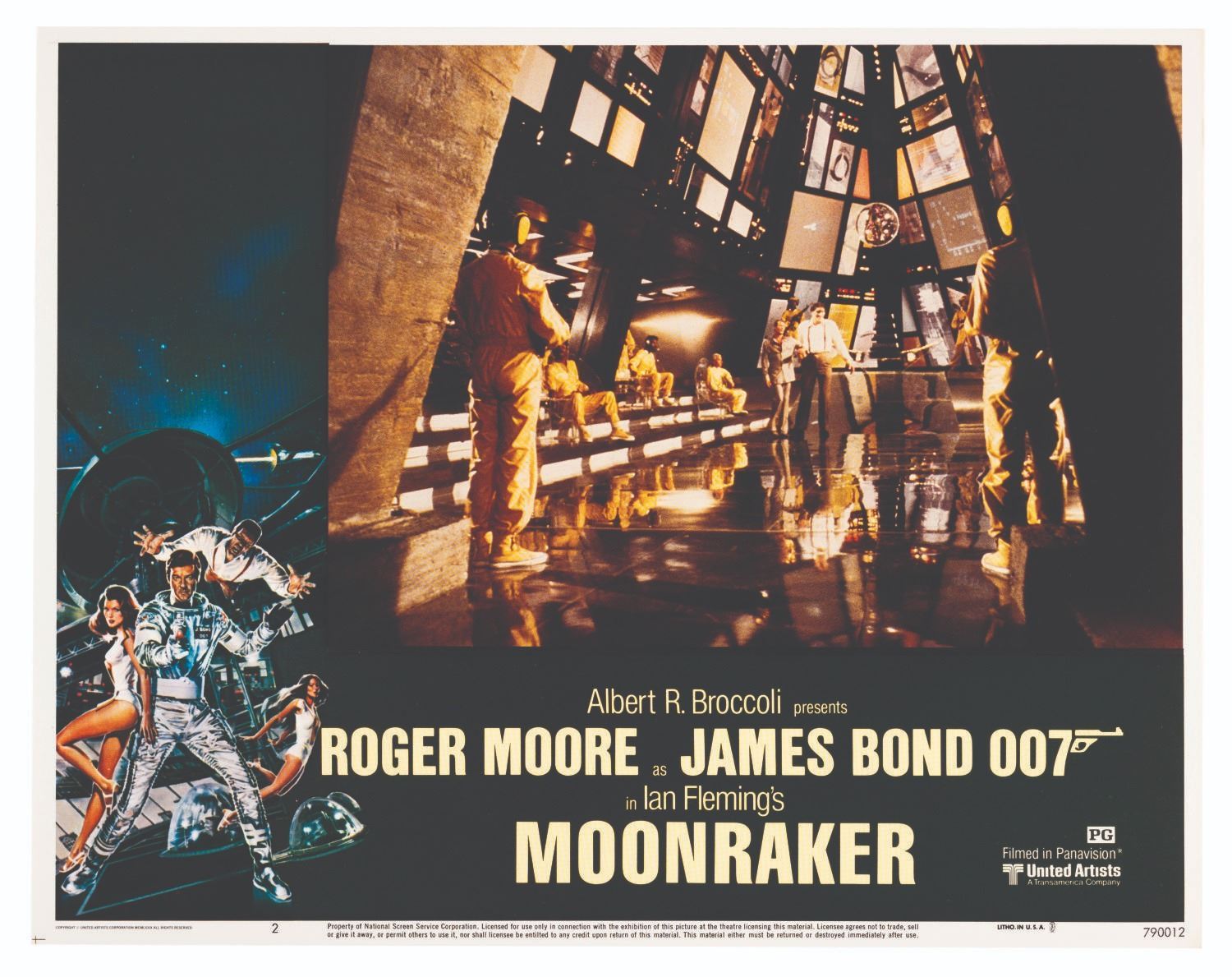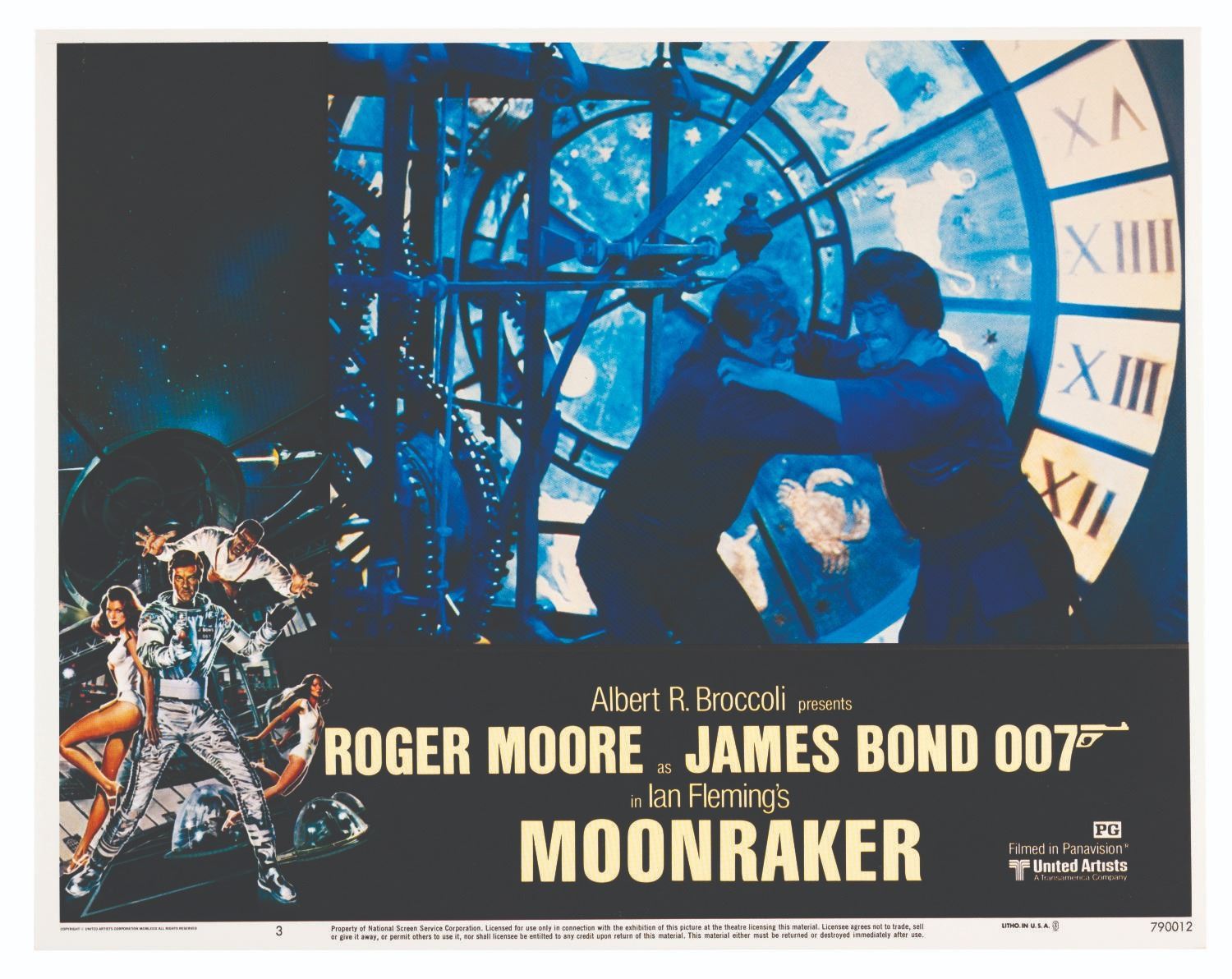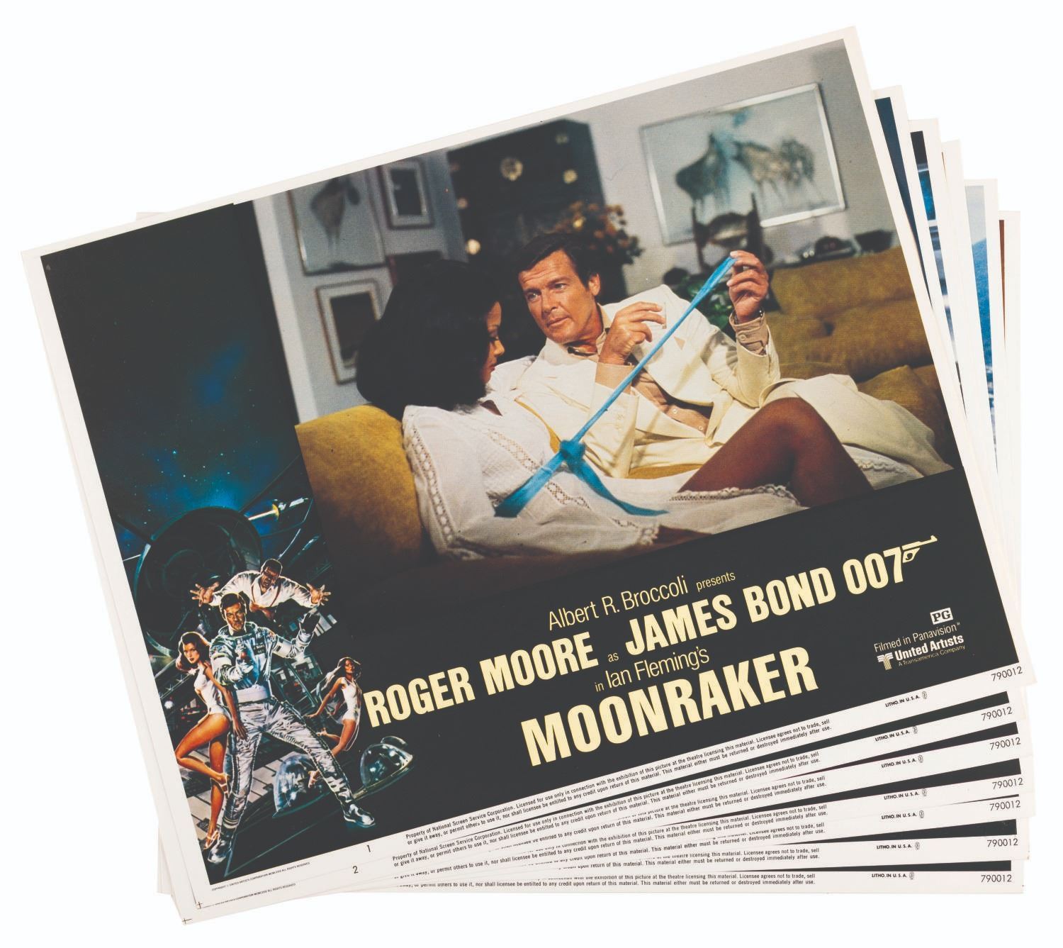 (United Artists, 1979) A collection of eight lobby cards for "Moonraker.” The space-themed film starring Roger Moore as James Bond was the franchise’s answer to the success of "Star Wars.” Measuring 8.25” x 11.75” each, the lithographically printed lobby cards are in very good condition with light scratches and edge wear.