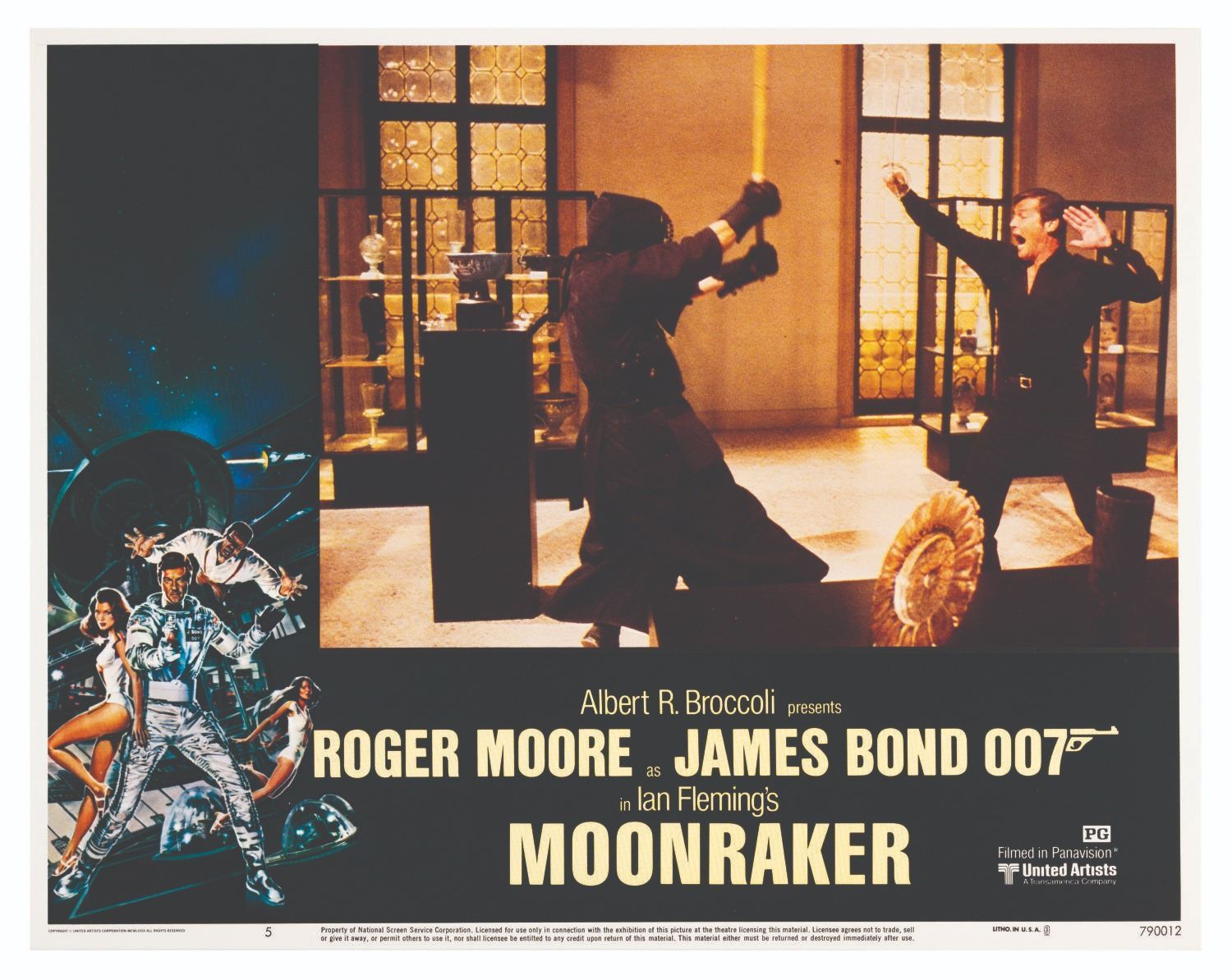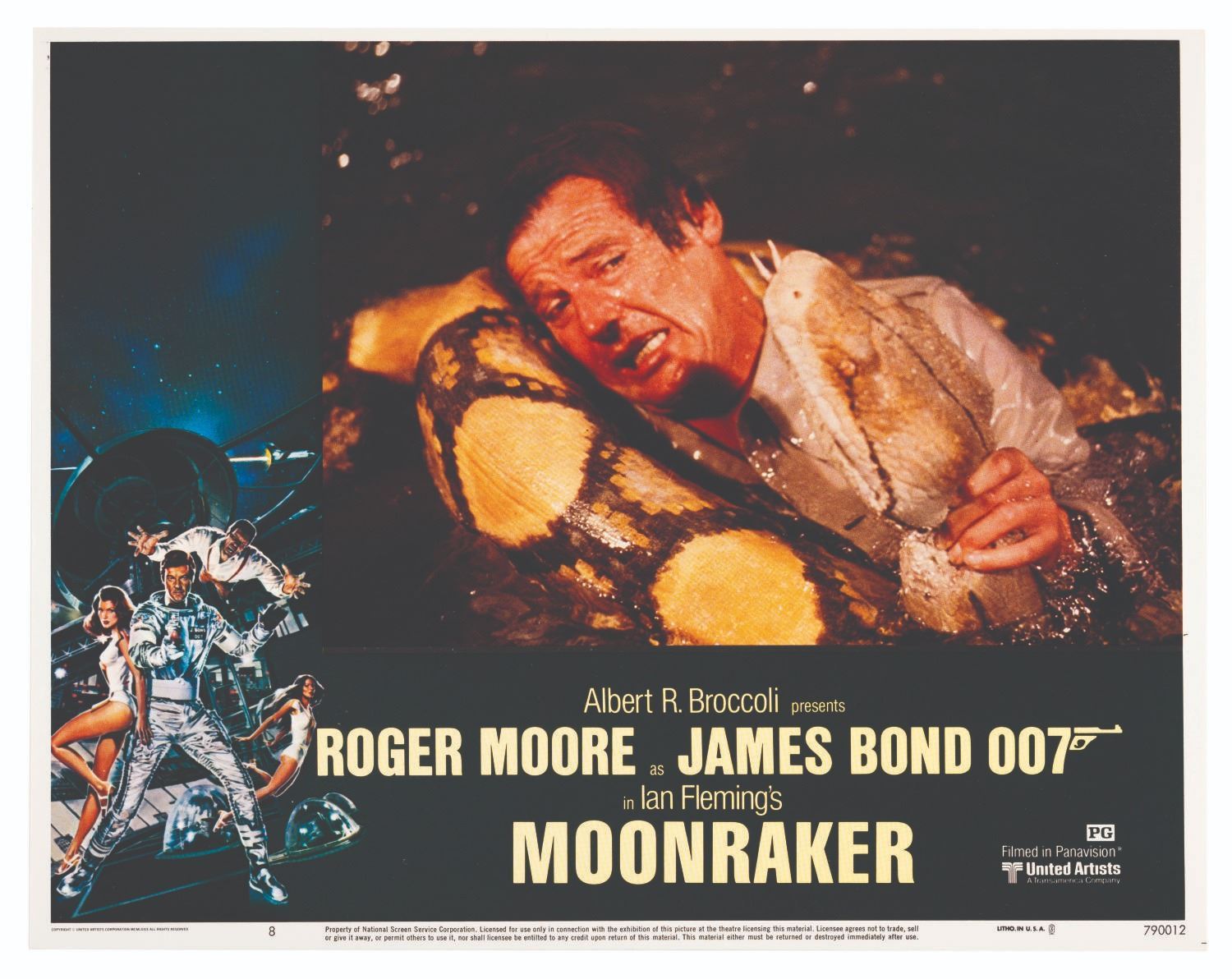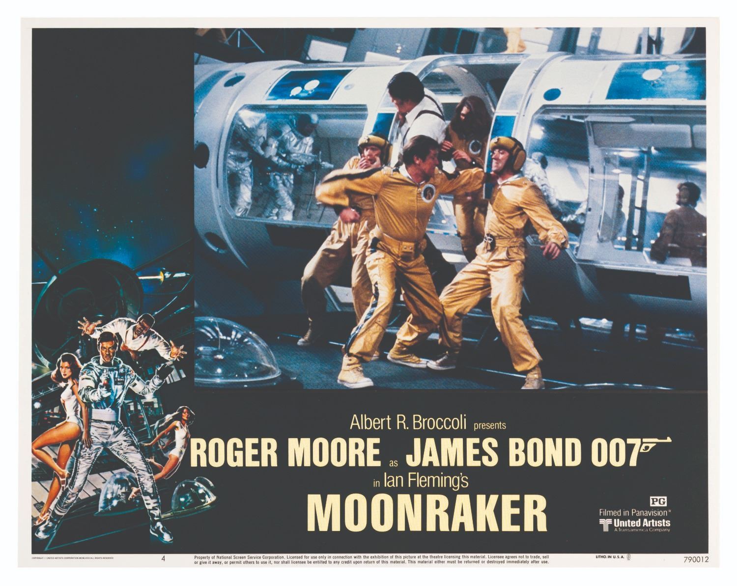 (United Artists, 1979) A collection of eight lobby cards for "Moonraker.” The space-themed film starring Roger Moore as James Bond was the franchise’s answer to the success of "Star Wars.” Measuring 8.25” x 11.75” each, the lithographically printed lobby cards are in very good condition with light scratches and edge wear.