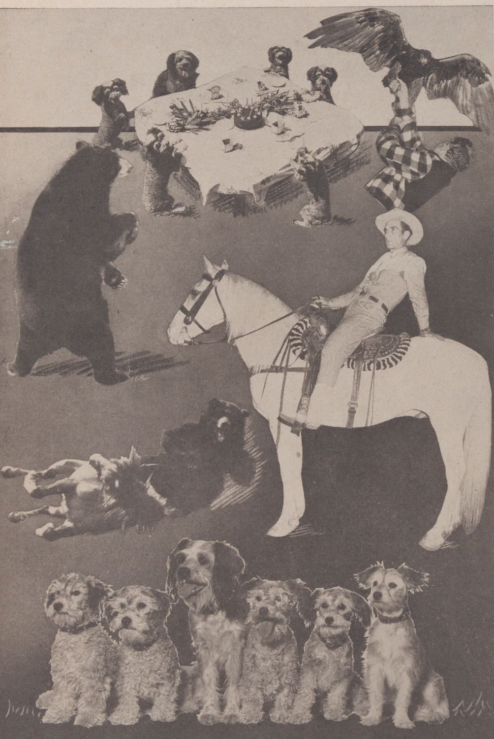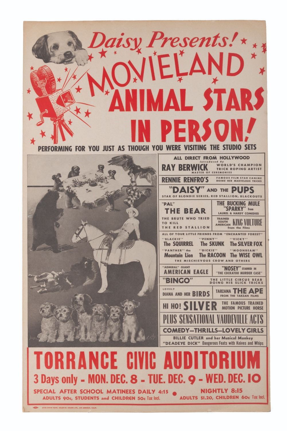 (1940s-50s) A poster for a Movieland Animal Stars in Person! three-day event held in Torrance, CA. Presented by Daisy, the dog actor from the "Blondie” series, the show featured live animals from Hollywood productions, vaudeville acts, and trick rope artist Ray Berwick as Master of Ceremonies. Measuring 14” x 22.5”, the poster is in very good condition with light creases, wear, and discoloration from age.