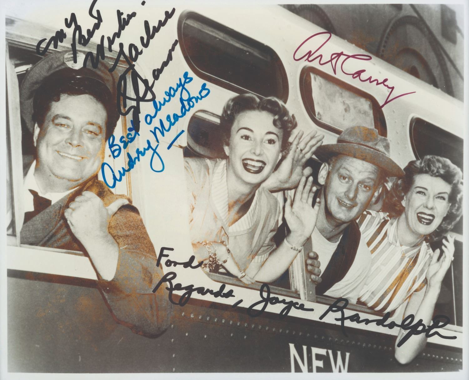 (CBS, 1950s/1960s-80s) A black and white "The Honeymooners” photo signed by stars Jackie Gleason, Audrey Meadows, Art Carney, and Joyce Randolph. Measuring 8” x 10” in a 15” x 18” framed matte, the photo is in good condition, with scratches, heavy toning, wear, and scuffs to the frame.