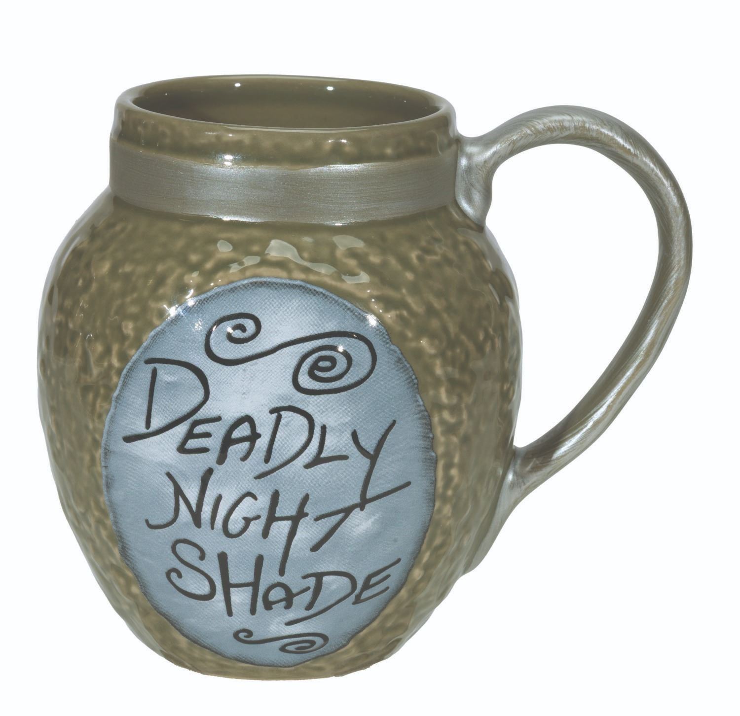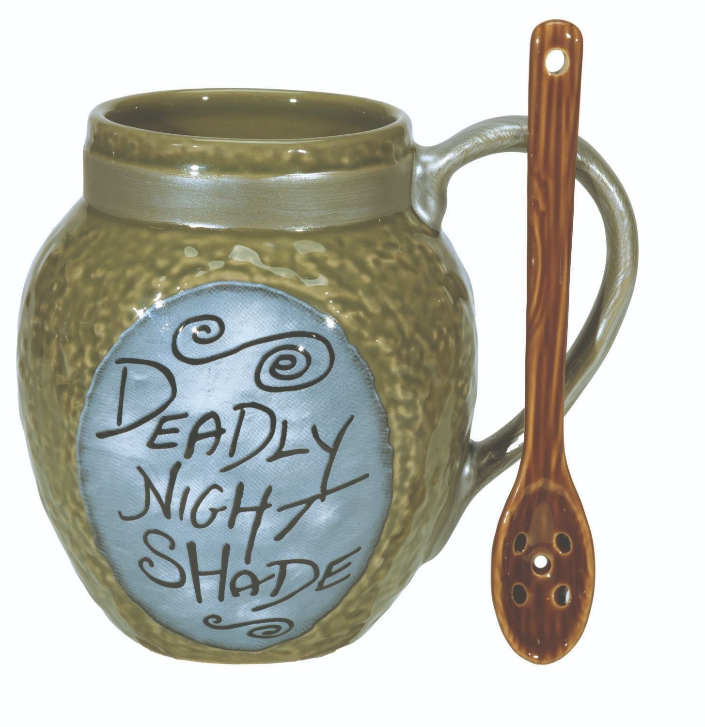 (Disney, 2020s) A Deadly Night Shade ceramic mug and spoon, styled after the jar used by Sally in "Tim Burton's The Nightmare Before Christmas." Measuring 4.75" tall and 4" in diameter, the mug and the 5.5" long ceramic spoon are in fine condition.
