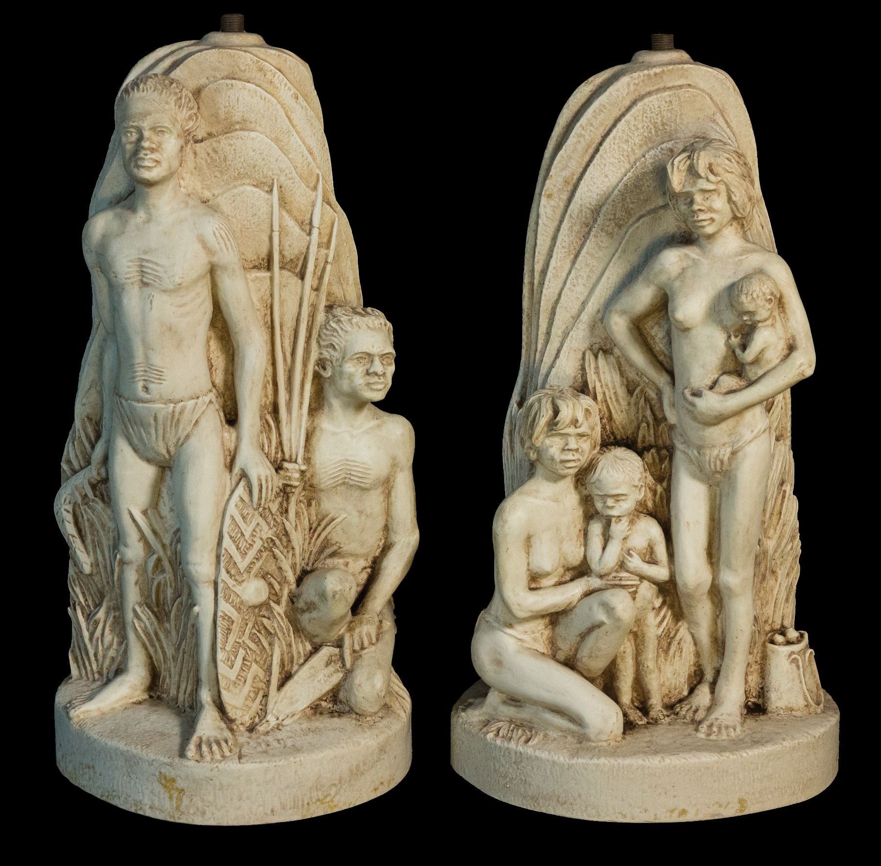 (1960s) Bob and LeRoy imported these prototype lamps for possible production but eventually passed on them. A version of these were eventually imported in brown, rock grey and black by other importers. Here is a pair of lamps representing a Maori family. These are not wired but easily can be and affixed with a tropical shade. 12"x6"x5.5", 11.5"x6"x5.5". VG+ with typical wear.