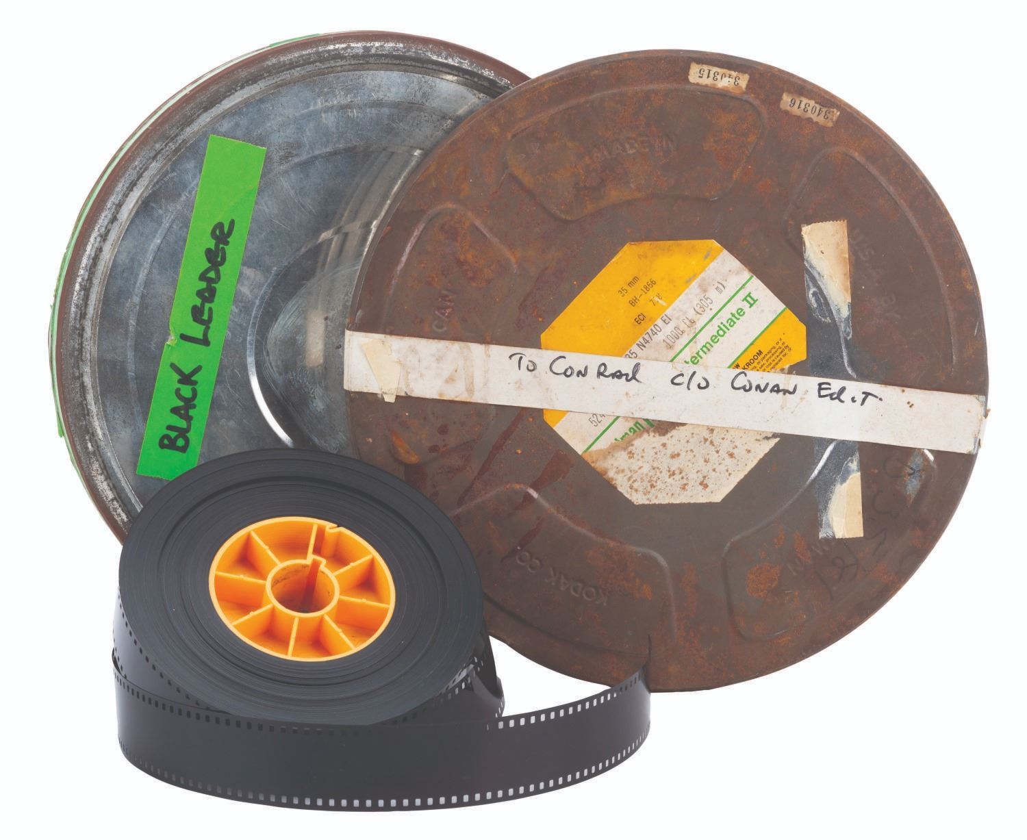 (Universal, 1982) A pair of 35mm film cans used in the production of "Conan the Barbarian” starring Arnold Schwarzenegger. One can bears a handwritten note on tape reading "To Conrad c/o Conan Edit”, referring to Conrad Gonzalez, the Supervising Assistant Film Editor on the production. The other labeled "black leader” contains a 3” film core with another 3” roll of black leader, essentially blank film used for spacing in the editorial process. Each measuring 10.75” in diameter x 1.75” thick, the steel cans display in fair condition, with heavy wear typical of production use, and heavy surface oxidation from age.