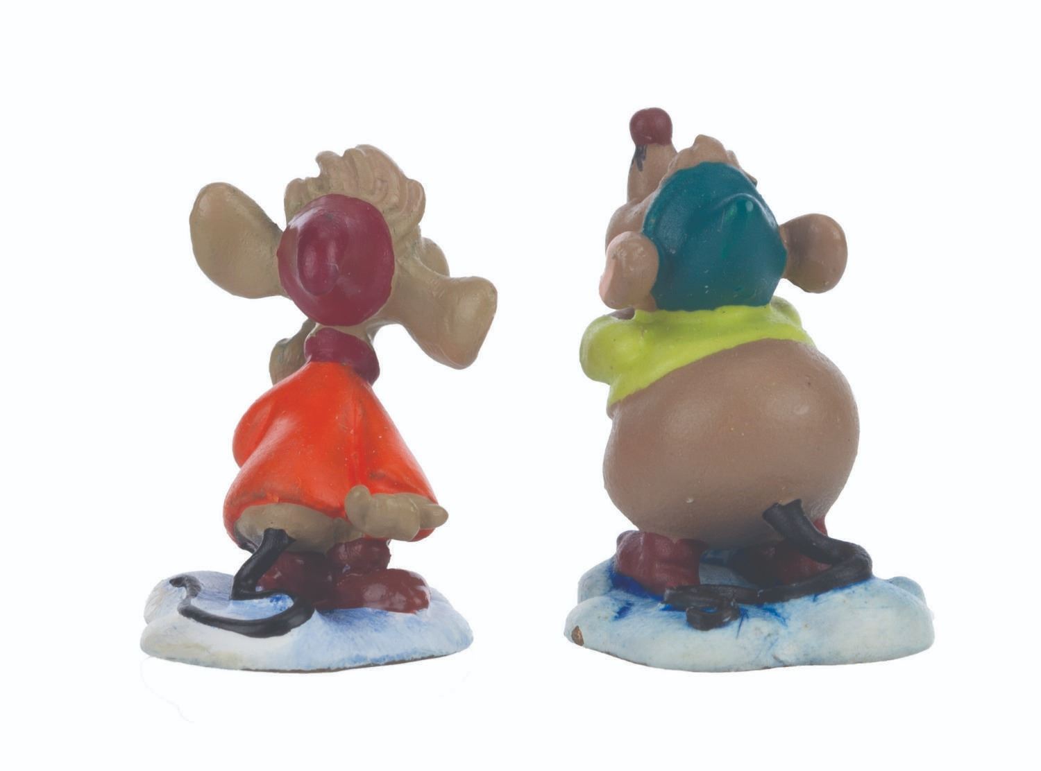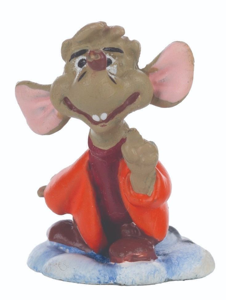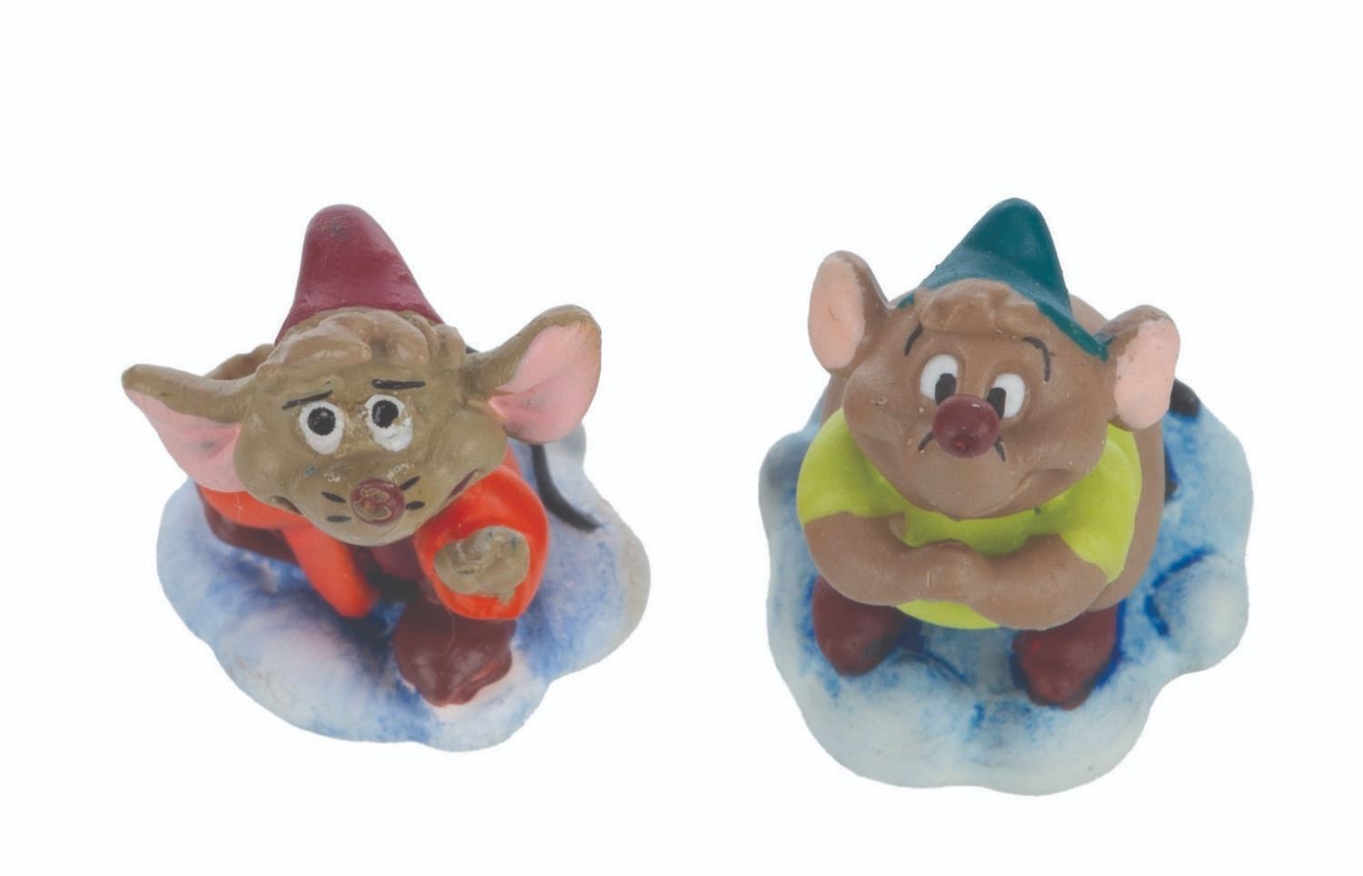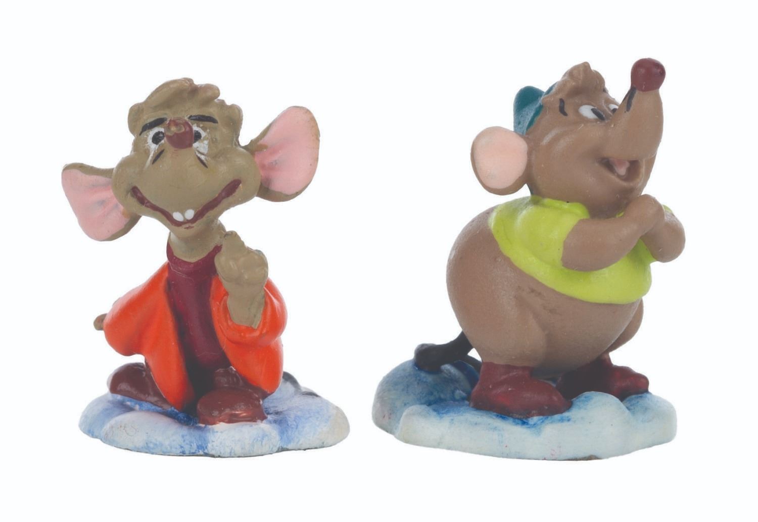(WDCC, 1997) A pair of Walt Disney Classic Collection figurines of Gus and Jaq from "Cinderella" released as part of the Enchanted Places series. Measuring 0.75" tall each, the hand-painted bronze figurines are in fine condition and come with the original 2.75" x 2.25" x 2" tall boxes in good condition with wear.