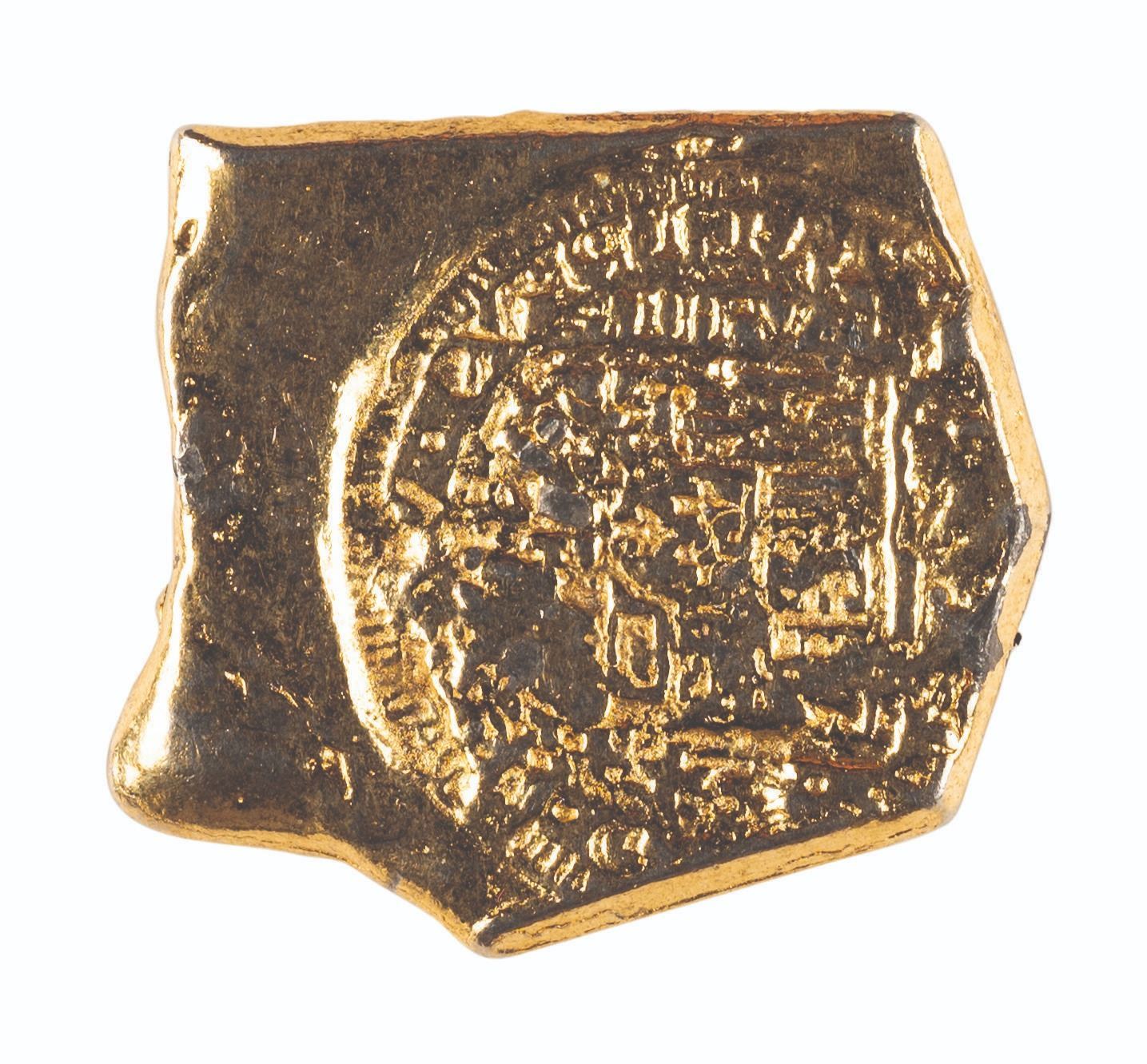 (Warner Bros., 1985) A pair of production-used One-Eyed Willy treasure props from "The Goonies.” Measuring 7.5” in length, the plastic necklace and the 1.25” x 1.25” gold piece are in very good condition with light scuffs and paint chips from production use.