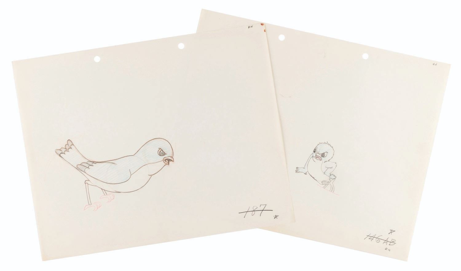 (Schlesinger, 1940) A pair of original production drawings of a mother and baby bird from the Merrie Melodies short "Wacky Wildlife.” With character sizes of 3.5” x 5.5” and 2” x 2.25” on 9.5” x 12” animation paper, the graphite and color pencil drawings are in very good condition with a minor stain to the top right corner of one, light smudges, minor creasing from age, and very light discoloration to the bottom edge of one.