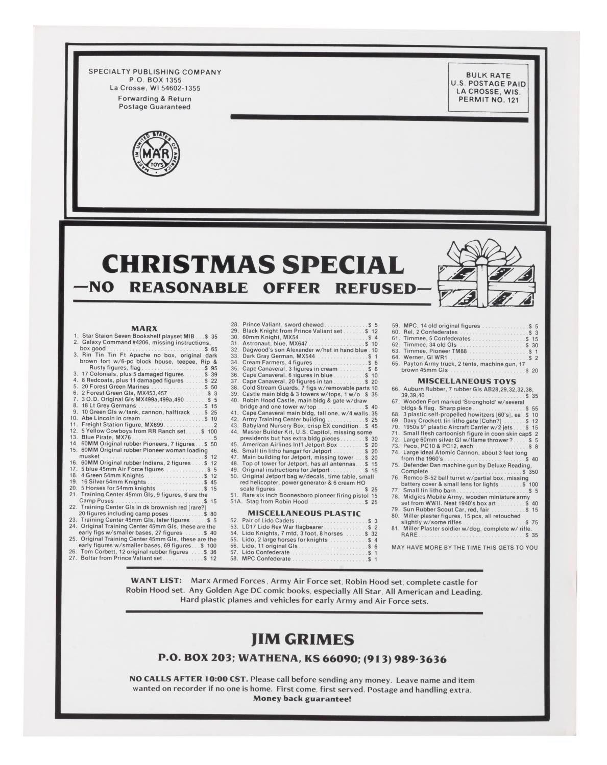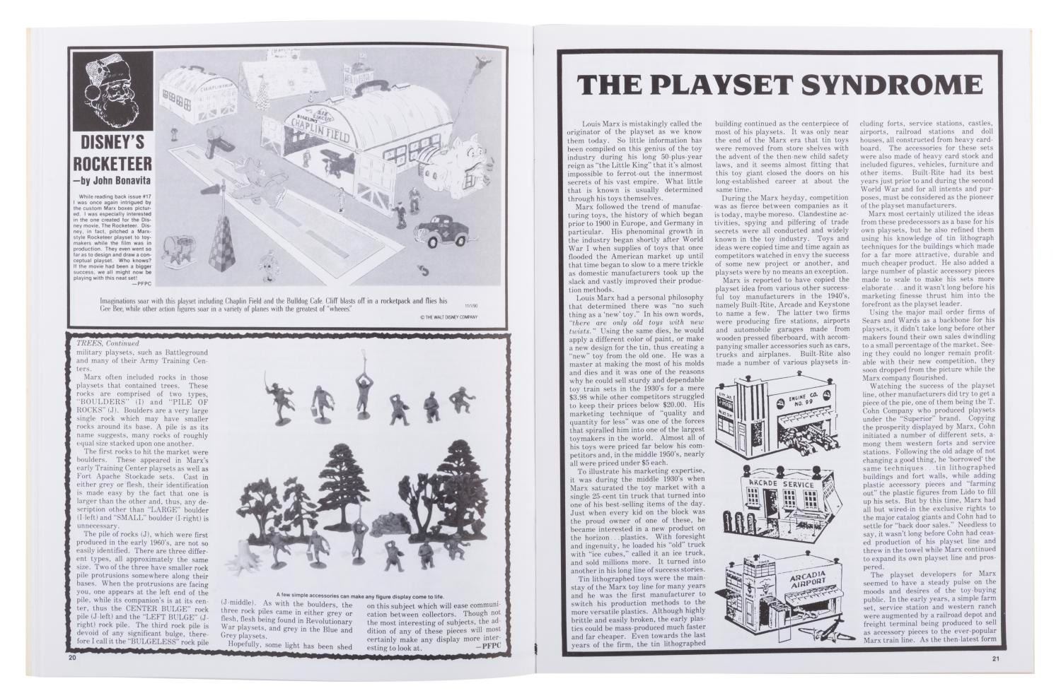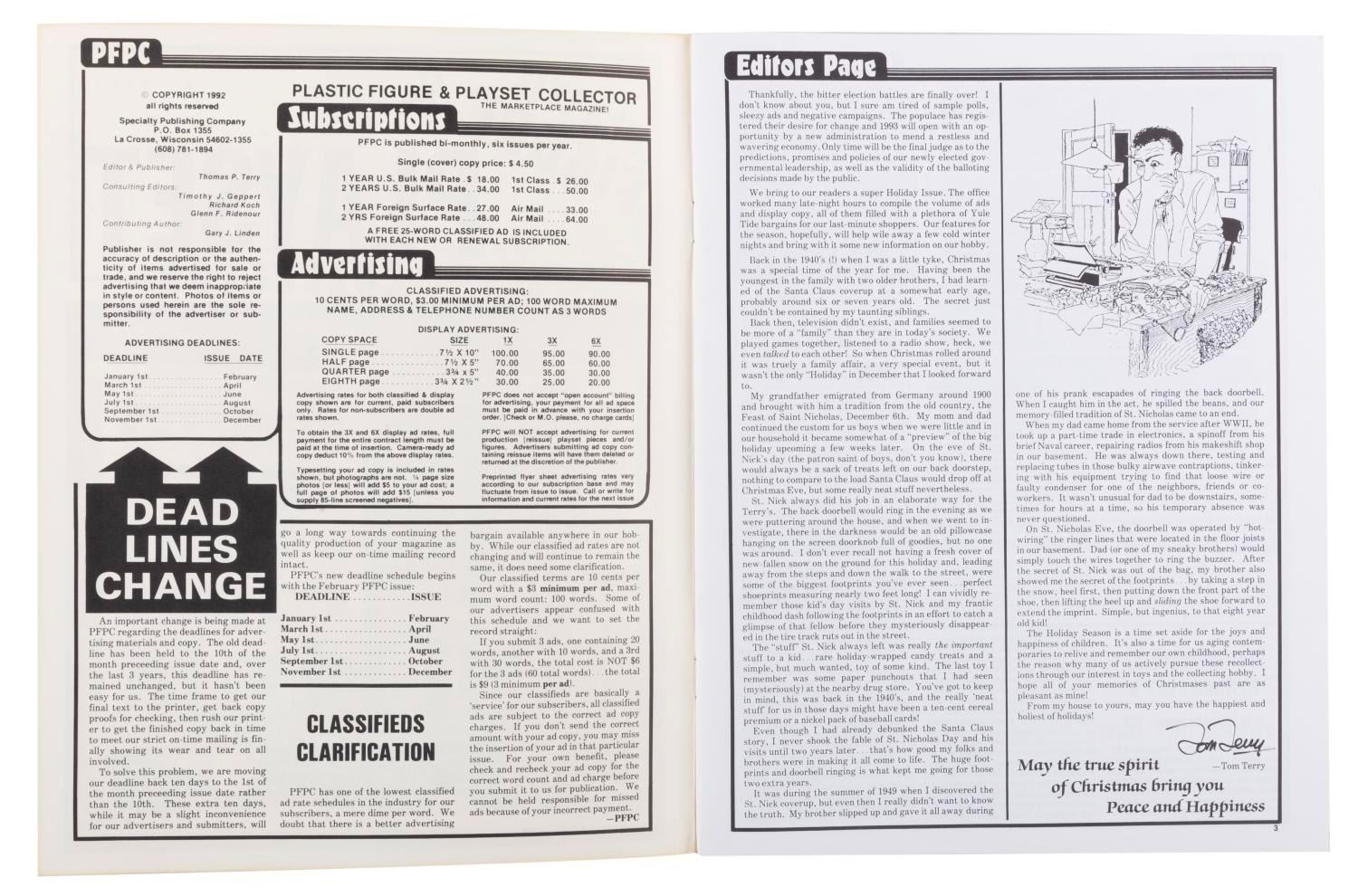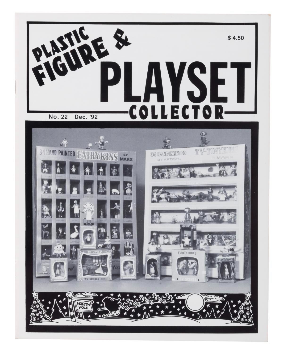 (Specialty Publishing, 1992) Issue number 22 from December 1992 of Plastic Figure & Playset Collector magazine. Inside the black and white magazine is information on TV Tinykins, a photo of Fess Parker signing Davy Crockett merchandise, and an illustration of a pitched Marx "The Rocketeer" playset that was never produced. Measuring 8.5" x 11", the magazine is in very good condition with light edge wear.