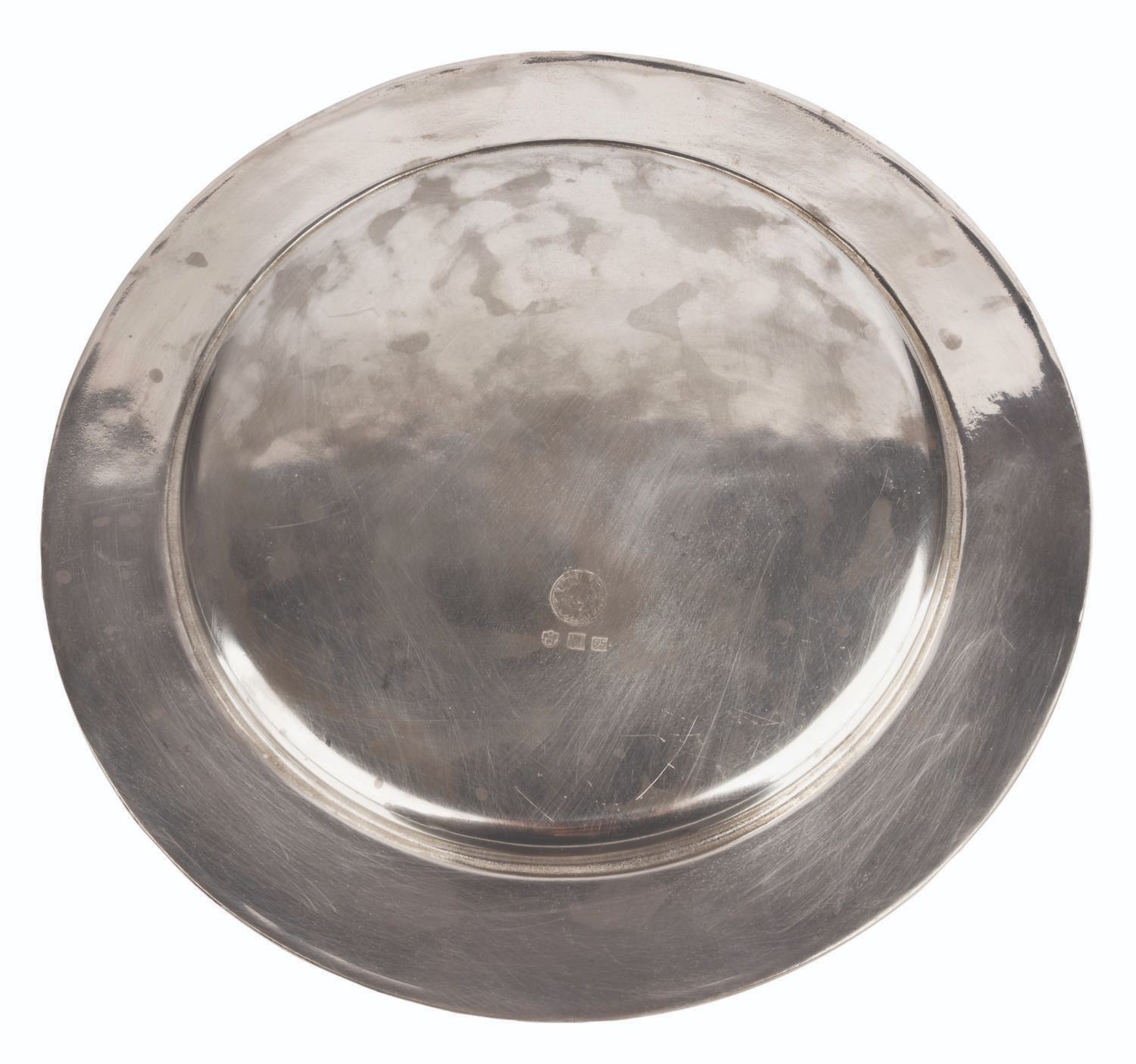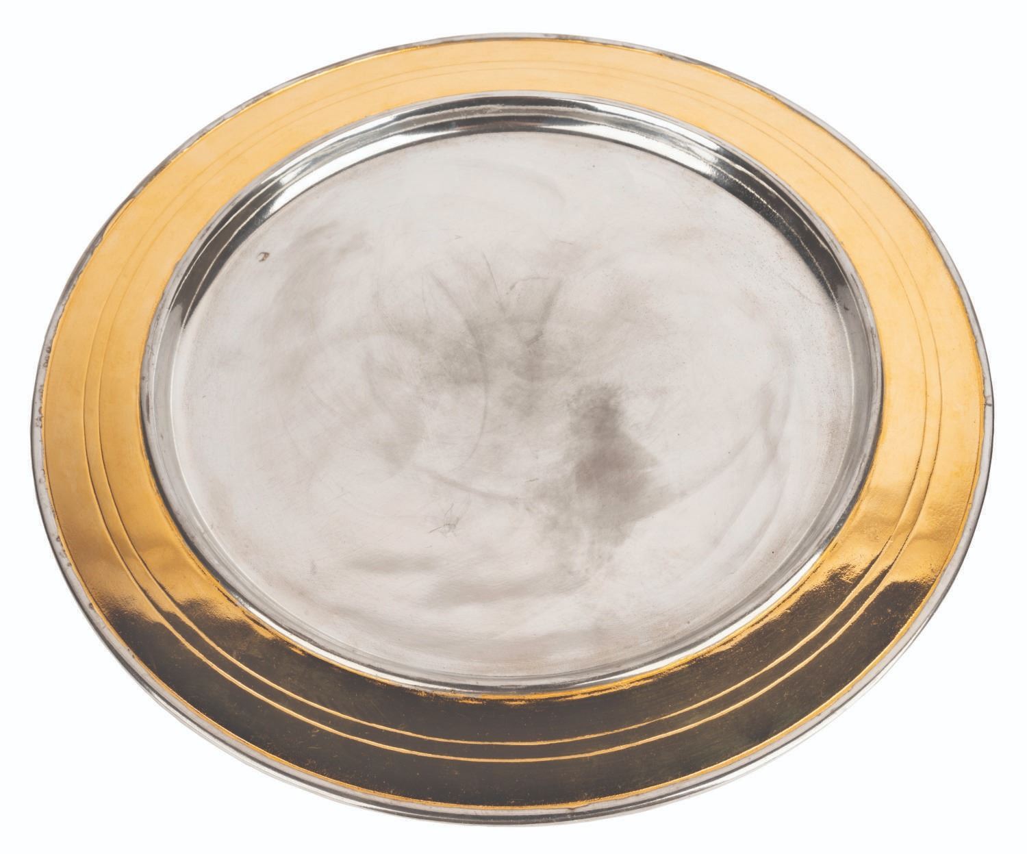 (Warner Bros., 2001-11) A prop dinner plate from the production of a Harry Potter series film, used in the Hogwarts Great Hall. Measuring 11.75” in diameter and 0.5” thick, the plate is in very good condition with light tarnish and wear from production use.
