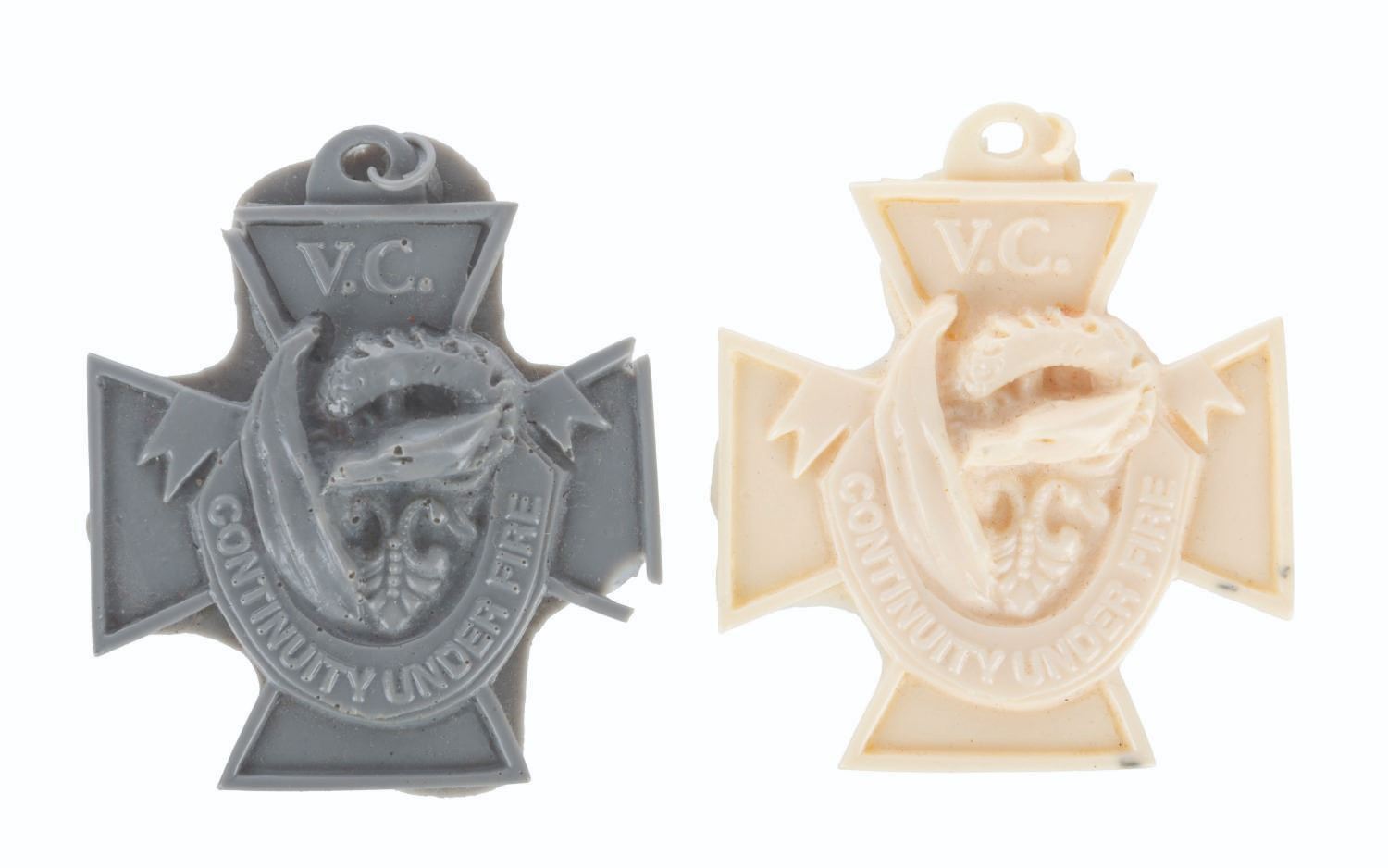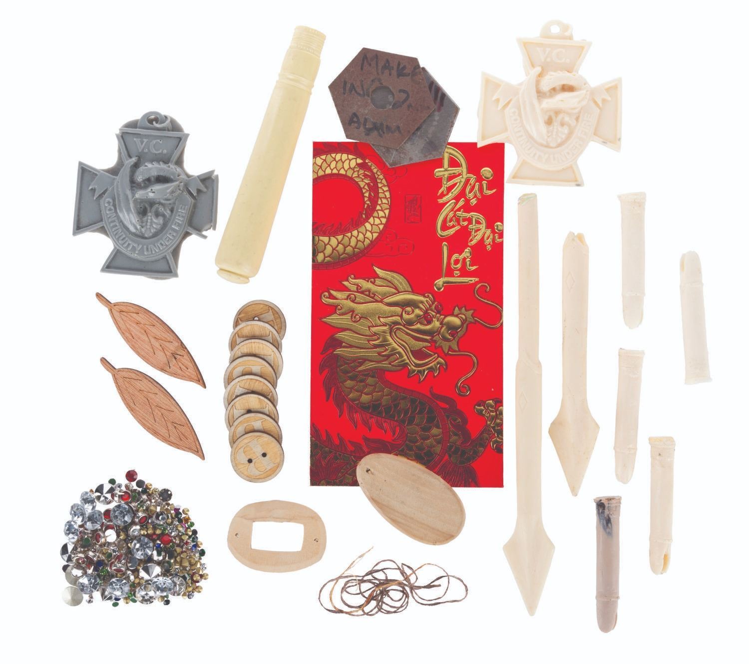 (Warner Bros., 2012-14) A collection of The Hobbit trilogy production-made prop test and surplus pieces. Included are seven wooden Bilbo button prototypes, a resin knife handle ornament, a plastic shaft part and thread for an elven arrow, two resin arrowheads, five arrow nock resin castings, a prop Honey jar label seen in Bilbo’s pantry in "An Unexpected Journey,” over 100 glass and plastic jewels, two resin test casts of a Victoria Cross crew gift for the film’s Continuity Dept, two wooden leaf prototypes, two metal hexagonal plates, and two unidentified wooden oval pieces. Ranging in size from a 0.25” x 0.25” x 0.25” jewel to a 7.75” x 1” x 0.5” thick arrowhead, the items are all in good to very good condition with handling wear and soiling from production use.