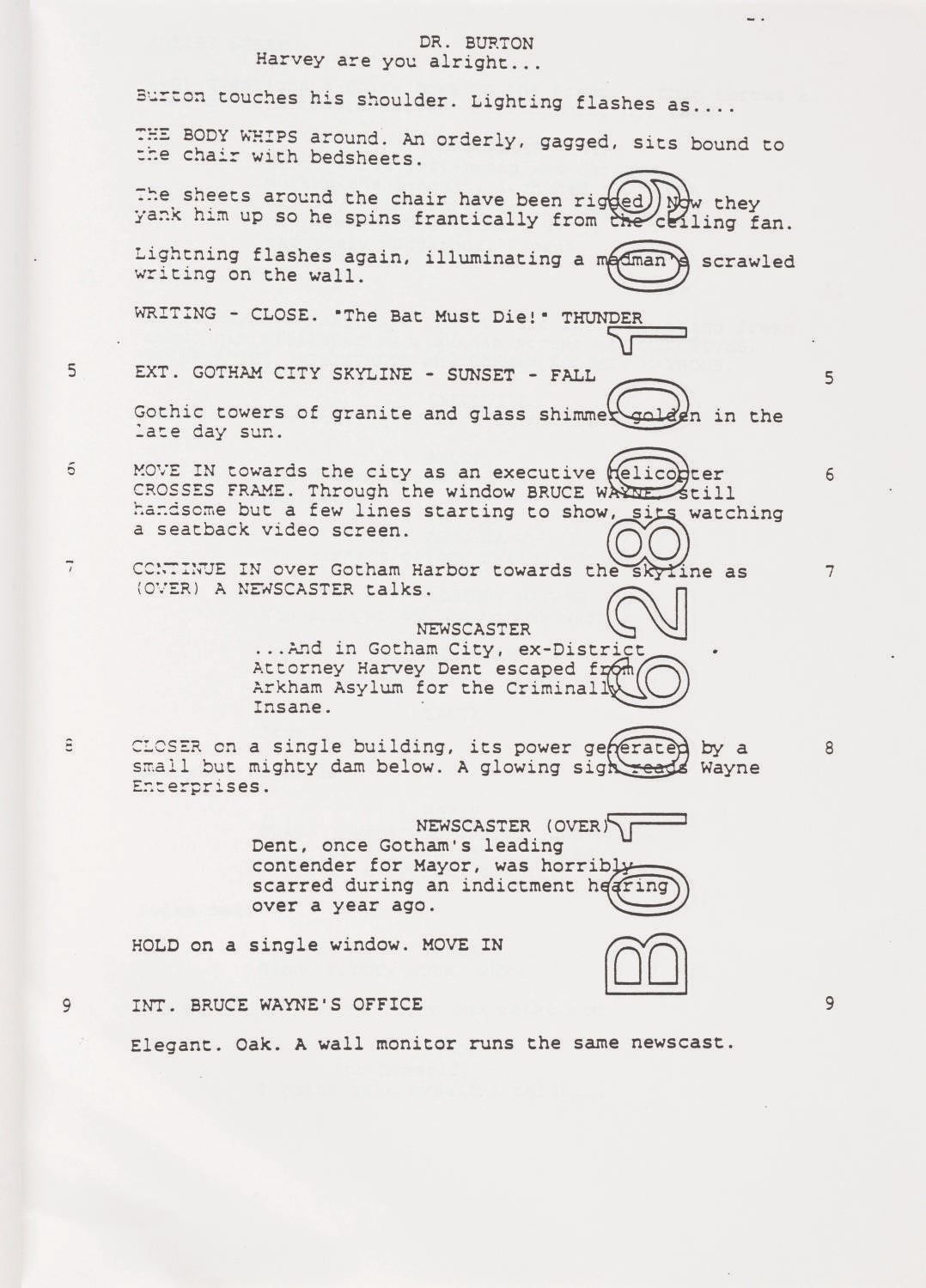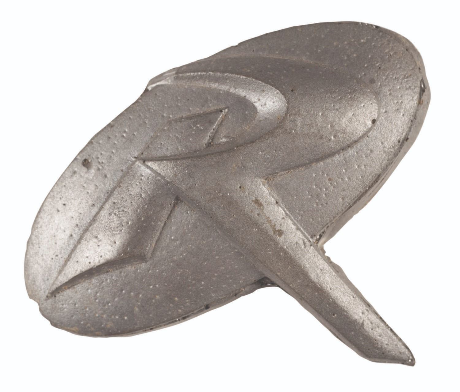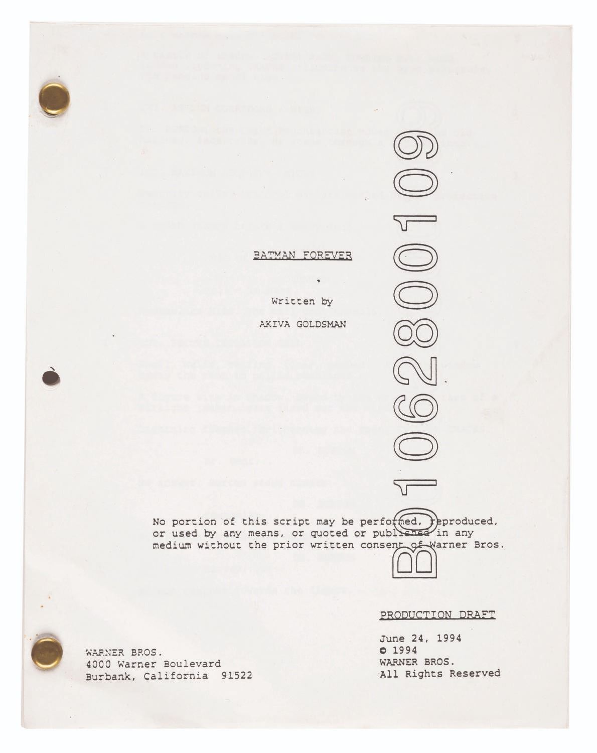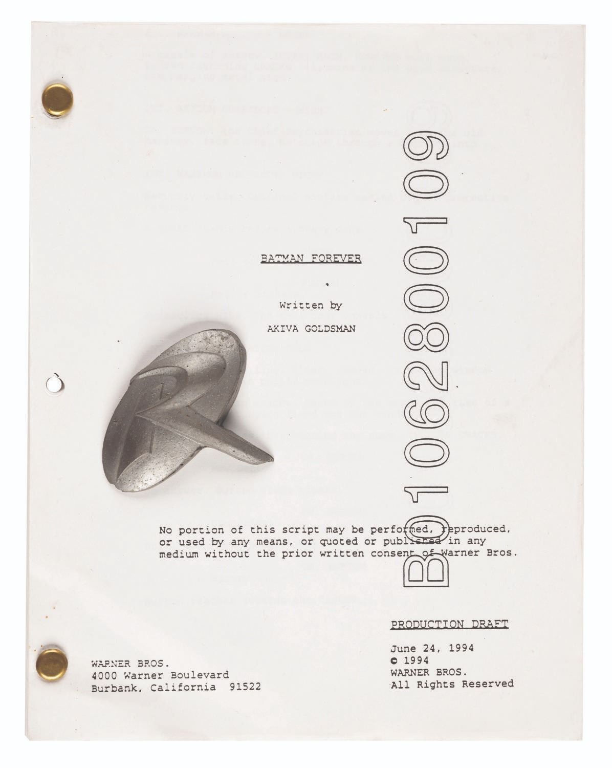 (Warner Bros., 1995) A "Batman & Robin” prototype Robin emblem and a "Batman Forever” script dated June 24, 1994, written by Akiva Goldsman. "Batman Forever” featured Val Kilmer as Batman and introduced Robin to the Joel Schumacher-directed series, played by Chris O’Donnell. Measuring 2.25” x 0.5” x 3” and 8.5” x 11”, the resin emblem and script are both in good condition with scuffs, scratches, creases, and wear from production use.