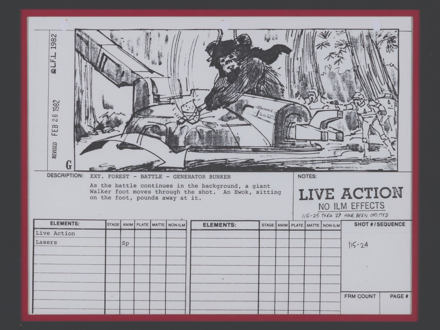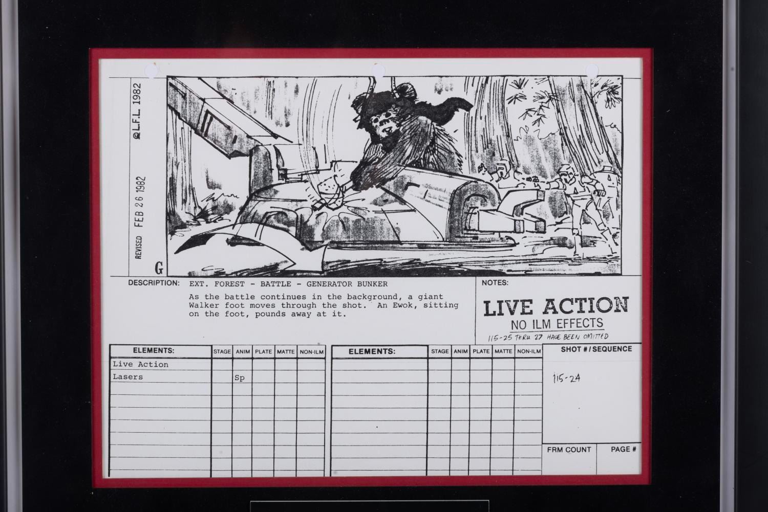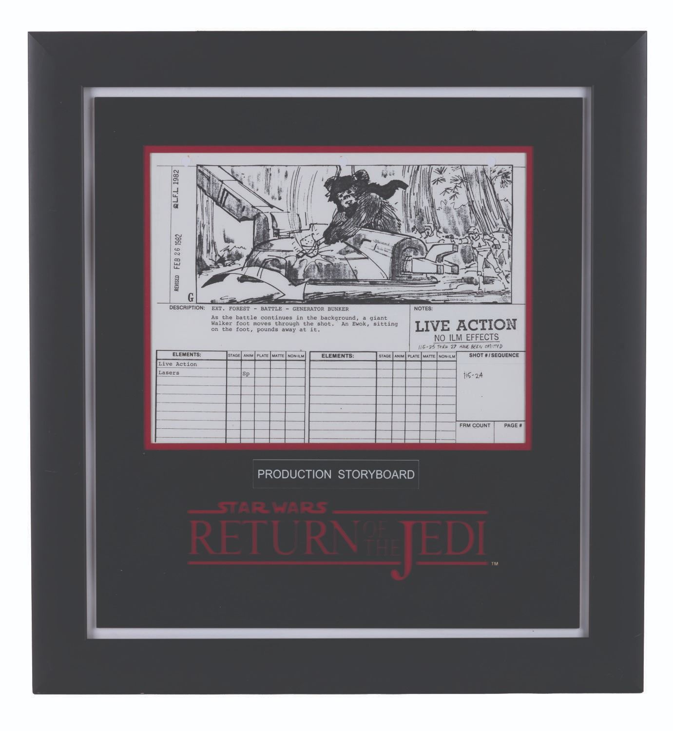 (20th Century Fox, 1982) A production-used storyboard page from "Return of the Jedi.” The revised photocopy page dated February 26, 1982, for shot 115 sequence 24, features an Ewok attacking the foot of an Imperial Walker. Measuring 8.25” x 10.75” in a 17.5” x 19” framed matte, the storyboard page is in very good condition with light wear from production use, while the frame is in good condition with scuffs, scratches, and wear.