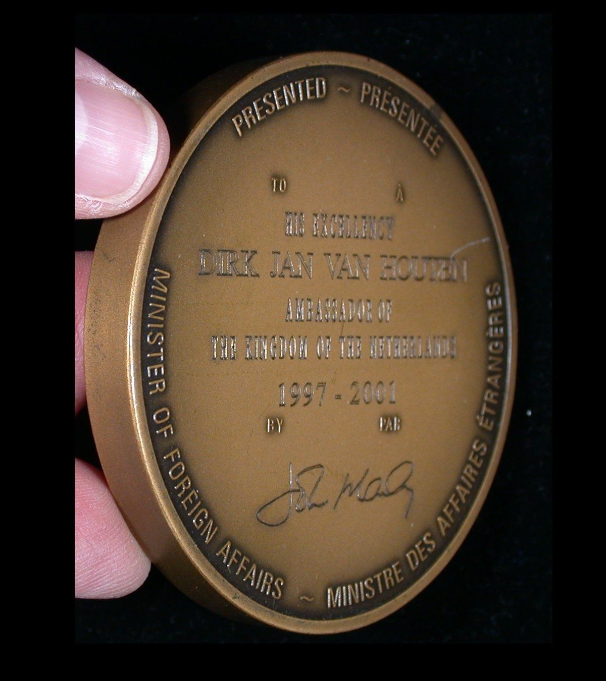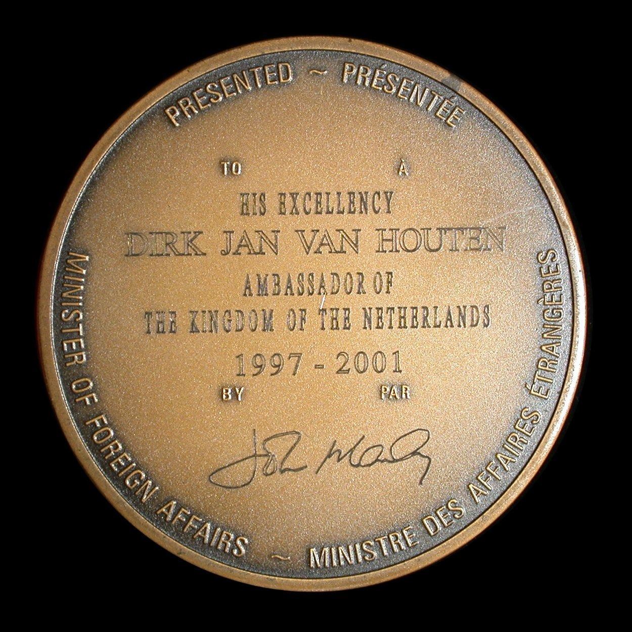 A 75mm, 314g heavy antiqued bronze medal of the Canada Diplomatic Corps, presented by the Minister of Foreign Affairs to "HIS EEXCELLENCY DIRK JAN VAN HOUTEN, AMBASSADOR OF THE KINGDOM OF THE NETHERLANDS 1997-2001". The first named example of this impressive medal we have handled in 20 years, and quite scarce.