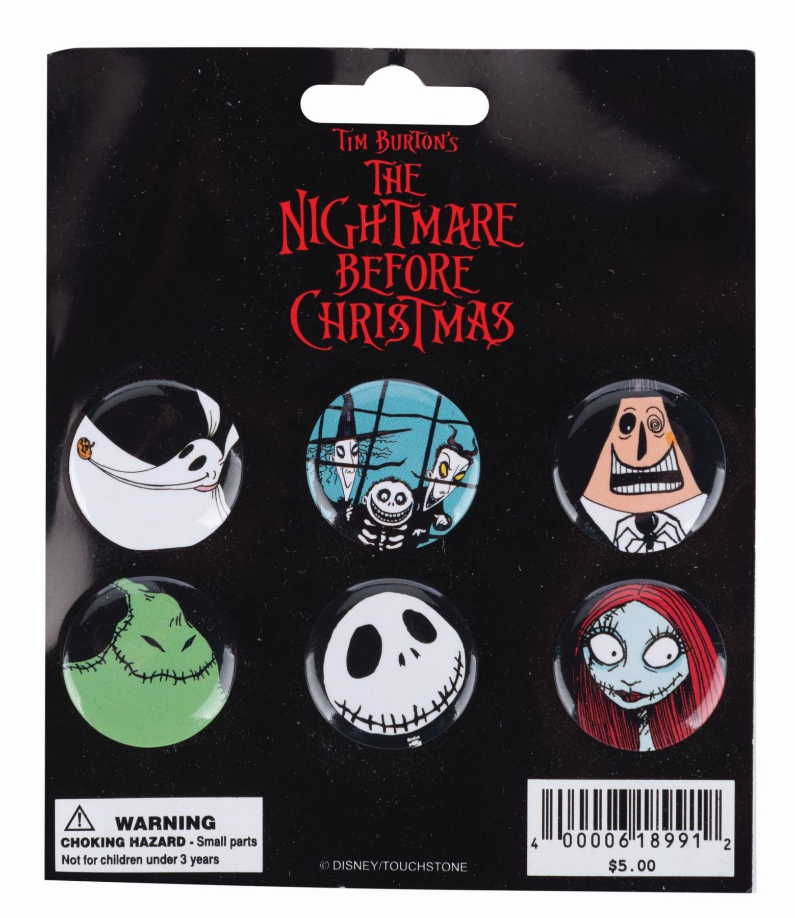 (Disney/Touchstone) A set of (6) Tim Burton's The Nightmare Before Christmas buttons. The set features Jack, Sally, Zero, Lock, Shock, and Barrel, the Mayor and Oogie Boogie. The buttons are in fine unused condition on original card, while the card is in very good condition with few small dimples.