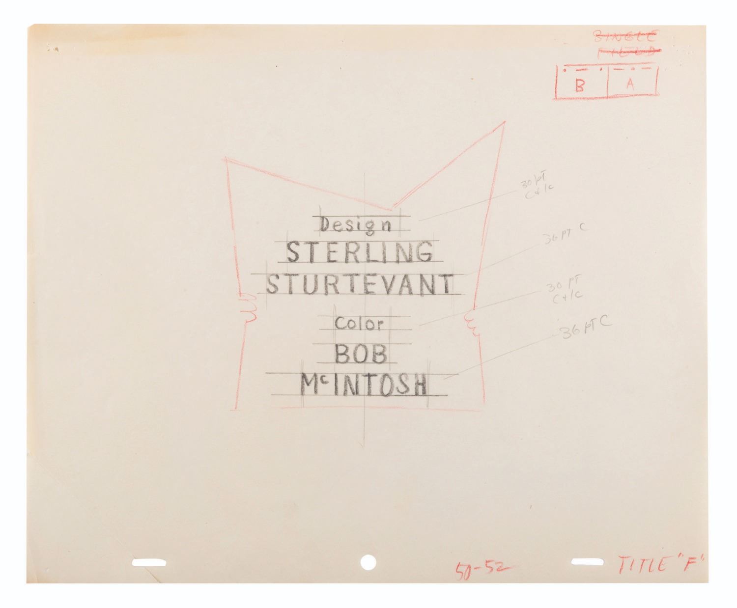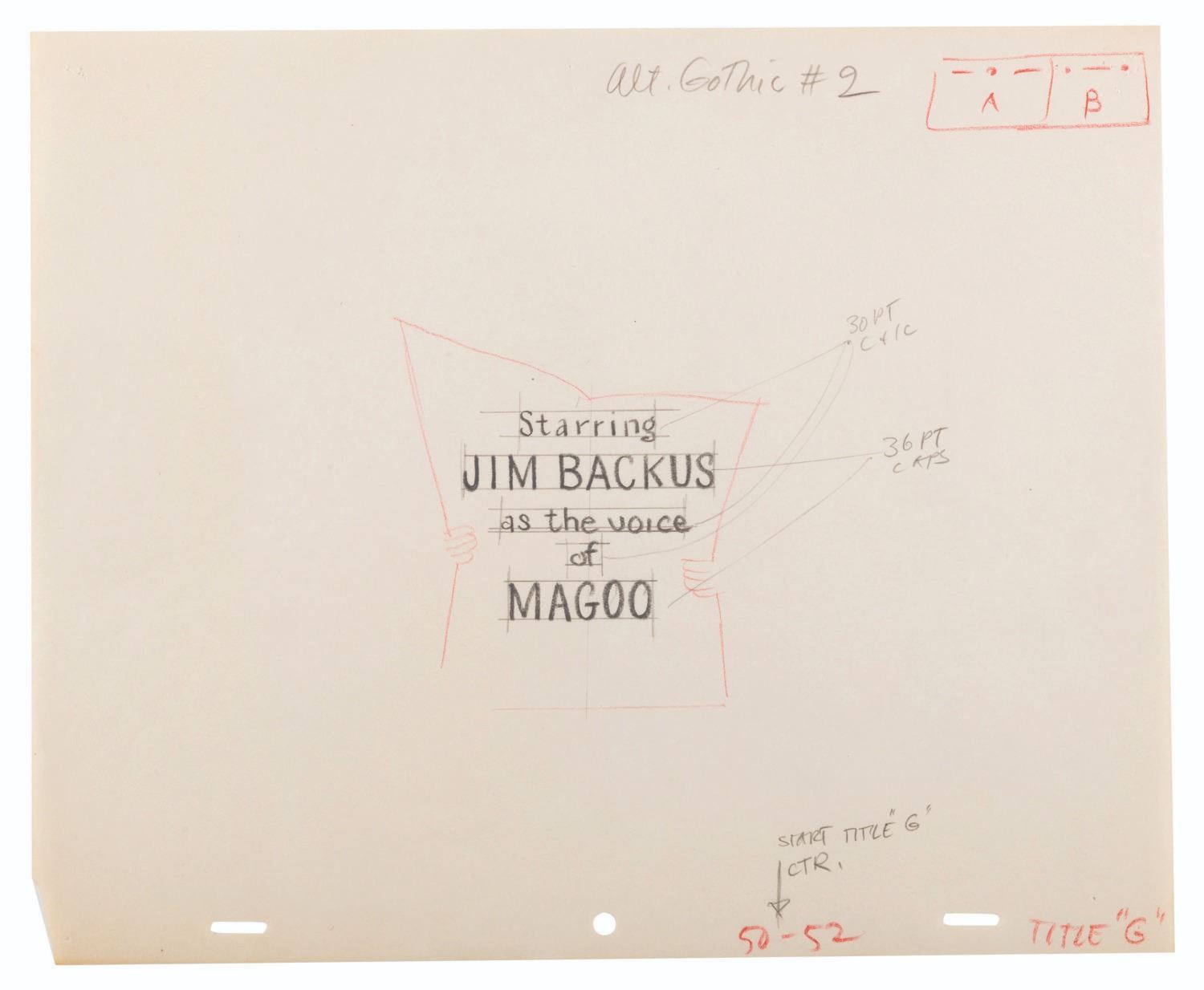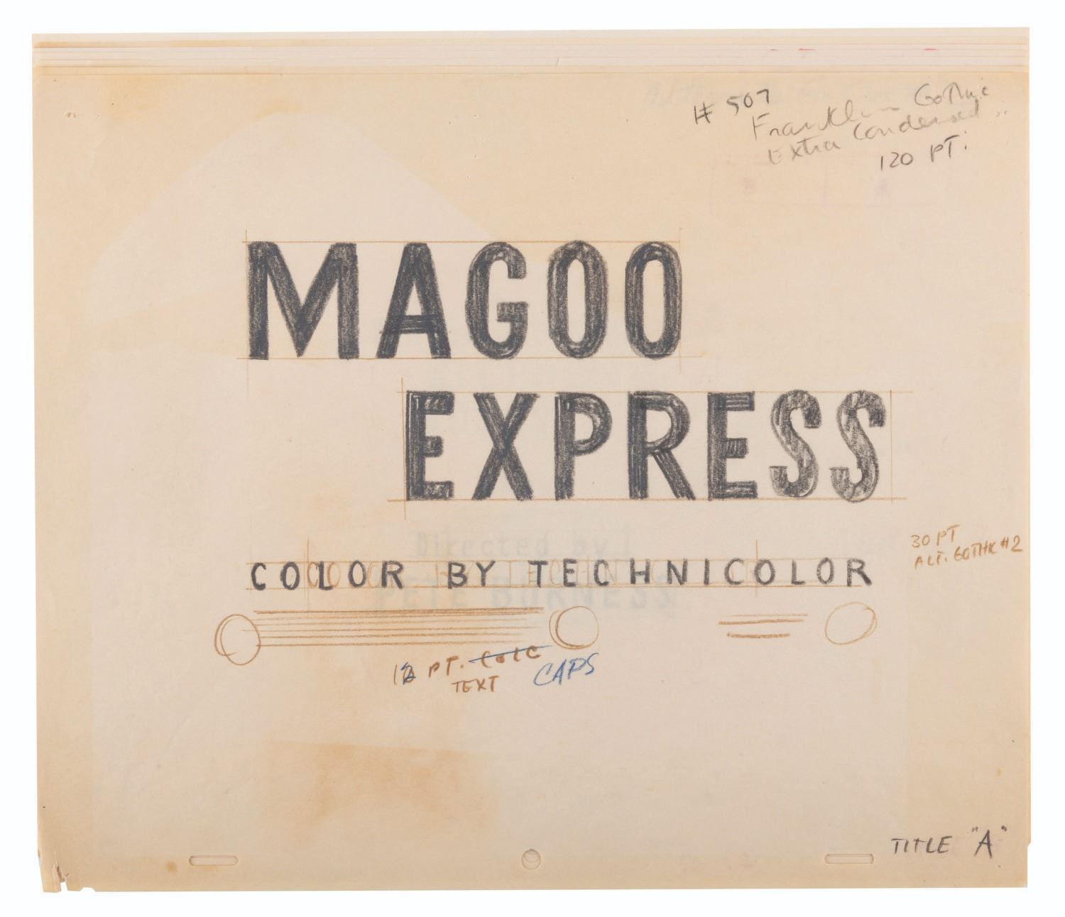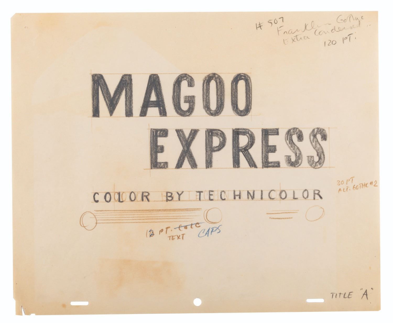(UPA, 1955) A set of seven original drawings for the proposed titles to UPA’s 1955 Mr. Magoo short, "Magoo Express.” The titles were designed to use the open newspapers seen in the opening, but were later changed to a more straightforward title sequence. Each drawing is accomplished in graphite and colored pencil on 12.5” x 10.5” animation paper. The artwork is in very good condition with some yellowing to the paper from age and some edge wear.