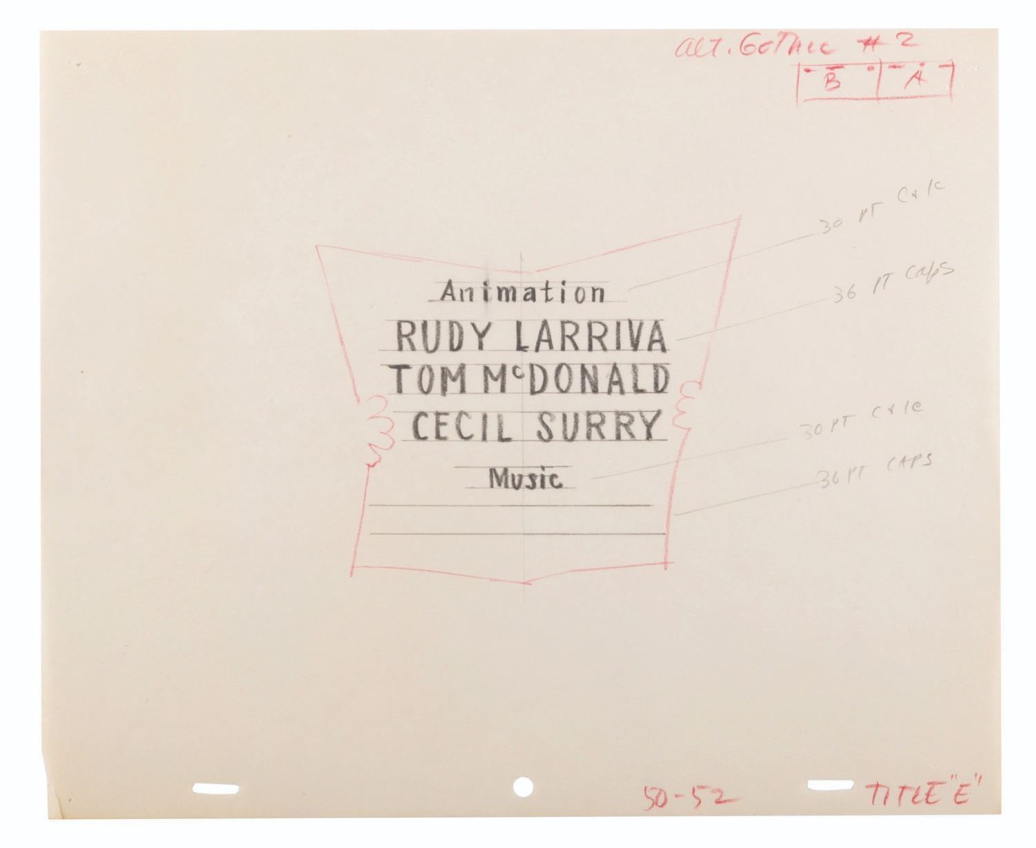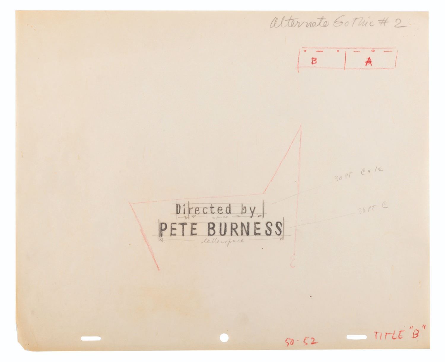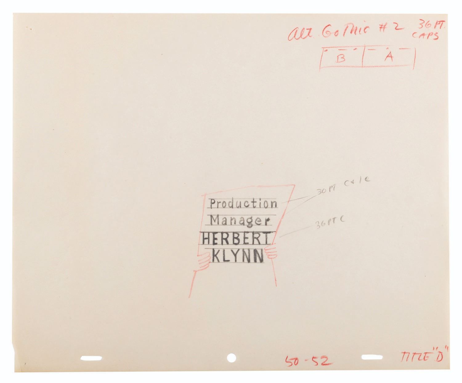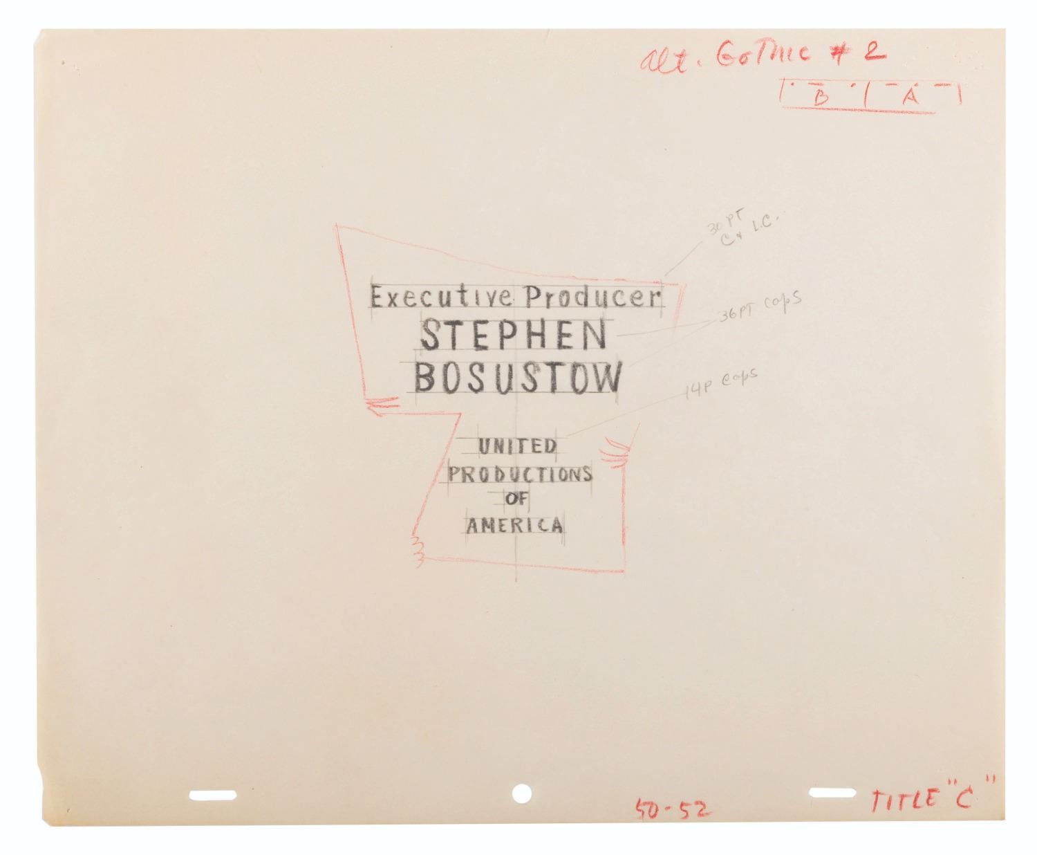 (UPA, 1955) A set of seven original drawings for the proposed titles to UPA’s 1955 Mr. Magoo short, "Magoo Express.” The titles were designed to use the open newspapers seen in the opening, but were later changed to a more straightforward title sequence. Each drawing is accomplished in graphite and colored pencil on 12.5” x 10.5” animation paper. The artwork is in very good condition with some yellowing to the paper from age and some edge wear.