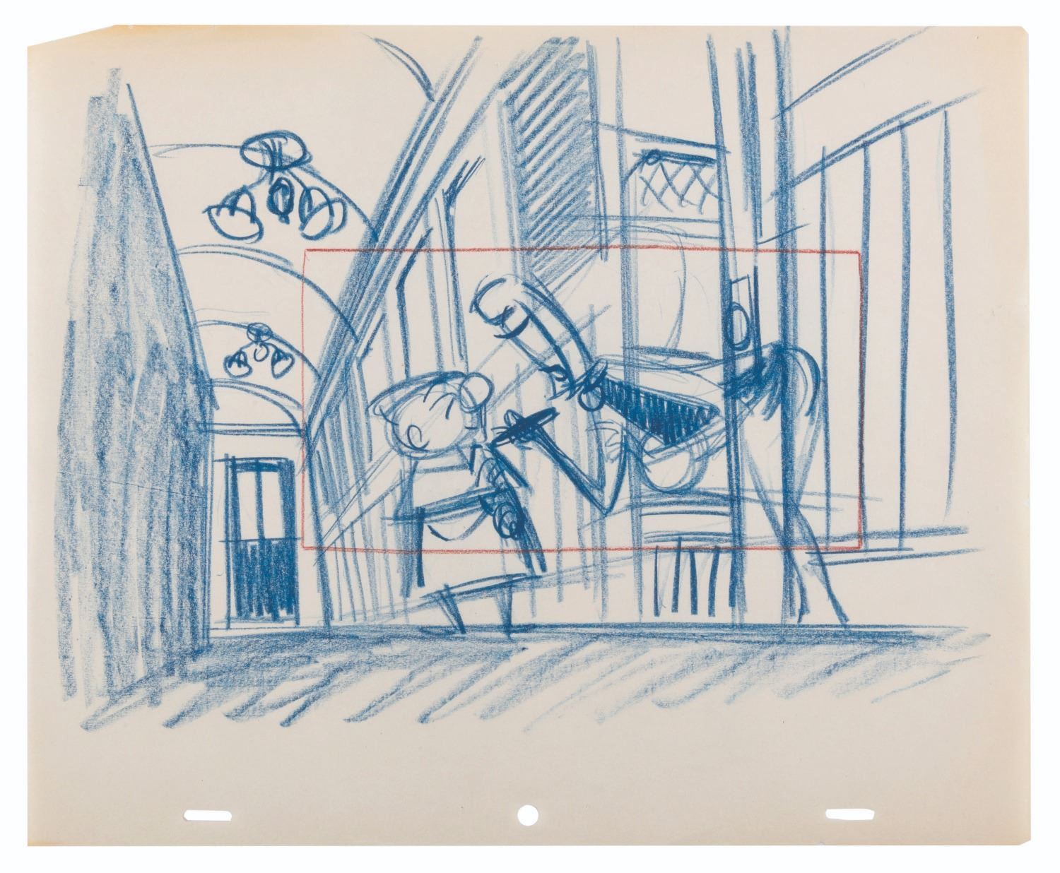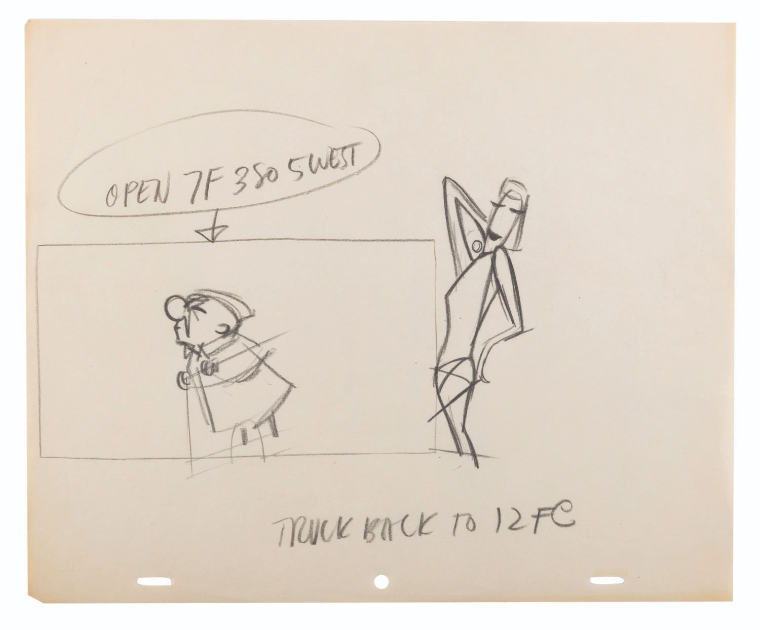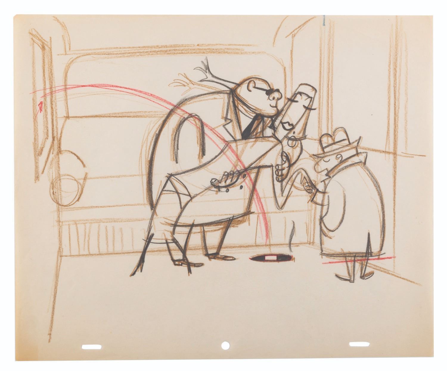 (UPA, 1955) A collection of seven layout and model drawings from UPA’s 1955 Mr. Magoo short, "Magoo Express.” Each drawing is accomplished in graphite and colored pencil on 12.5” x 10.5” animation paper. The artwork is in very good condition with some yellowing to the paper from age and some edge wear.