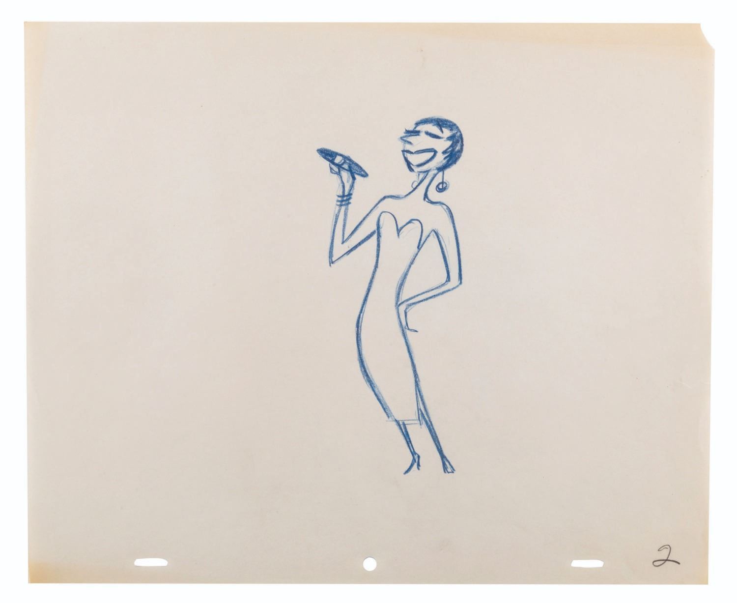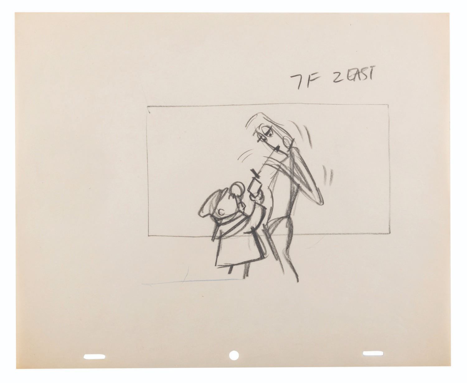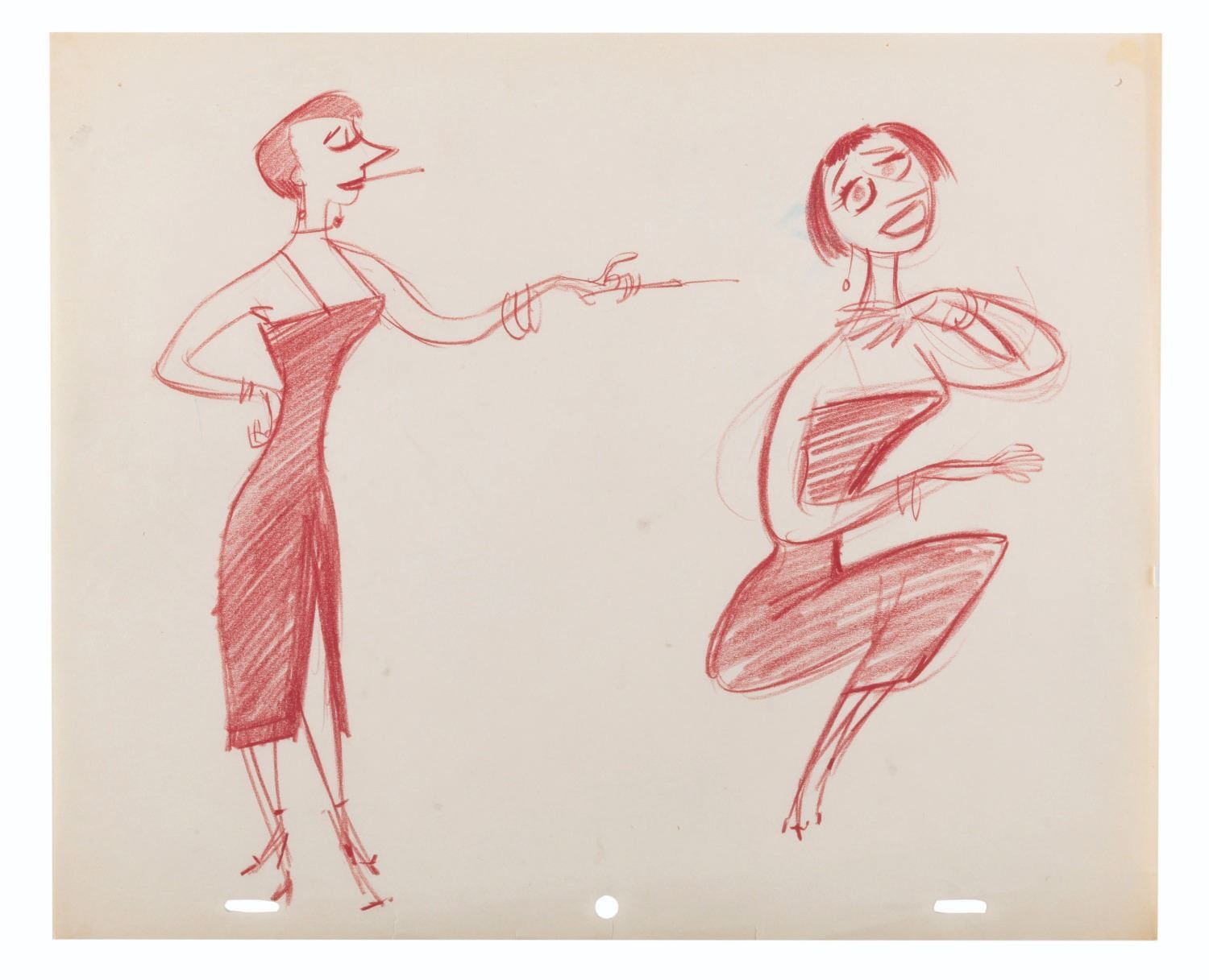 (UPA, 1955) A collection of seven layout and model drawings from UPA’s 1955 Mr. Magoo short, "Magoo Express.” Each drawing is accomplished in graphite and colored pencil on 12.5” x 10.5” animation paper. The artwork is in very good condition with some yellowing to the paper from age and some edge wear.