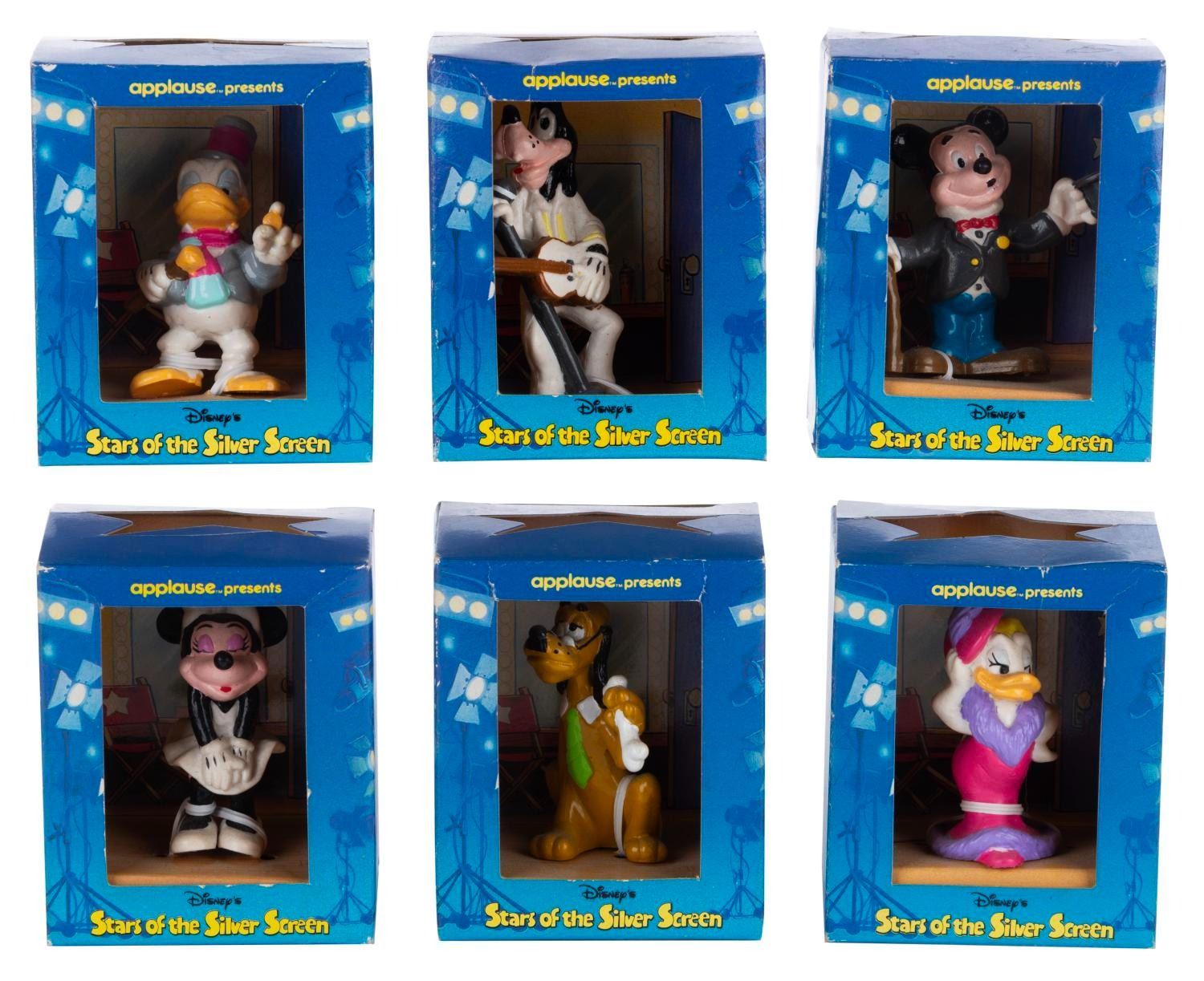 (Applause, 1980s) A set of six Disney's Stars of the Silver Screen PVC figures with their original boxes. Included are Mickey as Charlie Chaplin, Minnie as Marilyn Monroe, Donald as W.C. Fields, Goofy as Elvis Presley, Pluto as Groucho Marx, and Daisy as Mae West. Measuring 2.25" tall each in their 2" x 2.75" x 3.5" tall original boxes, the figures display in very good condition with light spots of paint loss from age and creases on the boxes.