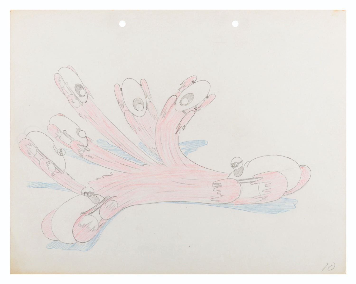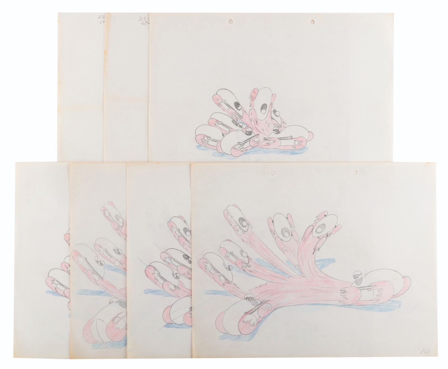 (Schlesinger, 1937) A set of seven production drawings from "Porky’s Road Race,” directed by Frank Tashlin. Five drawings capture the moment the pack of race cars strikes a patch of glue and stretch it out sticking and bouncing back. Two drawings depict a rough hound-like figure. Accomplished in graphite and colored pencil on 9.5” x 12” animation paper with image sizes from 2.75” x 3.25” up to 10.25” x 6.25”, the drawings are in very good condition with expected light wear from production use and age.