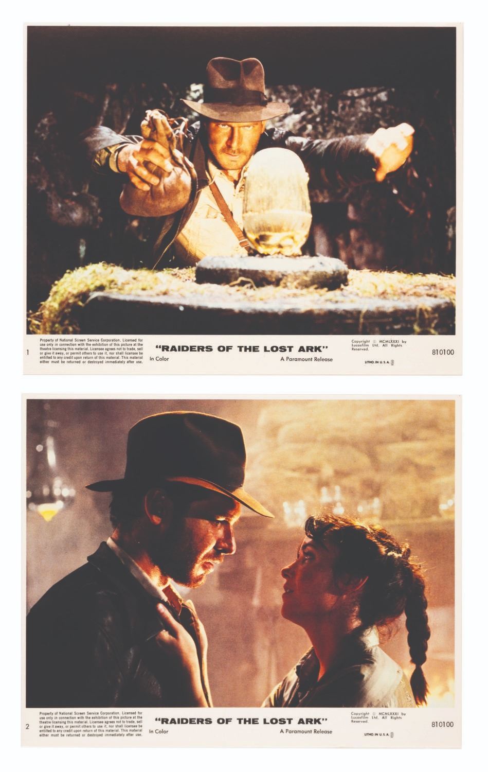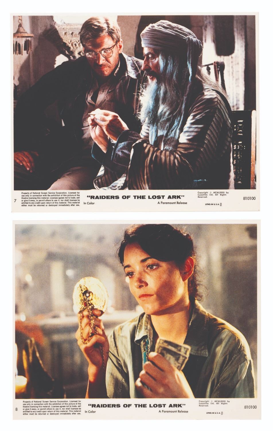 (Paramount, 1981) A complete set of eight lobby cards for "Raiders of the Lost Ark,” the first film in the Indiana Jones franchise. The lithographically printed cards were issued by the National Screen Service and feature beautiful imagery from the film. Measuring 8” x 10”, the lobby cards are in fine condition.
