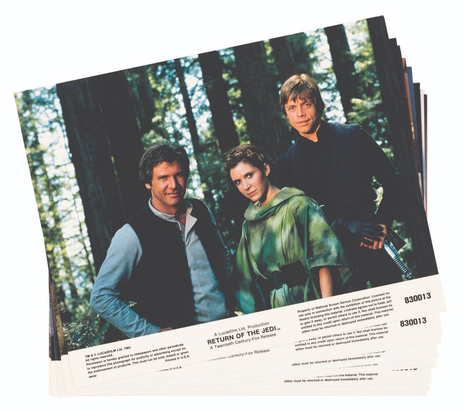 (20th Century Fox, 1983) A set of eight lobby cards for "Star Wars: Return of the Jedi.” Measuring 8” x 10”, the lobby cards are in good to very good condition with light wear and deep scratches to the Yoda card.