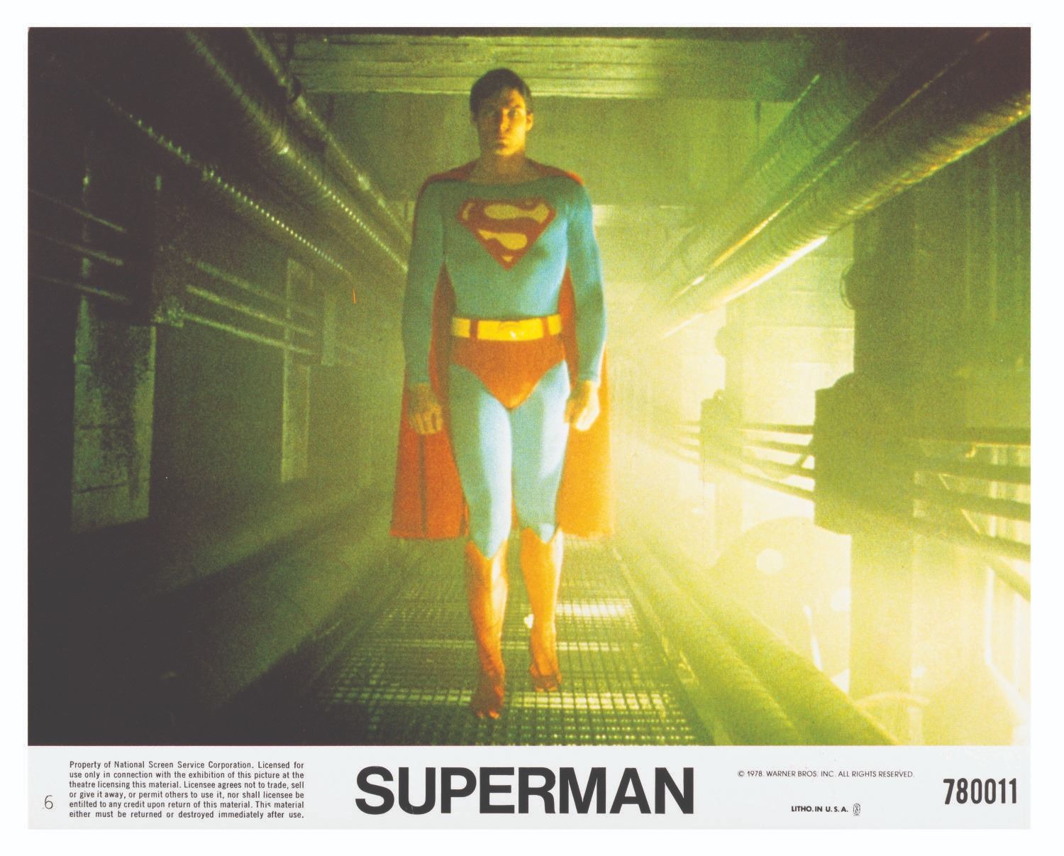 (Warner Bros., 1978) A set of eight lobby cards from the first "Superman” film, starring Christopher Reeve. Among the set are scenes featuring Superman saving the day, Lois Lane, and Superman’s alter ego, Clark Kent. Measuring 8” x 10” each, the lobby cards are in very good condition with light creases, scuffs, and edge wear.