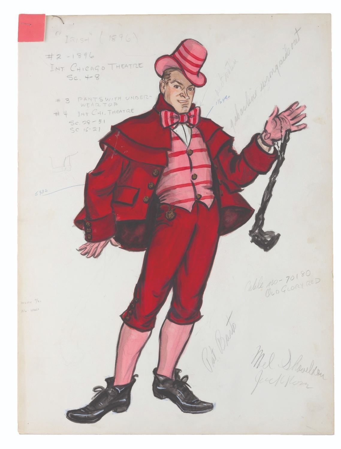 (Paramount, 1955) A costume design by Pat Barto for Bob Hope as Eddie Foy in the musical biopic "The Seven Little Foys.” Barto signed the piece at the bottom right in graphite. Measuring 15” x 20”, the design is in good condition with scratches, stains, discoloration from age, pinholes at the corners, and staples at the top left from production use.