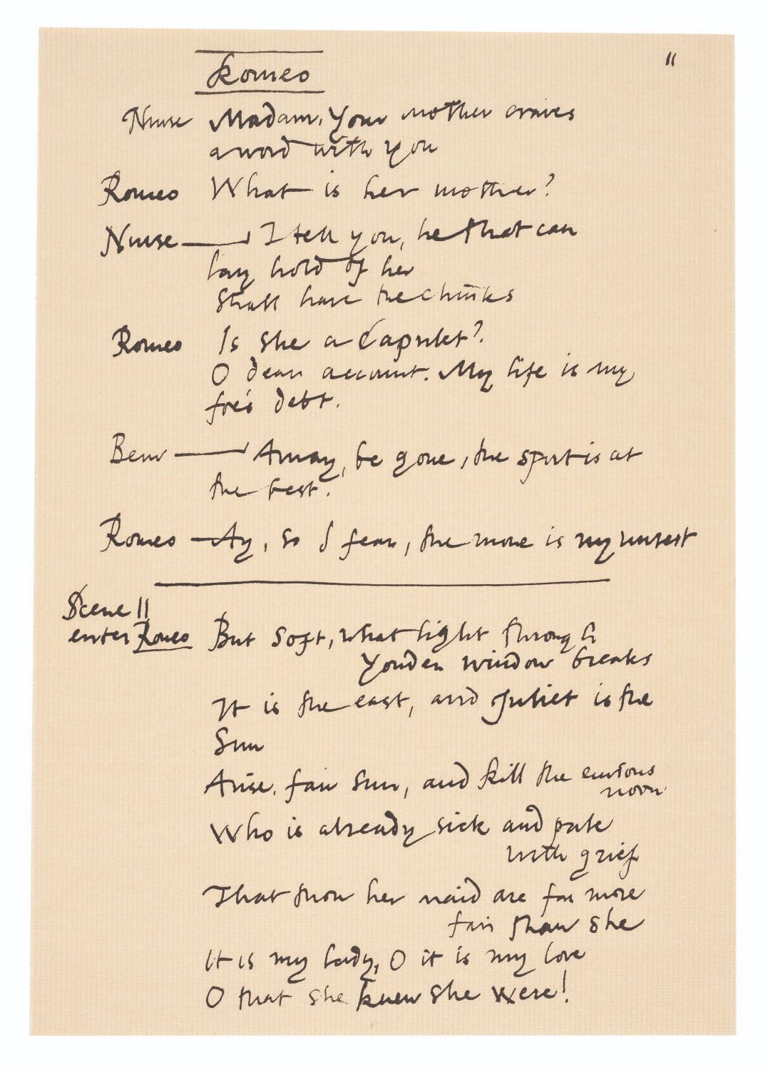 (Mirimax, 1998) A prop Romeo and Juliet script page for Joseph Fiennes as Shakespeare from the production of "Shakespeare in Love.” The page recreates parts of Act 2, Scene 2, of the iconic play where Romeo sees Juliet on her balcony. Measuring 10” x 7”, the print on textured paper is in fine condition.