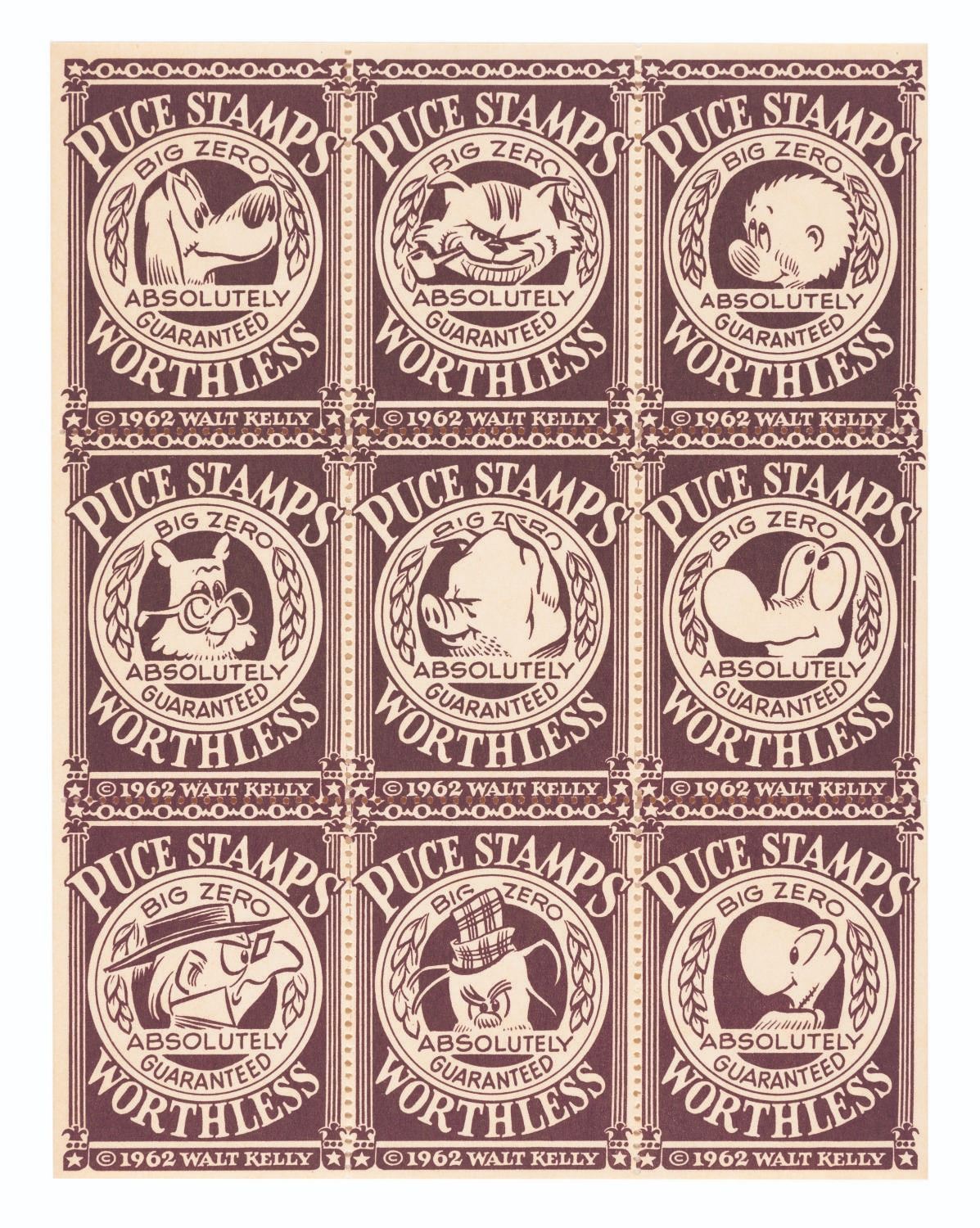 (Simon & Schuster, 1963) A complete sheet of nine Pogo "Puce Stamps.” Originally released with the "Pogo Puce Stamp Catalog”- actually a paperback book of Pogo cartoons - the stamps parodying then-popular S & H green stamps are very scarce to find at all today. Measuring 4.25” x 5.5”, the sheet of nine stamps is in fine condition.