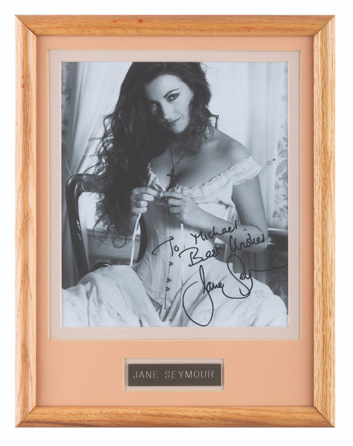 (Jane Seymour, 1990s) A photo of "Live and Let die" actress Jane Seymour signed in black ink with a dedication. Presented in a matted frame measuring 13” x 10” with a visible image of 8.25” x 7.25”, the photo is in fine condition.