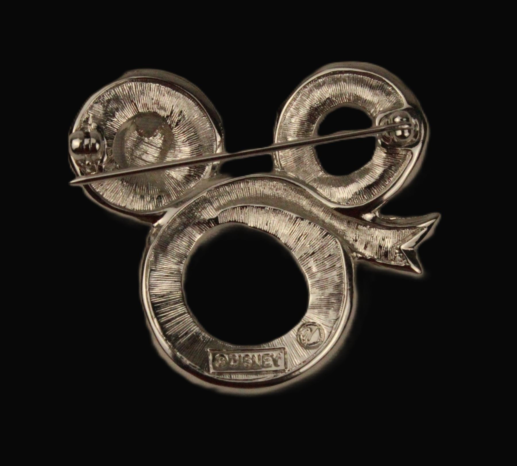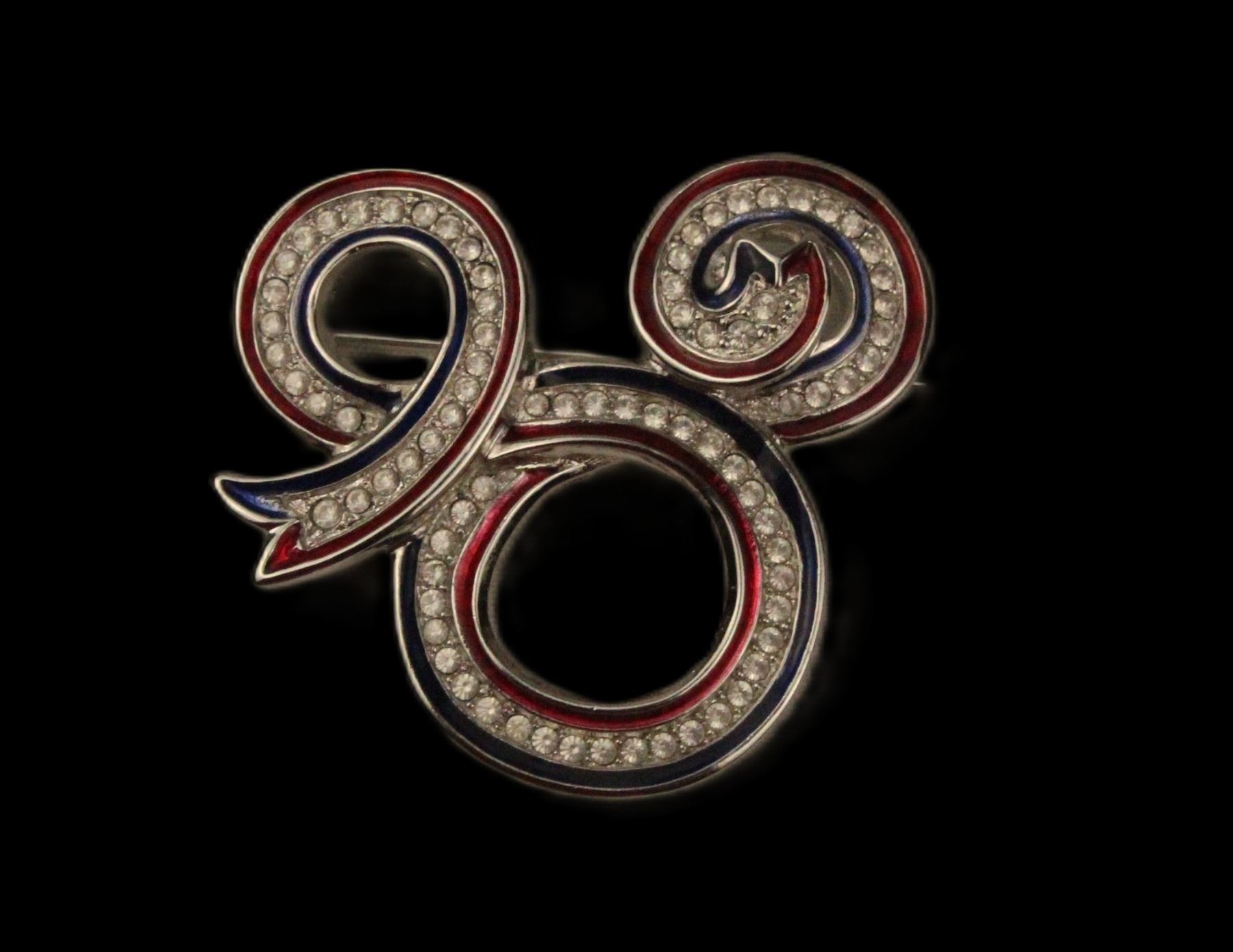 This is a beautiful brooch designed to look like a red, whit, and blue ribbon has been swirled into the shape of a Mickey head icon. The ribbon has Swarovski crystals throughout the entirety of the center. It measures 1.75” wide.
