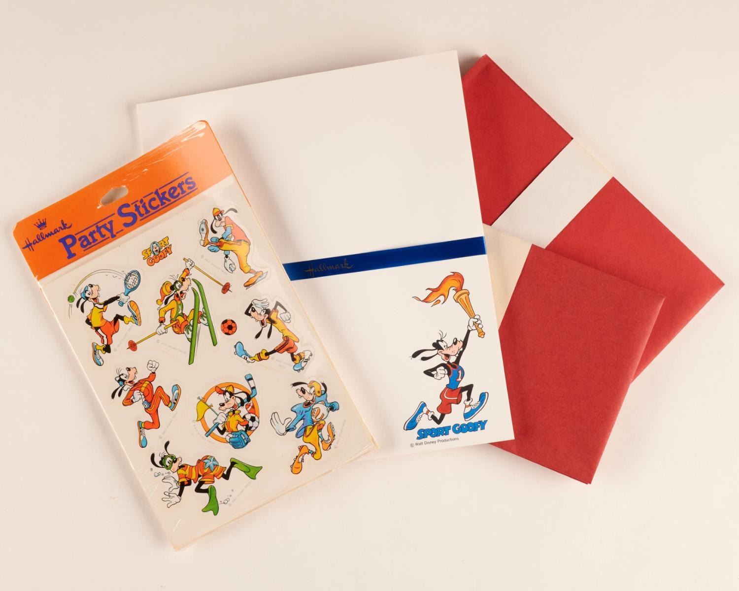 (Hallmark, 1983) An unused set of Sport Goofy Stationery by Hallmark. The complete set includes 32 sheets of stationery, 16 envelopes, and a sealed package of Party Stickers. The 6.5" x 8" stationery sheets, 4" x 6.75" envelopes, and the 4.75" x 7.5" sticker pack are in fine condition. The set comes in its original 7" x 8.5" x 0.75" box in very good condition with light edge and corner wear.