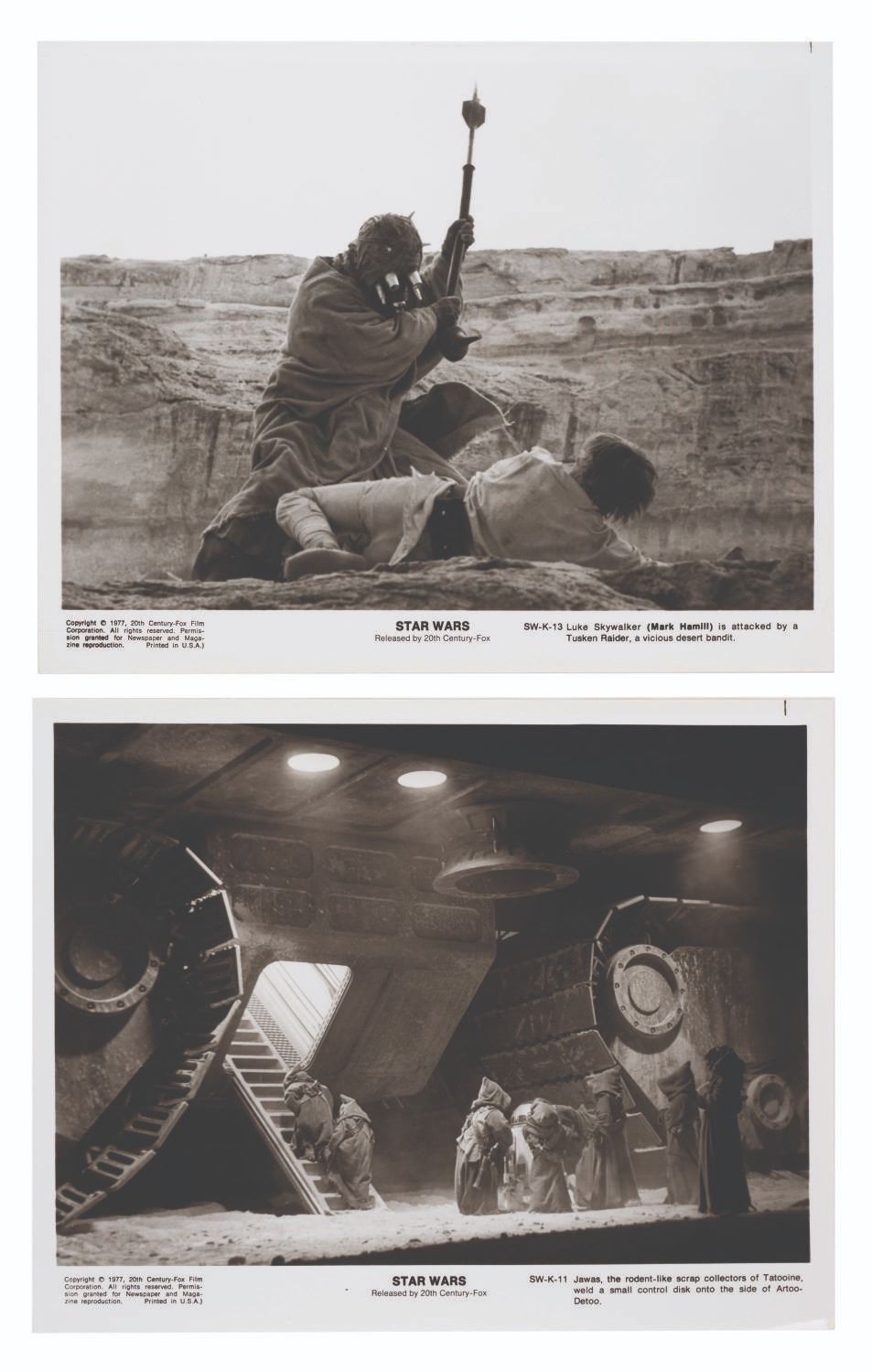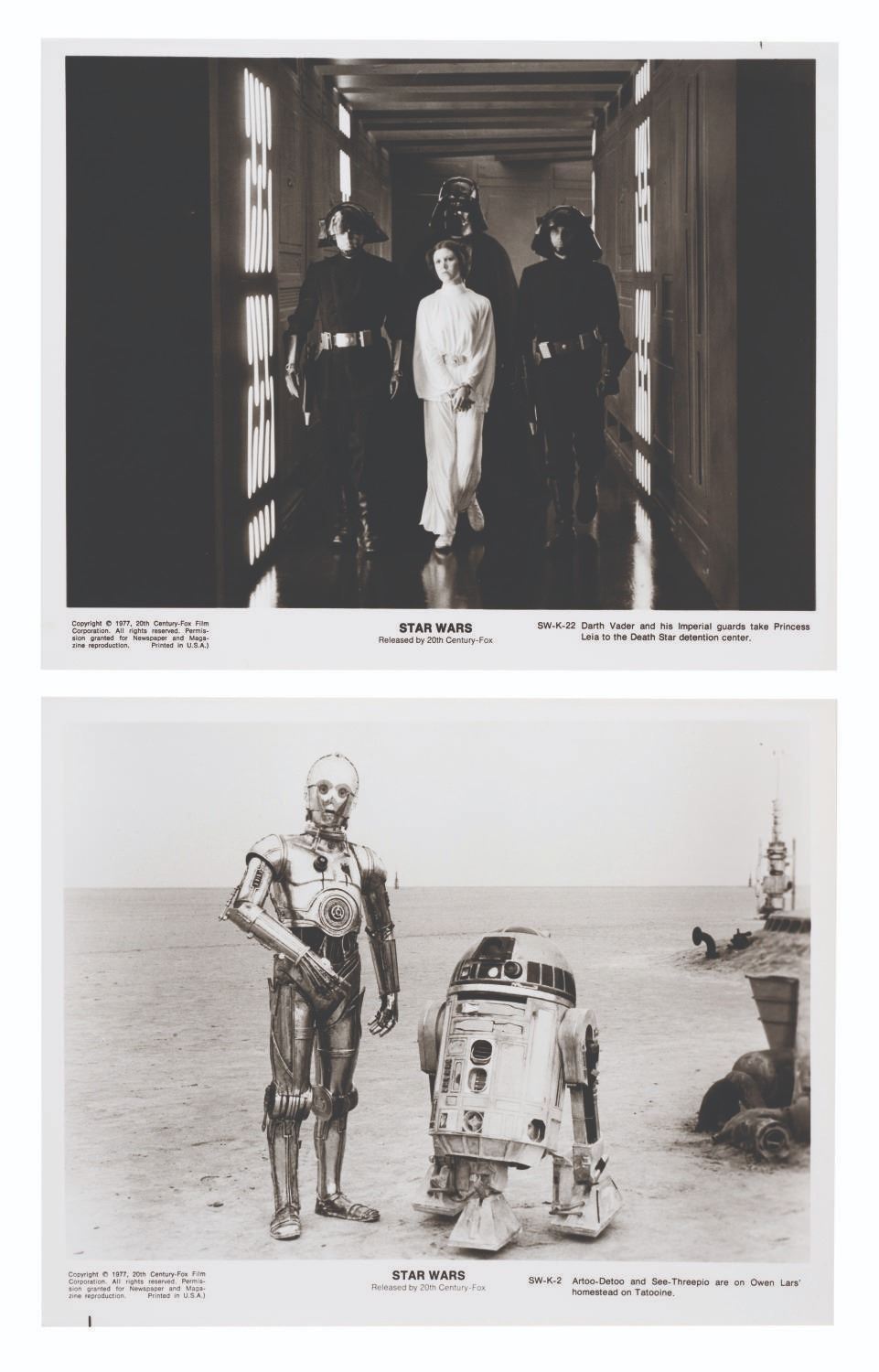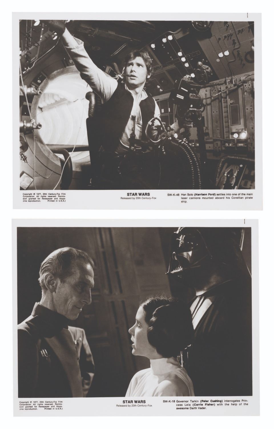 (20th Century Fox, 1977) A collection of 18 black and white publicity photos for George Lucas’ cultural phenomenon "Star Wars.” Included are scenes featuring Princess Leia, Luke Skywalker, and the epic showdown between Obi-Wan Kenobi and Darth Vader. Measuring 8.25” x 10.25” each, the photos are in good to very good condition with light wear and scratches.