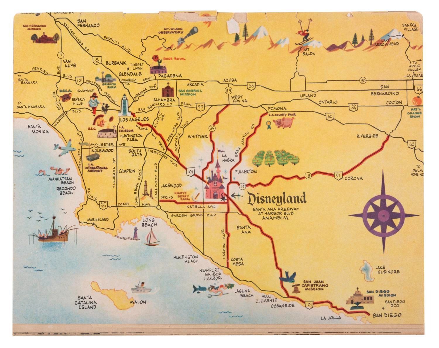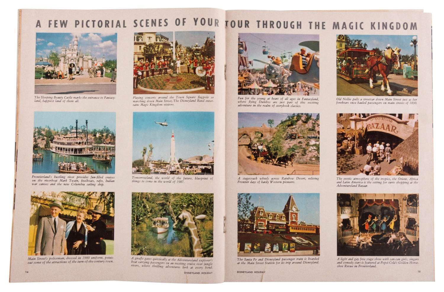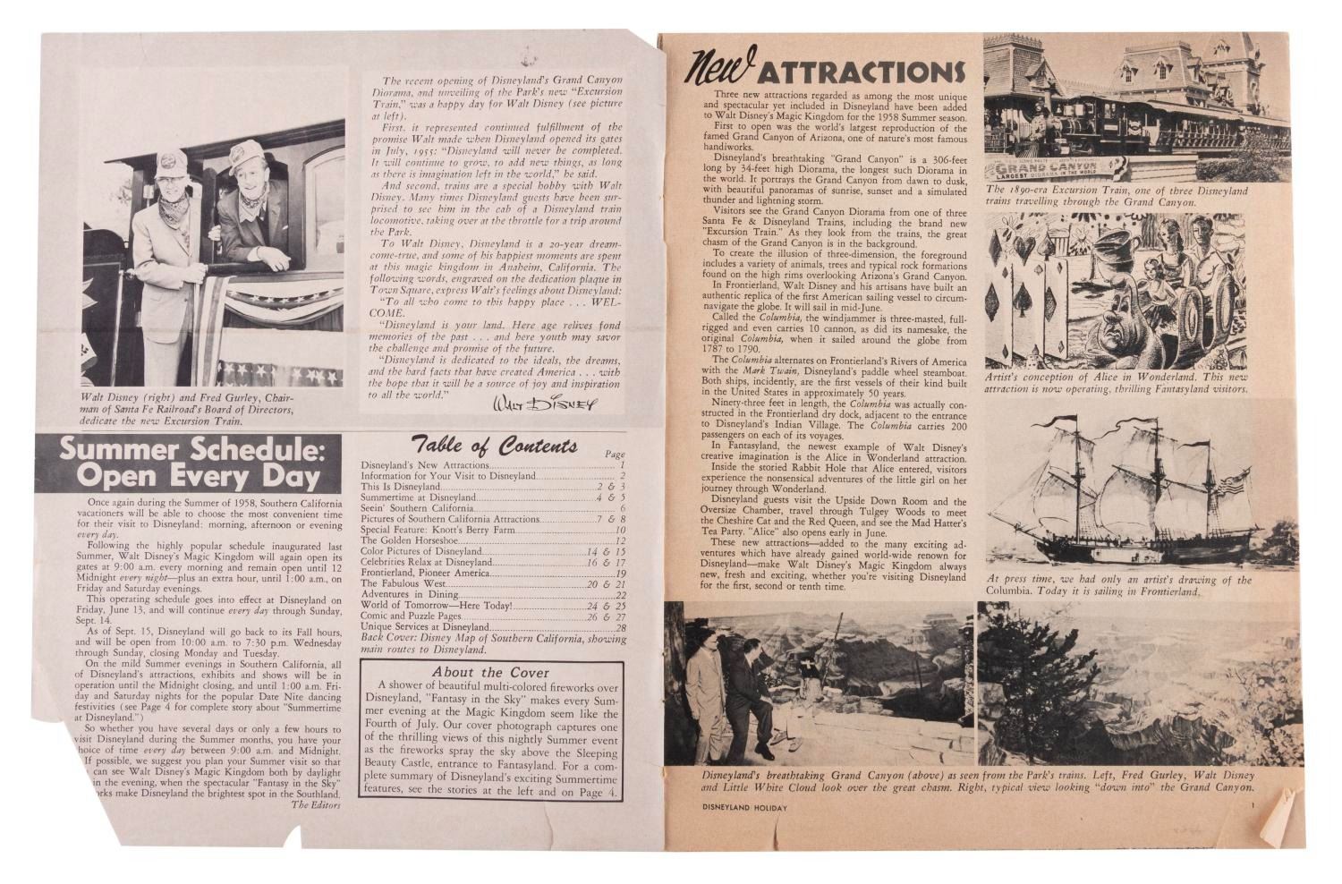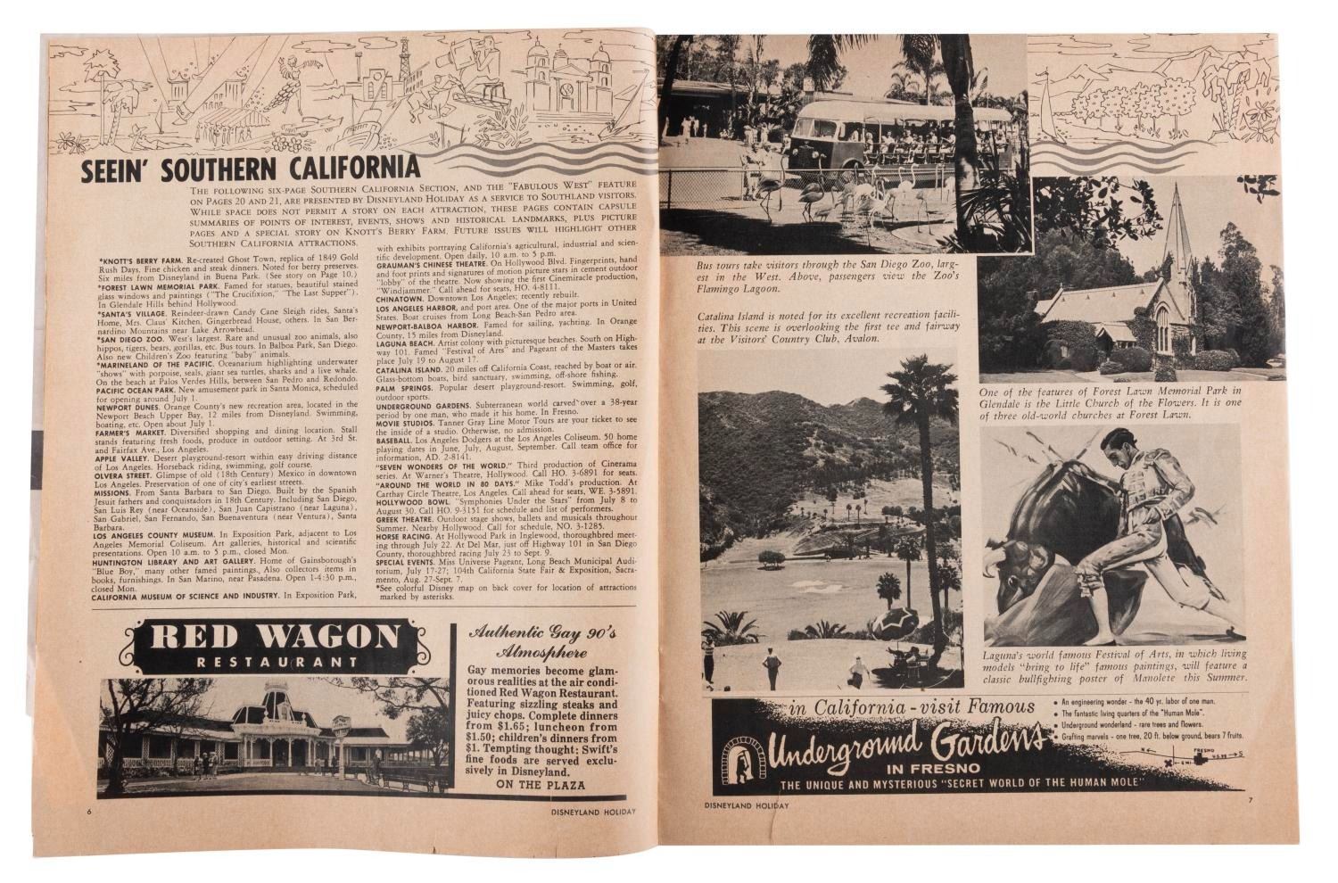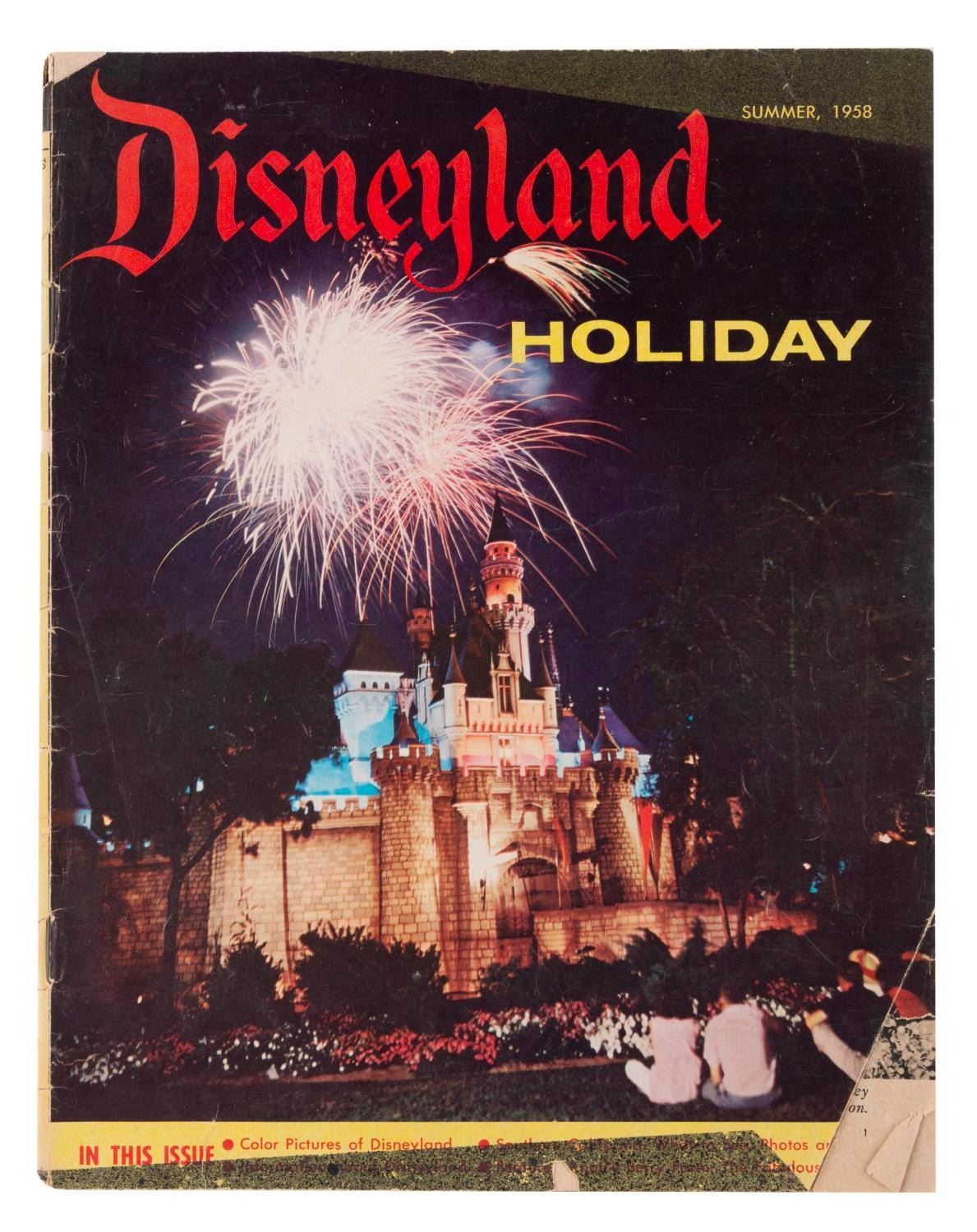 (Disneyland, 1958) A summer 1958 issue of Disneyland Holiday magazine, with photo stories on the Park and other Southern California tourist destinations. Measuring 8.5" x 10.75", the 30-page magazine is in poor to fair condition, with chipping, small tears, and scuffs throughout.