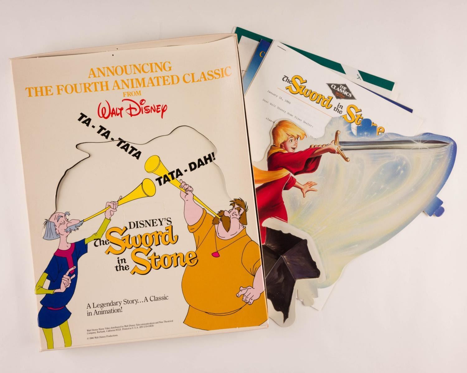 (Disney, 1986) An original VHS Press Release and Store Display for "The Sword in the Stone." The kit announces the film as the fourth animated classic to be released in the Black Diamond Classics series, and includes flyers and info sheets on other 1986 Disney videotape releases. The store display measuring 14" x 8" and the 8.5" x 11" papers are in very good condition, with a curve to the display from storage.
