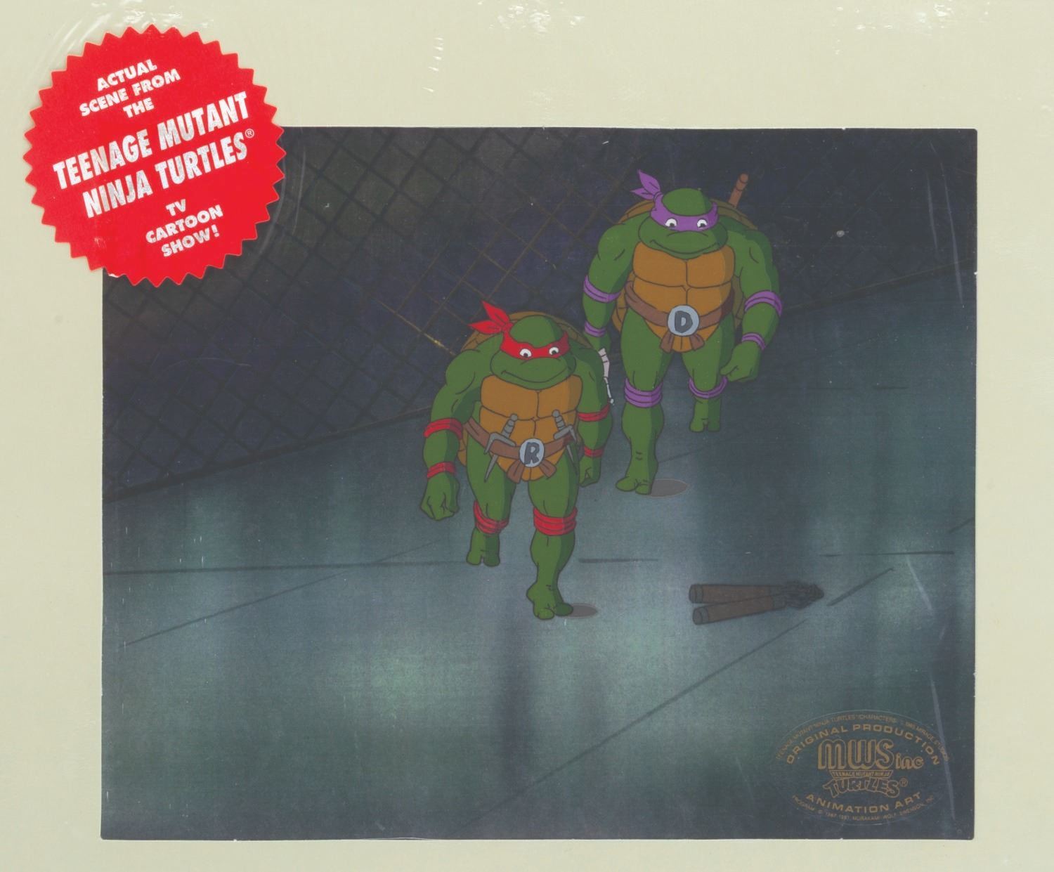 (Murakami-Wolf-Swenson, 1987-91) An original "Teenage Mutant Ninja Turtles" production cel of Raphael and Donatello, paired with a color copy background. Raphael and Donatello have an image size of 4" x 5" in a 11" x 14" matte. The cel is sealed in its original bag and is in fine condition, while the matte is in very good condition with a 1" stain near the bottom right corner.