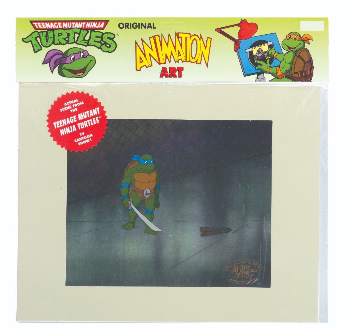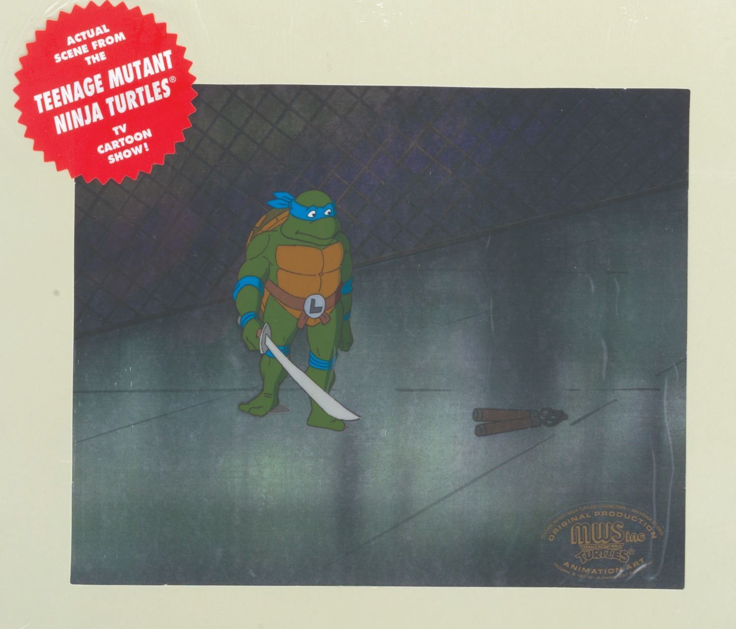(Murakami-Wolf-Swenson, 1987-91) An original production cel of Leonardo from "Teenage Mutant Ninja Turtles" with a color copy background. Leonardo has an image size of 2" x 3.75" in an 11" x 14" matte. The cel is sealed in its original bag and is in very good condition with light line loss.