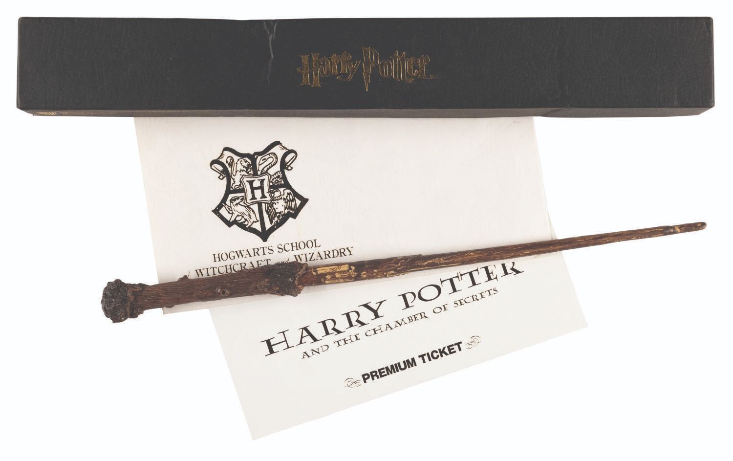 (Warner Bros., 2002) A "Premium” advance sales child ticket to "Harry Potter and the Chamber of Secrets” in Japan. The unused ticket comes in a decorative Hogwarts envelope, and includes a stub presented as a letter from Dumbledore thanking viewers for watching the first film while announcing the school’s preparation for the second. Included is a replica of Harry Potter’s wand from the film. The ticket and envelope measure up to 4.75” x 9.25” and are in very good condition with light handling wear to the envelope. The resin wand measures 13.5” long and is in good condition with small cracks just above the "handle” including a small chip missing. The wand box measuring 15.5” x 2” x 1.25” is in fair condition with several creases.