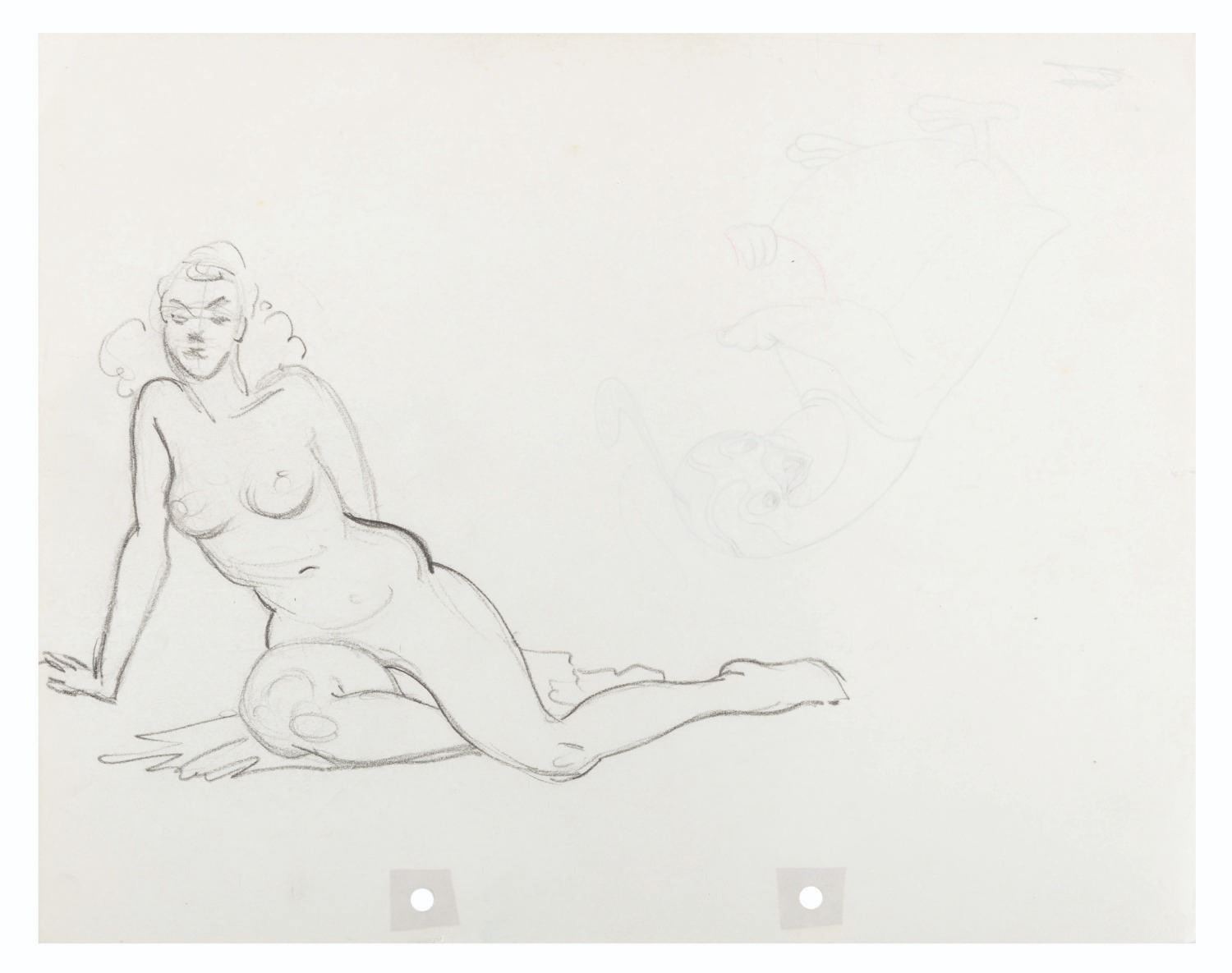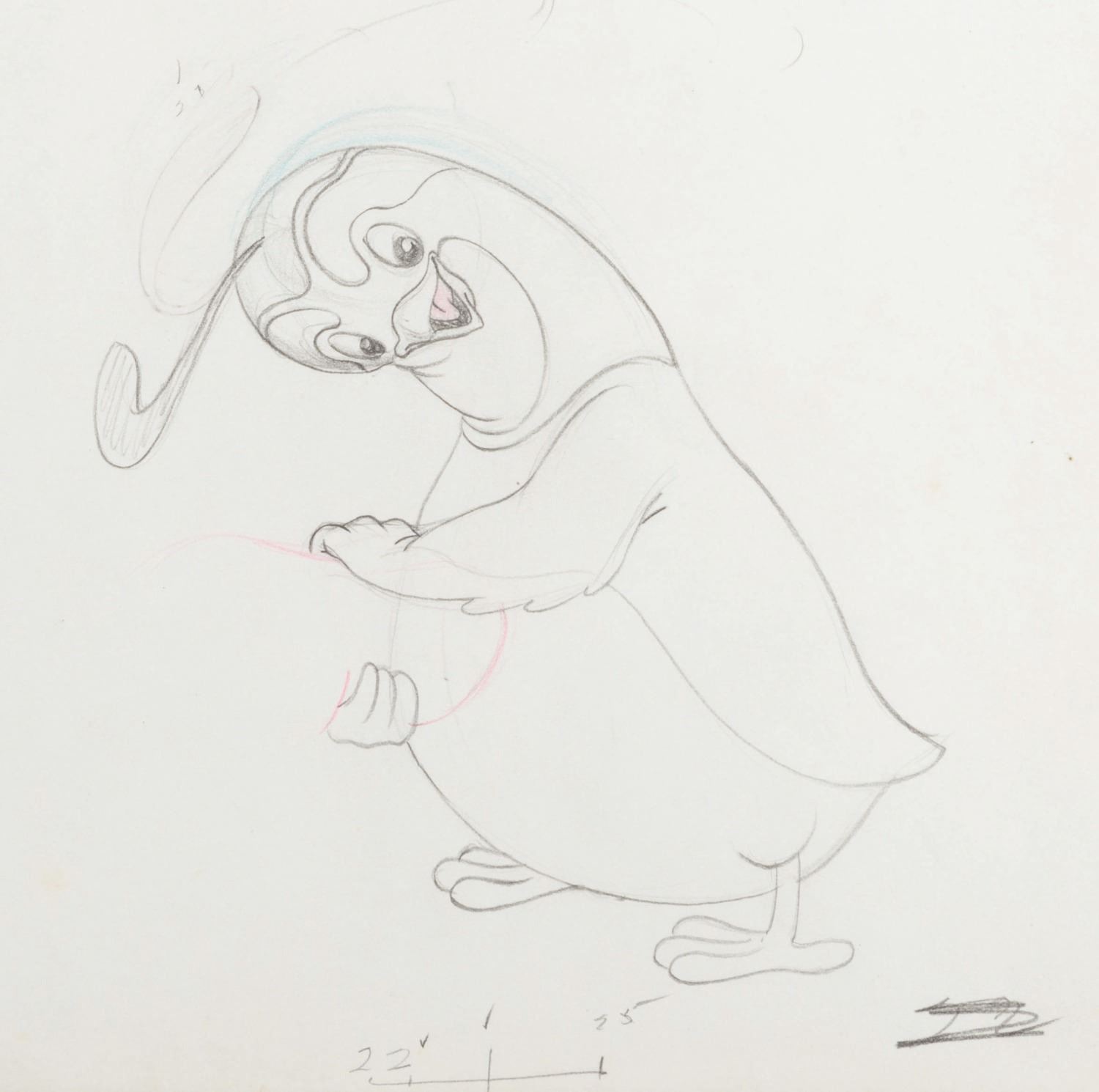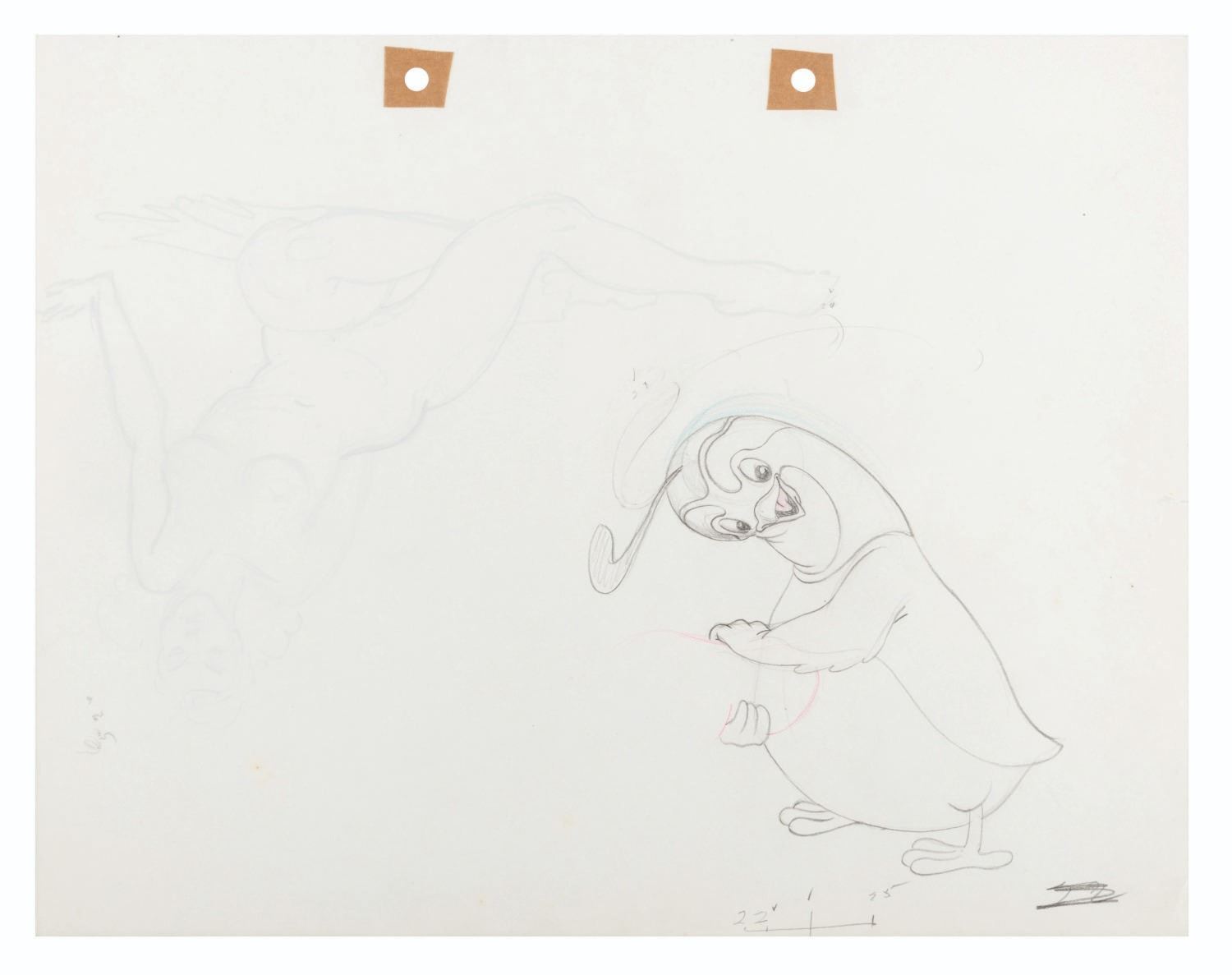 (Warner Bros., 1941) An original production drawing featuring the Quail from the Merrie Melodies short "The Crackpot Quail.” On the reverse of the drawing is a sketch of a nude model. With a character image size of 5” x 5” on 9.5” x 12” animation paper, the graphite drawing is in very good condition with light creases, spots of discoloration from age, and a 0.25” tear on the right side.