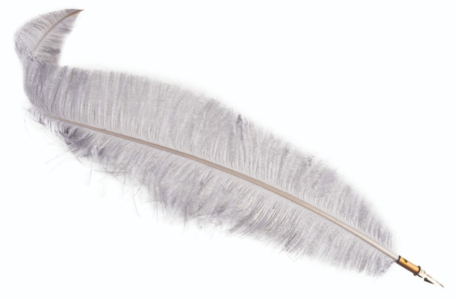 (Warner Bros., 2018) A grey feather quill prop from production of "Fantastic Beasts: The Crimes of Grindelwald.” These feather props were on the workers’ desks in the French Ministry of Magic sequence. Measuring 15” long, the curved quill prop displays in very good condition with typical wear from production use.