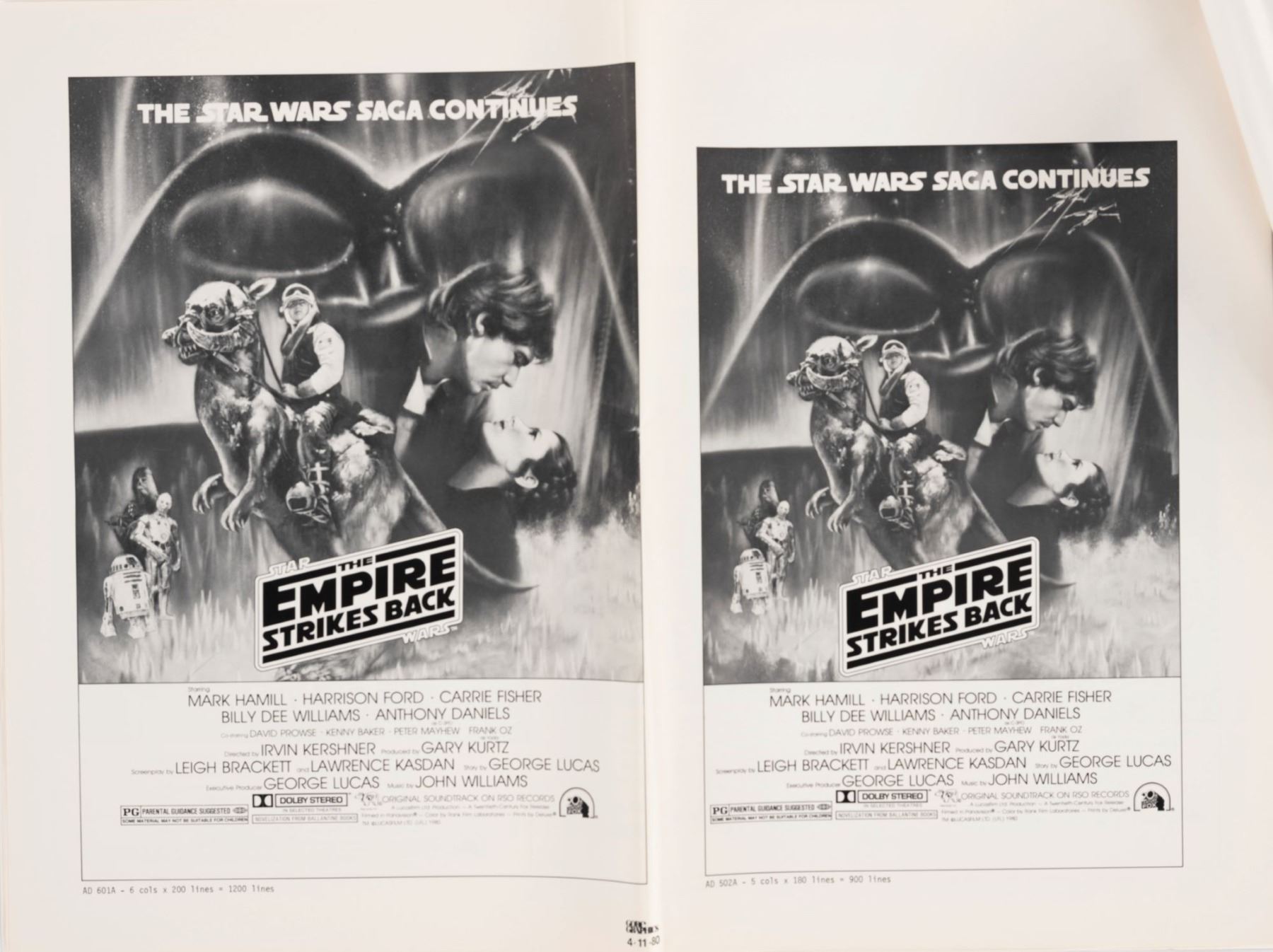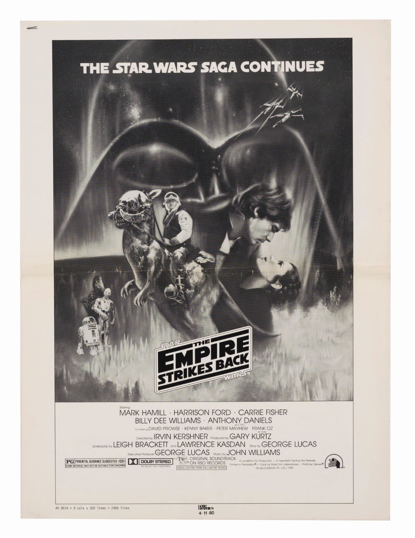 (20th Century Fox, 1980) A pressbook for "The Empire Strikes Back” with seven stapled pages of print advertisements in a range of sizes. Measuring 23” x 17”, the pressbook displays in good condition with light edge wear and creasing along the horizontal fold running the width of the center on all pages.