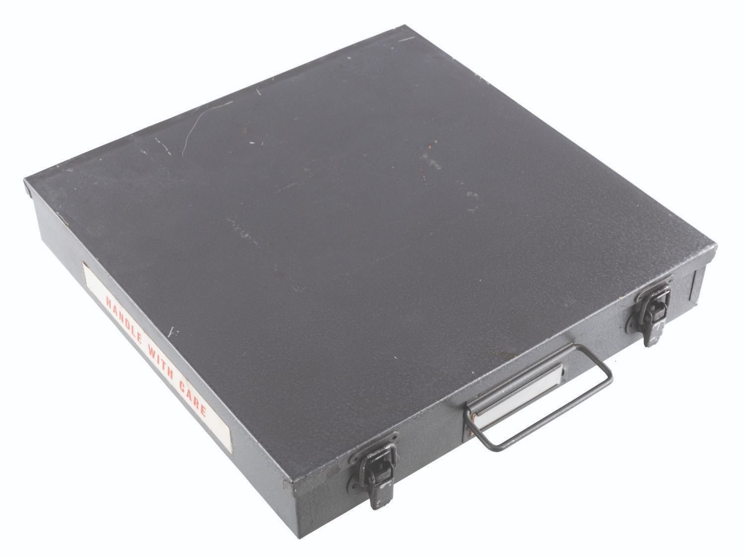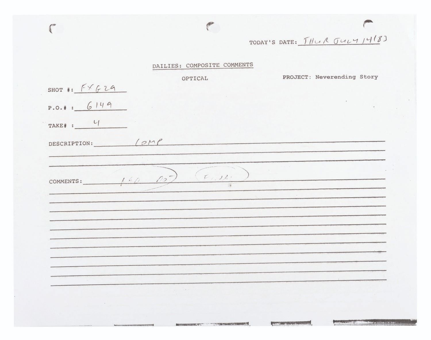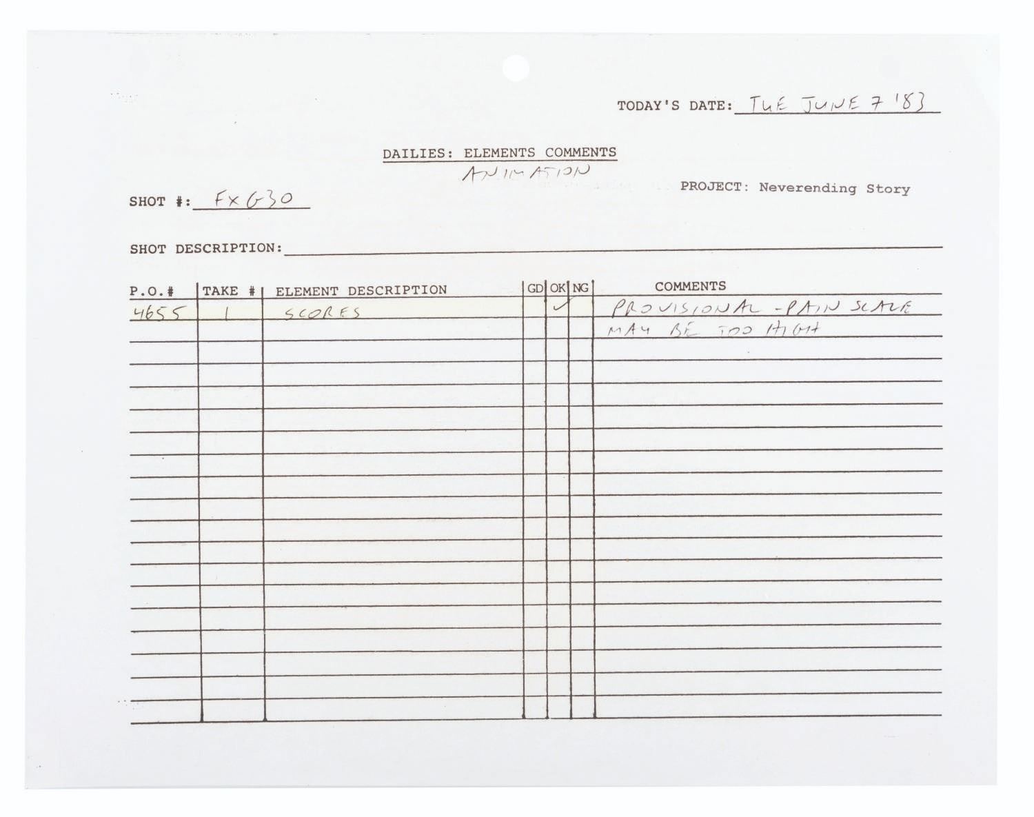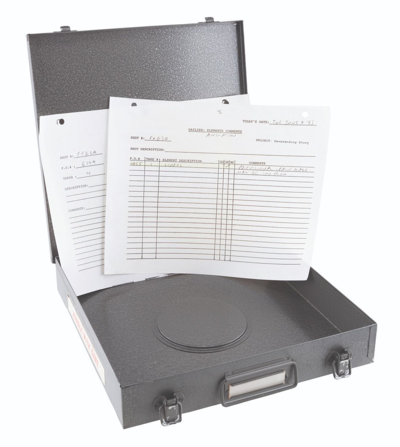 (Warner Bros., 1984) A VFX footage canister and two scene report documents dated June 7, and July 14, 1983, used in the production of "The Neverending Story.” Measuring 10.75” x 10.75” x 2” thick, the film canister is in good condition with light scratches, adhesive residue, and paint chips. The documents measure 8.5” x 11” and are in very good condition with light edge wear and creasing, and light discoloration from age.